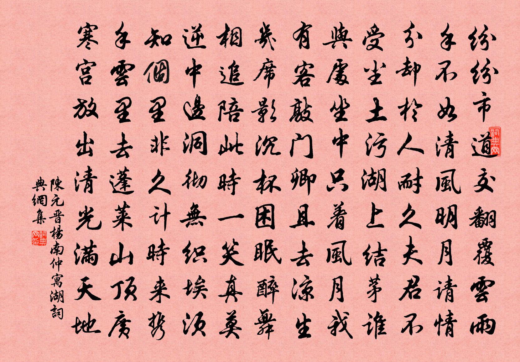 詩詞名句歷史字典書法欣賞書法字典國語詞典說文解字康熙字典古漢語字典標 題 作 者 詩 句 楊南仲寓湖作者:陳元晉 朝代:宋代楊南仲寓湖原文紛紛市道交,翻覆雲雨手。不如清風明月請,情分卻於人耐久。夫君不受塵土污,湖上結茅誰與處。坐中只著風月我,有客敲門卿且去。涼生幾席影沉杯,困眠醉舞相追陪。此時一笑真莫逆,中邊洞徹無織埃。須知個裡非久計,時來攜手雲里去。蓬萊山頂廣寒宮,放出清光滿天地。詩詞問答問:楊南仲寓湖的作者是誰?答:陳元晉問:楊南仲寓湖寫於哪個朝代?答:宋代陳元晉楊南仲寓湖書法欣賞楊南仲寓湖書法作品詩詞推薦紀事二十四首梁啓超〔清代〕眼中直欲無男子,意氣居然我丈夫。二萬萬人齊下拜,女權先到火奴奴。春晚訪鏡湖方乾貫休〔唐代〕幽居湖北濱,相訪值殘春。路遠諸峰雨,時多擉鱉人。蒸花初釀酒,漁艇劣容身。莫訝頻來此,伊余亦隱淪。客中思家趙孟堅〔宋代〕微風過處有清香,知是荼蘼隔短牆。相得故園成索寞,詩盟誰復為平章。漁父·浪花有意千里雪李煜〔五代〕浪花有意千里雪,桃花無言一隊春。一壺酒,一竿身,快活如儂有幾人。導引佚名〔宋代〕元符錫命,祗受慶誠明。恭館法三清。開基盛烈垂無極,金像儼天成。奉迎霞布甘泉仗,簫瑟振和聲。靈辰協吉鴻貴妃閣端午帖子許應龍〔宋代〕檻有榴花沼有蓮,南薰拂拂晚涼天。六宮莫度新翻曲,只理雲和伴舜弦。偈頌十七首釋智愚〔宋代〕船上無散工,駕御有方所。打篙底打篙,搖櫓底折櫓。觸浪迎風天地寬,去來不礙東西浦。屺瞻道中馬廷鸞〔宋代〕蓐食需明出遠村,筍輿咿軋睡昏昏。禾麻豐歲雲連畝,風露高秋水落痕。清曉跨鞍兒從父,當年戲彩母憐孫。白頭送春詞王涯〔唐代〕日日人空老,年年春更歸。相歡在尊酒,不用惜花飛。晚晴即事汪莘〔宋代〕君平簾外雨霏霏,寂寞何人識少微。怪得湖邊天色好,小舟爭載夕陽歸。會故人二首徐恢〔宋代〕江南江北每淹留,懶聽寒蟬噪暮秋。句里豈能窺鮑謝,暗中聊解識曹劉。清如老鶴翻秋露,快似神駒略九州。只恐太常引劉秉忠〔元代〕桃花流水鱖魚肥。青*笠,綠蓑衣。風雨不須歸。管甚做、人間是非。兩肩雲衲,一枝筇杖,盡日可忘機。之子欲淮南王晁說之〔宋代〕淮南王,解燒金,胡為黃葉落故林。神仙鼎氣覆千里,草木姿媚鍾磬音。誇誕之語恐難信,儻然安得我登臨。即今龔立道家藏虢月石屏敖陶孫〔宋代〕桑田鑒一奪,周官寒如灰。賜珏先淪奔,乃自垂棘胎。劫火到鹹陽,六國無珍材。空餘虢山在,蚌水相縈迴。古潭病牛李綱〔宋代〕耕犁千畝實千箱,力盡筋疲誰復傷?但得眾生皆得飽,不辭羸病臥殘陽。苦雨吟十首呈同官諸丈吳潛〔宋代〕正直三神列,慈悲一佛尊。須知真實念,是謂吉祥門。巨浸旋歸壑,頑雲漸散屯。更憑驅日馭,揮霍照乾坤。和梅摯北池十詠蔣堂〔宋代〕池上有孤島,影搖波底天。蓬壺欣彷佛,仙客得留連。岸草襯丹轂,灘薦隈畫船。羨君休瀚日,寄傲一尊前。端午帖子皇帝閣周必大〔宋代〕縷繒採藥謾區區,誰似君王用意殊。仁政便為醫國艾,德威那假辟兵符。新昌里姚合〔唐代〕舊客常樂坊,井泉濁而鹹。新屋新昌里,井泉清而甘。僮僕慣苦飲,食美翻憎嫌。朝朝忍飢行,戚戚如難堪。中下洞霄宮良泓孫副宮二首岳珂〔宋代〕養生須及早,器破輒難全。鑒止存心地,涵虛詠性天。寓言隨虢虢,至理本淵淵。玩物先觀象,如師況少年。名句推薦烽火城西百尺樓,黃昏獨上海風秋。王昌齡《從軍行七首》 向來冰雪凝嚴地,力斡春回竟是誰?陸游《落梅》 寒食後,酒醒卻咨嗟。蘇軾《望江南·超然台作》 酒濃春入夢,窗破月尋人。毛滂《臨江仙·都城元夕》 汀洲無浪復無煙,楚客相思益渺然。劉長卿《自夏口至鸚鵡洲夕望岳陽寄源中丞》 四海無閒田,農夫猶餓死。李紳《古風二首 / 憫農二首》 凡事當留餘地,得意不宜再往。朱柏廬《朱子家訓·全文》 機不密,禍先行。馮夢龍《醒世恆言·卷二十》 扁舟去作江南客,旅雁孤雲。朱敦儒《採桑子·彭浪磯》 樹大招風風撼樹,人為名高名喪人。吳承恩《西遊記·第三十三回》
