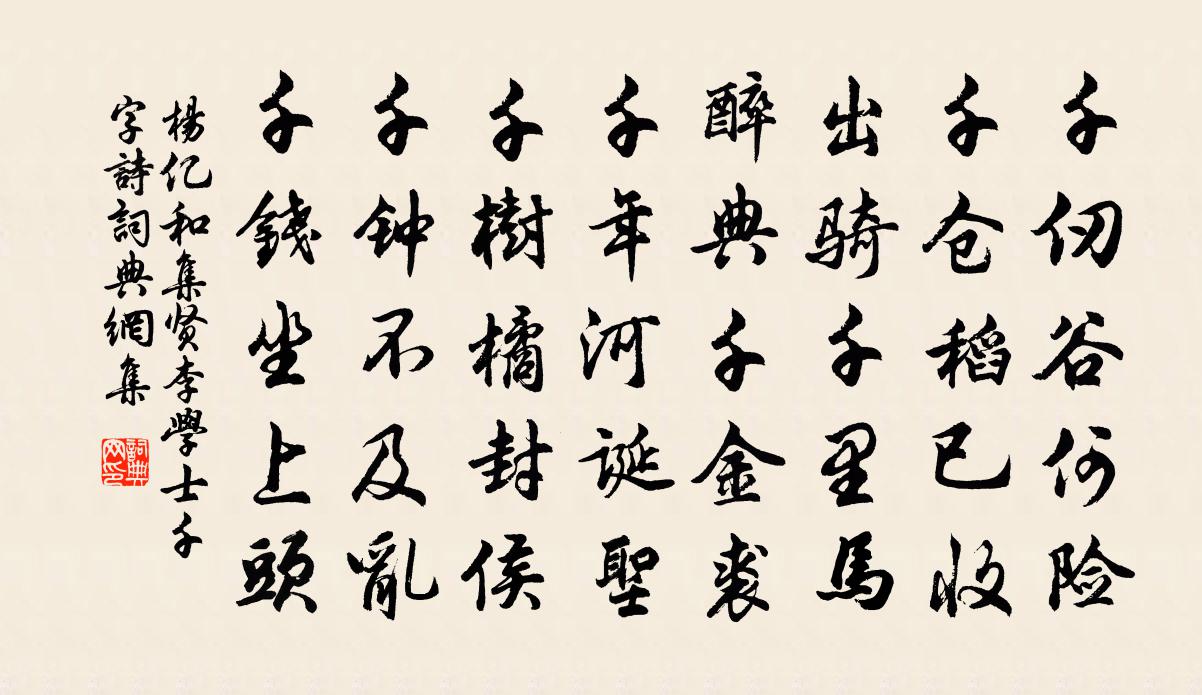 詩詞名句歷史字典書法欣賞書法字典國語詞典說文解字康熙字典古漢語字典標 題 作 者 詩 句 和集賢李學士千字詩作者:楊億 朝代:宋代和集賢李學士千字詩原文千仞谷何險,千倉稻已收。出騎千里馬,醉典千金裘。千年河誕聖,千樹橘封侯。千鐘不及亂,千錢坐上頭。詩詞問答問:和集賢李學士千字詩的作者是誰?答:楊億問:和集賢李學士千字詩寫於哪個朝代?答:宋代楊億和集賢李學士千字詩書法欣賞和集賢李學士千字詩書法作品詩詞推薦送花趙提刑張伯玉〔宋代〕蓬萊閣上牡丹開,盡日憑欄望外台。不敢登門謁樽酒,且教山仆送花來。題日出雨腳圖二首韓元吉〔宋代〕絕壑春林映綠,半山曉霧迷紅。長憶西岩夢覺,小舟欸乃聲中。送吳待制中復知潭州二首蘇洵〔宋代〕十年曾作犍為令,四脈嘗聞愍俗詩。共嘆才高堪御史,果能忠諫致戎麾。會稽特欲榮翁子,馮翊猶將試望之。船系古松歌莊南傑〔唐代〕山上山下松,森沈翠蓋煙。龜鱗犀甲鎖支體,泉聲雨腳洗春風。深碧麈尾掃冥濛,淺黃龍腹盤穹崇。拏天攫地數千顧野王讀書堆錢良臣〔宋代〕伊昔邊烽備不虞,太平移作梵王居。而今江表全無事,借我三椽更讀書。南蹌跧上人之平江俞桂〔宋代〕青浦相逢恰二年,今宵再會亦前緣。詩囊和月橫挑去,穩泛楓橋夜半船。憶內傅若金〔元代〕湘皋菸草碧紛紛,淚灑東風憶細君。浪說嫦娥能入月,虛傳神女解為雲。花陰晝坐閒金剪,竹里春遊冷翠裙。留得登楚州城楊萬里〔宋代〕望中白處日爭明,個是淮河凍作冰。此去中原三里許,一條玉帶界天橫。觀長安城圖陸游〔宋代〕許國雖堅鬢已斑,山南經歲望南山。橫戈上馬嗟心在,穿塹環城笑虜孱。日暮風煙傳隴上,秋高刁斗落雲間。三秦臘雪次遲韻蘇轍〔宋代〕冬儲久未辦,佳雪為人留。谷豆入高廩,薪蒸轉十輈。紛紛了歲事,閔閔念農疇。家有二頃田,一頃種米麰。風聲舊作感懷宗澤〔宋代〕關中黃壤黑壤,大是邦家利源。古者畝收十一,誰興歲取十千。不用府無虛月,藏之斯民裕然。歲晚楚亭集唐句黃彥平〔宋代〕百丈牽江色,連檣並米船。樵蘇喧晚渡,鷗鷺浴晴天。問舍慚元德,登樓憶仲宣。司存兼吏隱,雖有一山川。臨化絕句王氏女〔唐代〕玩水登山無足時,諸仙頻下聽吟詩。此心不戀居人世,唯見天邊雙鶴飛。句宋敏求〔宋代〕左川風俗美,資中亭上人。石南康輓詞樓鑰〔宋代〕家有春秋學,淵源更得師。風高蓋公舍,淚落蔡邕碑。官早終難進,才全竟弗施。遺編屬賢子,孝謹不應衰。減字木蘭花侯善淵〔元代〕初心奉道。謹守精嚴光返照。元始扶真。真物相生恍惚中。凝空落落。明月清風相倚托。達彼無憂。回首煙霞物外清貞褚道士攜羅丈唱和訪余求詩予非能詩者辭杜范〔宋代〕冀北奇才萬馬空,驚人佳句墨深濃。春風桃李人應識,要看寒溪澗底松。何武翼輓詞蘇籀〔宋代〕橫槊褫神佩,追隨井鉞軍。周旋圉徼最,首虜驛書聞。斡榷承心計,汙邪續力耘。門廬必高大,訓子擴儒文。除夜寄張達羅隱〔唐代〕梅花已著眼,竹葉況粘唇。只此留殘歲,那堪憶故人。亂罹書不遠,衰病日相親。江浦思歸意,明朝又一春。秋蝶白居易〔唐代〕秋花紫蒙蒙,秋蝶黃茸茸。花低蝶新小,飛戲叢西東。日暮涼風來,紛紛花落叢。夜深白露冷,蝶已死叢中。朝生名句推薦慎厥身,修思永。佚名《尚書·虞書·皋陶謨》 落日胡塵未斷,西風塞馬空肥。辛棄疾《木蘭花慢·席上送張仲固帥興元》 昔在零陵厭,神器若無依。何遜《行經孫氏陵》 水何澹澹,山島竦峙曹操《觀滄海》 江雨霏霏江草齊,六朝如夢鳥空啼。韋莊《台城》 阿婆還似初笄女,頭未梳成不許看。袁枚《遣興》 斑騅只系垂楊岸,何處西南任好風。李商隱《無題·鳳尾香羅薄幾重》 秀樾橫塘十里香,水花晚色靜年芳。蔡松年《鷓鴣天·賞荷》 幽人歸獨臥,滯慮洗孤清。張九齡《感遇十二首》 三過平山堂下,半生彈指聲中。蘇軾《西江月·平山堂》