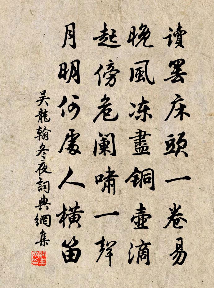 詩詞名句歷史字典書法欣賞書法字典國語詞典說文解字康熙字典古漢語字典標 題 作 者 詩 句 冬夜作者:吳龍翰 朝代:宋代冬夜原文讀罷床頭一卷易,晚風凍盡銅壺滴。起傍危闌嘯一聲,月明何處人橫笛。詩詞問答問:冬夜的作者是誰?答:吳龍翰問:冬夜寫於哪個朝代?答:宋代吳龍翰冬夜書法欣賞冬夜書法作品詩詞推薦送郭定夫往江西二首陳藻〔宋代〕去年誤作送君詩,卻又論文得幾時。今日溪邊成話別,榮歸早赴北堂期。鷓鴣天周紫芝〔宋代〕讀盡牙籤玉軸書。不知門外有園蔬。借令未解鑾坡去,也合讎書在石渠。微雨後,小寒初。滿斟長壽碧琳腴。不須紹興十四年奉上徽宗冊實三首真宗〔宋代〕於鑠徽考,如天莫名。迨茲丕揚,擬純粹精。溫玉鏤文,來至於祊。有嚴奕奕,禮備樂成。貽韋鍊師儲光羲〔唐代〕精思莫知日,意靜如空虛。三鳥自來去,九光遙卷舒。新池近天井,玉宇停雲車。余亦苦山路,洗心祈道書。玉蝴蝶(和梁才甫遊園作)王安中〔宋代〕御水縠紋風皺,畫橋橫處,沙路晴時。曲塢藏春,朱戶翠竹參差。過牆花、嬌無限思,籠檻柳、低不勝垂。海棠枝送石師正強至〔宋代〕馬蹄南出都門路,行客少年春色暮。花片空隨別盞飛,柳條難系征鞍住。諸友遲留待雪再用韻李曾伯〔宋代〕護風須飲劇,待雪拚眠遲。舉席俱佳客,揮毫盡好詩。冷薌梅畔覺,清響竹間知。莫憶征鞍夢,從渠月下支。對酒陸游〔宋代〕老子不堪塵世勞,且當痛飲讀離騷。此身幸已免虎口,有手但能持蟹螯。牛角掛書何足問,虎頭食肉亦非豪。天寒病鶴篇錢起〔唐代〕獨鶴聲哀羽摧折,沙頭一點留殘雪。三山侶伴能遠翔,五里裴回忍為別。驚群各畏野人機,誰肯相將霞水飛。不及謝饒計使遣餉頭貢余趙汝騰〔宋代〕仙芽龍水辦頭綱,百草山中不敢香。表進得陪華使拜,貢余遣餉守臣嘗。擬思苦口陳忠諫,可但飴茶獻上方。分我會嚴陵邵德芳同舍邀宿玄同齊道舊有作林景熙〔宋代〕市槐夢忽醒,喬柯落風雨。何人斧為薪,遺根尚依土。緬懷赤煒初。郁若翠蛟舞。其下有橋門,雍雍冠帶聚。萬物跋符發所錄上蔡語楊萬里〔宋代〕偶看上蔡先生語,繭足擔簦學北方。不是澹庵謫南海,姓名那得許芬香。寄劉禹錫戴叔倫〔唐代〕謝相園西石徑斜,知君習隱暫為家。有時出郭行芳草,長日臨池看落花。春去能忘詩共賦,客來應是酒頻賒。五年覆杯池楊修〔宋代〕金杯覆處舊池枯,此後還曾一醉無。東晉中興股肱力,元皇也學管夷吾。侯荊曾鞏〔宋代〕侯蠃夷門白髮翁,荊軻易水奇節士。偶邀禮數車上足,暫飽腥羶館中侈。師回拔劍不顧生,酒酣拂衣亦送死。磊落菩薩蠻郭應祥〔宋代〕未觀岩桂先觀菊。世間底事真遲速。節物苦相催。重陽便到來。白衣何處覓。沽酒邀佳客。一笑有餘歡。官居終日崇禧夜坐劉宰〔宋代〕淮浙千萬山,茲山鍾秀異。山中四時好,雪景更佳耳。危登俯八荒,豈無超詣士。春遊眩紅紫,秋賞挹蒼翠。沖寒觀飼魚韓維〔宋代〕群魚戲清川,容貌甚融易。投餌落其間,紛鄒忽無次。其來若有召,貪吻動如沸。波間互出沒,似亦夸巧智。警跳句潘大臨〔宋代〕思君帶孔移。癸未至節以病晚起走筆戲書紀事排悶十首方回〔宋代〕過節何其窘,治家乃爾難。谷生舂苦碎,薪貴灶嫌寬。病體危狼狽,時情畏觸蠻。擁衾聞客至,強整舊衣冠。名句推薦勢有不可得,事有不可成。韓非及後人《韓非子·觀行》 淡雲孤雁遠,寒日暮天紅。徐昌圖《臨江仙·飲散離亭西去》 荻花秋,瀟湘夜,橘洲佳景如屏畫。李珣《漁歌子·荻花秋》 闌乾風冷雪漫漫,惆悵無人把釣竿。姜夔《釣雪亭》 不求同日生,只願同日死。施耐庵《水滸傳·第二回》 舉頭紅日近,回首白雲低。寇準《詠華山》 奇文共欣賞,疑義相與析。陶淵明《移居二首》 向淺洲遠渚,亭亭清絕。張炎《疏影·詠荷葉》 步從容,立端正。揖深圓,拜恭敬。李毓秀《弟子規·謹》 目送征鴻飛杳杳,思隨流水去茫茫。孫光憲《浣溪沙·蓼岸風多橘柚香》