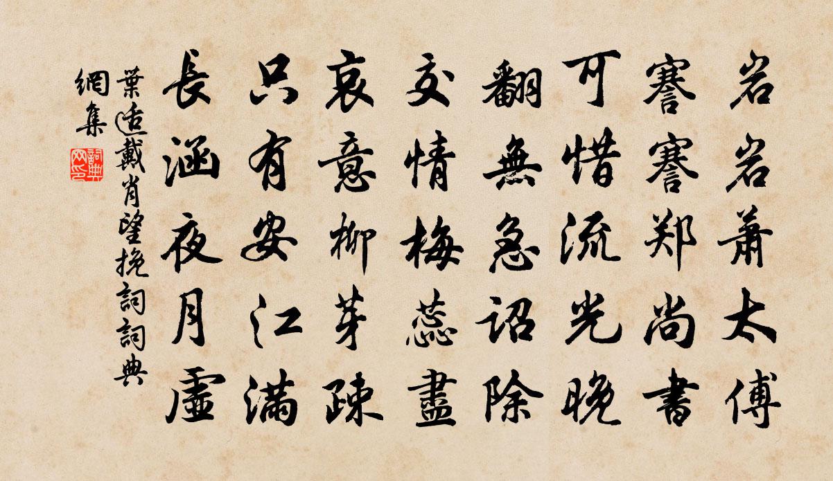 詩詞名句歷史字典書法欣賞書法字典國語詞典說文解字康熙字典古漢語字典標 題 作 者 詩 句 戴肖望輓詞作者:葉適 朝代:宋代戴肖望輓詞原文岩岩蕭太傅,謇謇鄭尚書。可惜流光晚,翻無急詔除。交情梅蕊盡,哀意柳芽疎。只有安江滿,長涵夜月虛。詩詞問答問:戴肖望輓詞的作者是誰?答:葉適問:戴肖望輓詞寫於哪個朝代?答:宋代葉適戴肖望輓詞書法欣賞戴肖望輓詞書法作品詩詞推薦和胡方湖雪韻王義山〔宋代〕 * 粒米撒天葩,山色模糊未盡遮。月斧鑿天飛下屑,風力翦水簇成花。有時覓句尋歐約,不慣斟羔學党家。呵手臨別瓜州王令〔宋代〕十年來往常依依,此日復去來何時。青山有意退弗忍,白髮不逢歸未遲。乾坤不盡萬里望,草木無限西風悲。塵纓南郊回仗唐觀〔宋代〕傳警千門寂,南郊彩仗回。但驚龍再見,誰識日雙開。德澤施雲雨,恩光變燼灰。閱兵貔武振,聽樂鳳凰來。謝惠楊梅朱翌〔宋代〕杭州金氏越州楞,撒火飛星五月春。百果若重推貢士,風流應不下平津。贈醫士嚴嘉謀〔宋代〕脈差死活懸三指,炙誤風攣廢四肢。寧餌生金餐野葛,有身不可試庸醫。秋懷十首韓元吉〔宋代〕城外秋荷一半黃,尚余疏柳照回塘。江南底許風光好,塞雁來時未有霜。頌古十五首釋慧遠〔宋代〕電卷星飛,珠回玉轉。打破麵皮,赤心片片。送程給事知越州韓鐸〔宋代〕青瑣身榮故國遙,除書催下紫宸朝。金籯舊學辭仙殿,玉帳新兵擁使橈。閣上雲山圍畫壁,軍中鼓角戰江潮。珠璣送職方張員外領荊湖北漕宋庠〔宋代〕粉闥仙郎鬢未秋,懿文精力允僉求。新榮毫忌祠神館,更按喬卿露冕州。楚匭貢茅紛騎置,蜀艘移粟蔽江流。富人天門謠賀鑄〔宋代〕牛諸天門險,限南北七豪雄占。清霧斂,與閒人登覽。待月上潮平波灩灩。塞管輕軟新阿濫。風滿檻,歷歷數西州送山甫赴嶺口倉五言二首劉克莊〔宋代〕鄉近多安訊,時清少急符。故人問郎罷,臥起一筇扶。謁金門劉仲尹〔元代〕簾半。四座綠圍紅簇。歌盡玉台連夜燭。歡緣仍恨促。休唱蓮舟新曲。煙水畫船搖綠。腸斷鴛鴦三十六。紫蒲相姜總管輓詞樓鑰〔宋代〕及見開元盛,曾聞正始音。雕蟲徒壯歲,冠鶡豈初心。論事風生席,疏恩帶錫金。精神空滿腹,愁絕病沈沈。禪人寫真求贊釋正覺〔宋代〕一色功回,雷雲凍開。萬機俱罷,風月轉夜。空空谷有神,欣欣木有春,而今何處不分身。皇甫岳雲溪雜題五首。鸕鶿堰王維〔唐代〕乍向紅蓮沒,復出清蒲颺。獨立何褵褷,銜魚古查上。寄范伯達朱翌〔宋代〕薰風永日一簾垂,剝芡從容待晚炊。舉白且看邊引滿,汗青肖和嘆無期。晝思夜夢人非遠,客附書來喜可知。千里次和杉棚舒岳祥〔宋代〕上伏清涼散,家僮手自成。日斜蛟弄影。風過鼠行聲。解助藤床冷,何妨棐幾明。風車鄭冰雪,得似此般清。木蘭花(林鐘商)張先〔宋代〕西湖楊柳風流絕。滿樓青春看贈別。牆頭簌簌暗飛花,山外陰陰初落月。秦姬穠麗雲梳發。持酒唱歌留晚發。驪駒和靈一上人新泉劉長卿〔唐代〕東林一泉出,復與遠公期。石淺寒流處,山空夜落時。夢閒聞細響,慮澹對清漪。動靜皆無意,唯應達者知。總題葛紹體〔宋代〕塘曲椒和桑共老,山頭松與麥齊青。人家歲計村南北,似識豳風舊典刑。名句推薦亭亭畫舸系春潭,直到行人酒半酣。鄭文寶《柳枝詞》 白骨如山忘姓氏,無非公子與紅妝。曹雪芹《紅樓夢·第八回》 台榭空濛煙柳暗,白鳥銜魚欲舞。納蘭性德《摸魚兒·午日雨眺》 林外鳴鳩春雨歇,屋頭初日杏花繁。歐陽修《田家》 吳宮花草埋幽徑,晉代衣冠成古丘。李白《登金陵鳳凰台》 樂遊原上清秋節,鹹陽古道音塵絕。李白《憶秦娥·簫聲咽》 清風明月無人管,並作南樓一味涼。黃庭堅《鄂州南樓書事》 風流才子多春思,腸斷蕭娘一紙書。楊巨源《崔娘詩》 故國梅花歸夢,愁損綠羅裙。孔夷《南浦·旅懷》 守經事而不知其宜,遭變事而不知其權。司馬遷《史記·太史公自序》