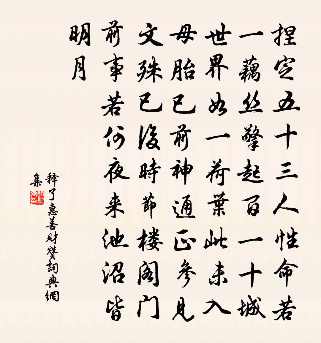 詩詞名句歷史字典書法欣賞書法字典國語詞典說文解字康熙字典古漢語字典標 題 作 者 詩 句 善財贊作者:釋了惠 朝代:宋代善財贊原文捏定五十三人性命若一藕絲,擎起百一十城世界如一荷葉。此未入母胎已前神通,正參見文殊已後時節。樓閣門前事若何,夜來池沼皆明月。詩詞問答問:善財贊的作者是誰?答:釋了惠問:善財贊寫於哪個朝代?答:宋代釋了惠善財贊書法欣賞善財贊書法作品詩詞推薦和三鄉詩李縞〔唐代〕會稽王謝兩風流,王子沉淪謝女愁。歸思若隨文字在,路傍空為感千秋。禪人並化主寫真求贊釋正覺〔宋代〕默默神澄,稜稜氣清。河漢之月耿耿而不夜,蒹葭之風淒淒而有聲。相逢便說無生話,萬像森羅作證明。每見王太丞邑事甚冗而剸劇之暇猶能過訪山館王安石〔宋代〕我看繁訟頻搔首,君富才明見亦常。尚有閒襟尋水石,更留佳句似池塘。松苗地合分高下,鳧鶴天教有短長。徐上再次韻十首陳造〔宋代〕進業湖海窄,取名絲縷輕。因君論前輩,衛道有金城。潢潦先知本,機緘貴用情。靈台與秋日,炯燭古今明。歸田詩庾信〔南北朝〕務農勤九榖。歸來嘉一廛。穿渠移水碓。燒棘起山田。樹陰逢歇馬。魚潭見酒船。苦李無人摘。秋瓜不直錢。社雞范至能游靈石錄示詩仙留題雲李洪〔宋代〕雨後泉淙水樂,詩成目送孤雲。寄興西湖南北,忘年丘壑松筠。游爛柯山趙湘〔唐代〕仙人與王質,相會偶多時。落日千年事,空山一局棋。樹高明月在,風動白雲移。未得酬身計,閒來學采芝。和薛察院同龍門知縣劉大著洎數公禹廟留題魏野〔宋代〕七人廟下立徘徊,相顧閒心幾欲摧。落日堪傷四散去,再來難得一齊來。春曉汪莘〔宋代〕曉來雨初晴,天宇淨如拭。隔籬見花柳,春氣亂五色。東君渾不管,但為閒者得。我方獵鵾鵬,溟南復溟北。江邊星月二首杜甫〔唐代〕驟雨清秋夜,金波耿玉繩。天河元自白,江浦向來澄。映物連珠斷,緣空一鏡升。餘光隱更漏,況乃露華凝。江月晨炊翫鞭亭二首楊萬里〔宋代〕問著無聲是阿兄,坐看家賊只吞聲。戮屍大放經綸手,長柄判將鍚茂弘。緣識宋太宗〔宋代〕恤刑遍空於囹圄,八面調順興時雨。我且慚無及物功,哀哉獄訟經炎暑。清涼坐起受官榮,幾許能仁善規矩。倏忽次韻子高即事黃庭堅〔宋代〕詩禮不忘它日問,文章未覺古人疏。青雲自致屠龍學,白首同歸種樹書。綠葉青陰啼鳥下,遊絲飛絮落花余。無因【中呂】滿庭芳_風塵艷娃,佚名〔元代〕風塵艷娃,堪題堪詠,堪羨堪夸。朱唇檀口些娘大,臉襯桃花。理冰弦纖纖銀甲,步香塵窄窄刀麻。天生下,溫柔凱歌十首呈賈樞使劉克莊〔宋代〕東南立國惟王謝,西北籌邊只范韓。公不袞衣假黃鉞,吾能右衽更巍冠。西湖雪後趙蕃〔宋代〕行到湖邊卻筍輿,眼中渾似畫屏紆。梅花又作臨風笑,亦有高人似舊無。李翬知縣作亭西湖上,余用東坡語名之曰飲綠范成大〔宋代〕芷葺蓮巢喚客游,蘆鞭席帽為君留。未論吹水堪添酒,且要移床學枕流。乍霽卻陰梅釀雨,暫暄還冷麥催秋。石湖次韻明仲幽居春來十首劉子翬〔宋代〕莫遣瀟湘雙鯉來,歸心生怕曉禽催。咄嗟新轉渠渠屋,寒士歡顏正爾開。暖轎孔武仲〔宋代〕垂簾為戶竹為輿,千里征行似宴居。達摩無心惟穩坐,倪寬已老更耽書。蝸牛蘇軾〔宋代〕腥涎不滿殼,聊足以自濡。升高不知回,竟作粘壁枯。名句推薦自憐人憐,自棄人棄。心無滯礙,害不侵矣。來俊臣《羅織經·保身卷第七》 閒雲潭影日悠悠,物換星移幾度秋。王勃《滕王閣序》 三教於是乎可一矣。王通《中說·卷五·問易篇》 黃河九天上,人鬼瞰重關。元好問《水調歌頭·賦三門津》 檐流未滴梅花凍,一種清孤不等閒。鄭燮《山中雪後》 商女不知亡國恨,隔江猶唱後庭花。杜牧《泊秦淮》 世事浮云何足問,不如高臥且加餐。王維《酌酒與裴迪》 丞相祠堂何處尋,錦官城外柏森森。杜甫《蜀相》 今宵樓上一尊同。雲濕紗窗。辛棄疾《一剪梅·中秋元月》 不愁屋漏床床濕,且喜溪流岸岸深曾幾《蘇秀道中》