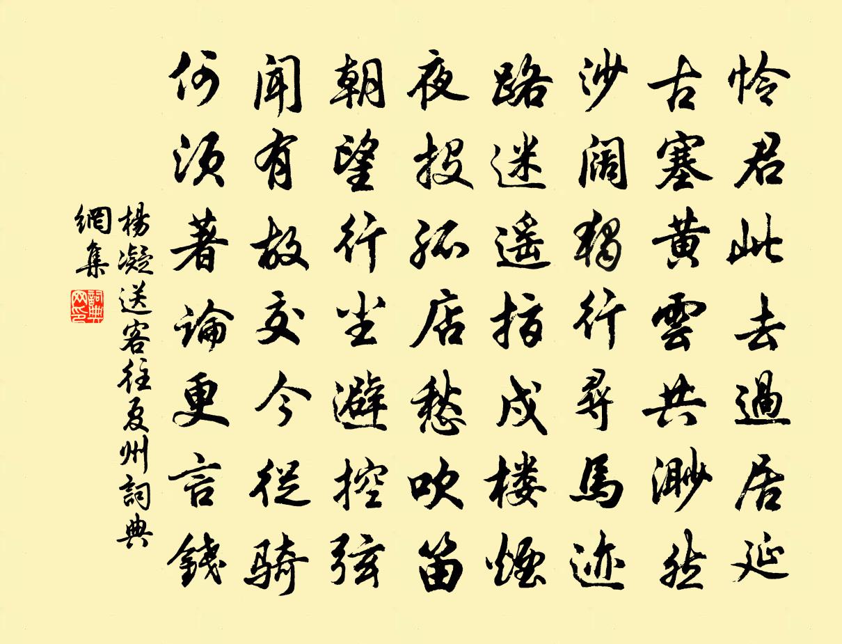 詩詞名句歷史字典書法欣賞書法字典國語詞典說文解字康熙字典古漢語字典標 題 作 者 詩 句 送客往夏州作者:楊凝 朝代:唐代送客往夏州原文憐君此去過居延,古塞黃雲共渺然。沙闊獨行尋馬跡,路迷遙指戍樓煙。夜投孤店愁吹笛,朝望行塵避控弦。聞有故交今從騎,何須著論更言錢。詩詞問答問:送客往夏州的作者是誰?答:楊凝問:送客往夏州寫於哪個朝代?答:唐代問:送客往夏州是什麼體裁?答:七律楊凝送客往夏州書法欣賞送客往夏州書法作品注釋全唐詩:卷290_17詩詞推薦昭君怨(一作董思恭詩)佚名〔唐代〕新年猶尚小,那堪遠聘秦。裾衫沾馬汗,眉黛染胡塵。舉眼無相識,路逢皆異人。唯有梅將李,猶帶故鄉春。西江月楊無咎〔宋代〕態度雪香花瘦,情懷雨潤雲溫。故將淡墨寫精神。記得洗妝餘暈。只恐妖嬈未似,誰雲彼此難分。別來憔悴不堪論詠史五首其三夏後氏范仲淹〔宋代〕景命還將伯益傳,九川功大若為遷。謳歌終在吾君子,豈是當時不讓賢。寒泉董嗣杲〔宋代〕照膽寒泓覆有亭,此泉曾入老坡評。八詩最得吟梅苦,一盞能消薦菊清。不拜韜光徵士詔,卻傳配食水仙名。銀床書屋壁陸游〔宋代〕鳥道經行穩,巢居臥起寬。鹿衣裁短褐,龜屋制危冠。舊慕嵇中散,今師靖長官。蛟龍雲雨上,未必勝泥蟠。過洛陽贈親舊晁說之〔宋代〕古來無奈洛陽塵,興屬今朝誰與親。河嶽新秋初過雁,園林曉月遠行人。波聲有喜鹹通汴,雲影相隨直到秦。白筍舟中讀元九詩白居易〔唐代〕把君詩卷燈前讀,詩盡燈殘天未明。眼痛滅燈猶暗坐,逆風吹浪打船聲。柳梢青楊無咎〔宋代〕江月軒中。拍堤新漲,繞院薰風。深注瑤觴,低歌金縷,聲在晴空。新詞盡索無窮。斷酩酊、衰顏為紅。願得年年奉和隨王殿下詩 七謝朓〔南北朝〕玄冬寂修夜。天圍靜且開。亭皋霜氣愴。松宇清風來。高琴時以思。幽多多感懷。幸藉汾陽想。嶺首一些徘徊。劉文潛來晁公溯〔宋代〕虛亭而雨潤,高林來風聲。之子適過我,氣與秋爭清。胸次冰壺寒,舌端河漢傾。仰摩玉宇蒼,真是金天晶。使我偈公六十五首釋鹹傑〔宋代〕雖與我同條生,不與我同第死。稔聞在七閩,揚塵兼簸土。凌茂宗風不奈何,今朝喜見清平路。燕城讀史羅公升〔宋代〕遼佐遣戍函谷舉,平懷構兵江都亡。秦隋失道自速死,可是東海真不祥。春行武關作雍陶〔唐代〕風香春暖展歸程,全勝遊仙入洞情。一路緣溪花覆水,不妨閒看不妨行。衰病陸游〔宋代〕病除猶老健,雨止得冬晴。覓句嗟心在,鈔書試眼明。朝寒添布褐,晚步出柴荊。外慕終無益,兒曹且力耕。題通妙亭柱胡仲弓〔宋代〕小亭存古意,雅稱道家風。澉水鴨頭綠,山茶鶴頂紅。內丹還九轉,法鼓叩三通。若問希夷事,檐鈴語未終。題柳溫庭筠〔唐代〕楊柳千條拂面絲,綠煙金穗不勝吹。香隨靜婉歌塵起,影伴嬌嬈舞袖垂。羌管一聲何處曲,流鶯百囀最高枝。千門早行二絕葛立方〔宋代〕屈指雲程路尚賒,脂車秣馬鬧棲鴉。夢魂正入無何有,誰首長鉤惱睡蛇。烏夜啼石孝友〔宋代〕瀟湘雨打船篷。別離中。愁見拍天滄水、攪天風。留不住。終須去。莫匆匆。後夜一尊何處、與誰同。訾家洲二首劉克莊〔宋代〕來訪唐時事,荒洲暮靄青。遍生新草棘,難認舊池亭,毀記欺無主,存祠怕有靈。今人輕古蹟,此地少曾經。裴柳輪台子(中呂調)柳永〔宋代〕霧斂澄江,煙消藍光碧。彤霞衫遙天,掩映斷續,半空殘月。孤村望處人寂寞,聞釣叟、甚處一聲羌笛。九凝山畔名句推薦新帖繡羅襦,雙雙金鷓鴣。溫庭筠《菩薩蠻·小山重疊金明滅》 庶人莫與官爭,貴人不結人怨。來俊臣《羅織經·保身卷第七》 待何年歸去,談笑各爭雄。顧太清《高山流水·次夫子清風閣落成韻》 來如風雨,去似微塵。佚名《增廣賢文·上集》 送君如昨日,檐前露已團。江淹《古離別》 想見廣寒宮殿,正雲梳風掠。辛棄疾《好事近·中秋席上和王路鈐》 簫鼓喧,人影參差,滿路飄香麝。周邦彥《解語花·上元》 柔條紛冉冉,葉落何翩翩。曹植《美女篇》 不管三七二十一馮夢龍《醒世恆言·卷一》 人有所好,以好誘之無不取,人有所懼,以懼迫之無不納。來俊臣《羅織經·治下卷第三》