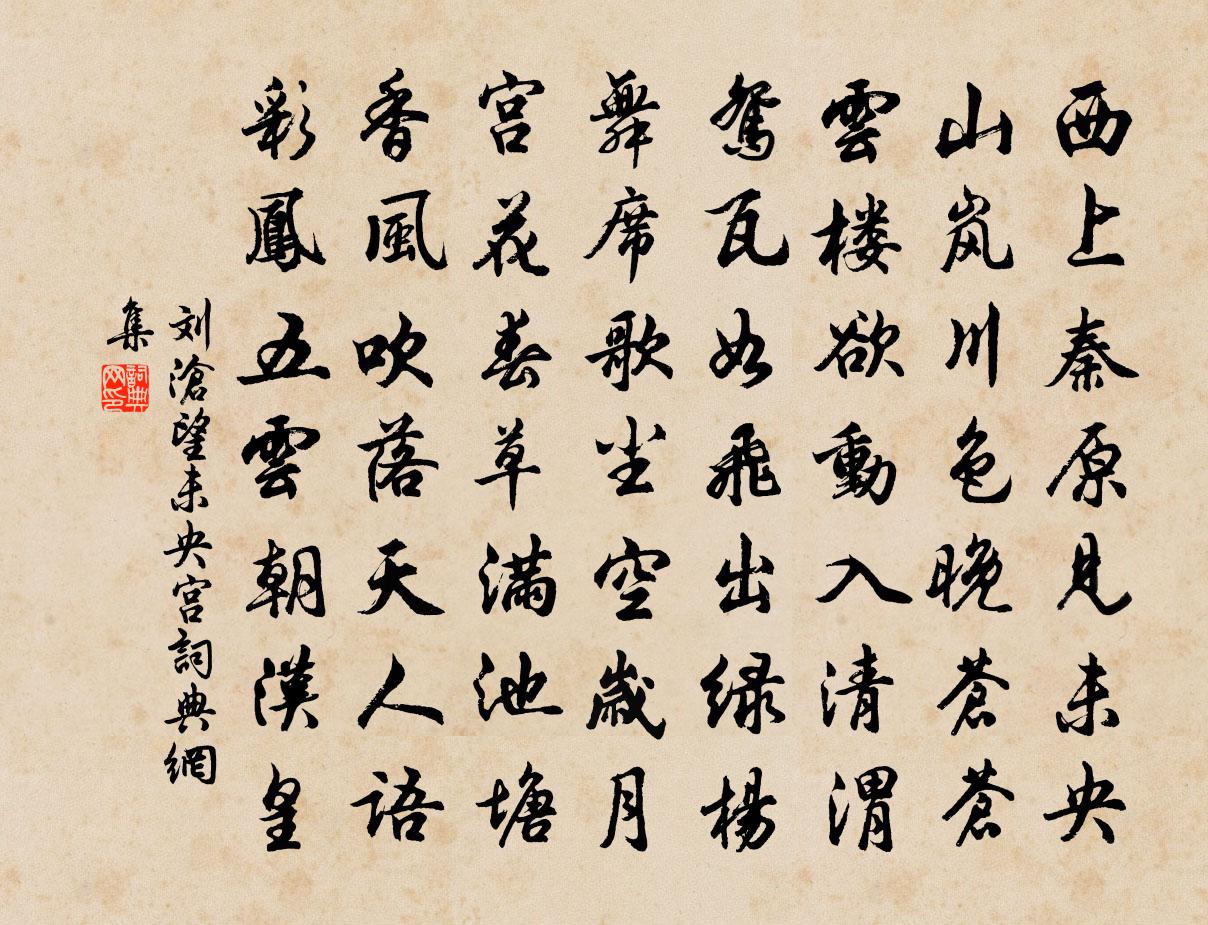 詩詞名句歷史字典書法欣賞書法字典國語詞典說文解字康熙字典古漢語字典標 題 作 者 詩 句 望未央宮作者:劉滄 朝代:唐代望未央宮原文西上秦原見未央,山嵐川色晚蒼蒼。雲樓欲動入清渭,鴛瓦如飛出綠楊。舞席歌塵空歲月,宮花春草滿池塘。香風吹落天人語,彩鳳五雲朝漢皇。詩詞問答問:望未央宮的作者是誰?答:劉滄問:望未央宮寫於哪個朝代?答:唐代問:望未央宮是什麼體裁?答:七律劉滄望未央宮書法欣賞望未央宮書法作品注釋全唐詩:卷586-67詩詞推薦冬日融州絕句陳藻〔宋代〕四隻漁般叩板木,幾家茅屋長兒孫。天寒水淺江成路,地僻人稀郭賽村。贈雲峰演庵主李昴英〔宋代〕一庵移向白雲堆,檜柏參天少日栽。頗怪發如金線樣,想曾眼見鐵橋來。佛粘土壁煎茶供,客對 * 取芋煨。卻笑搗帛石李廌〔宋代〕婺女織玄綃,欲作六銖衣。空山搗寒月,傳聲徹雲閨。可笑綺縠女,不識砧與機。吾黨與佛會陳著〔宋代〕我惜蘇子瞻,氣豪天地隘。雄文萬斛泉,盛名表昭代。自負學見道,欲漲歐陽派。胡為所以學,先與本論背。或者論語絕句一百首張九成〔宋代〕常追往日悔前事,復向如今念後來。幸爾平生無所好,喜於末句絕纖埃。詠春幡溫庭筠〔唐代〕閒庭見早梅,花影為誰栽。碧煙隨刃落,蟬鬢覺春來。代郡嘶金勒,梵聲悲鏡台。玉釵風不定,香步獨徘徊。次韻酬孫艮齋三首楊公遠〔宋代〕抱膝孤吟欠范模,原隨雞犬藉丹爐。儻能化得塵凡骨,差勝無聲水墨圖。長相思(佳人)李石〔宋代〕花深紅。花淺紅。桃杏淺深花不同。年年吹暖風。鶯語中。燕語中。喚起碧窗春睡濃。日高花影重。宿無相寺李白〔唐代〕頭陀床懸萬仞,床遠眺望華床峰。聊借金沙水,洗開九芙蓉。煙嵐隨遍覽,踏屐走雙龍。明日登高去,山僧孰與從依韻和范三登淮亭張耒〔宋代〕身如客雁寄汀洲,北望休登王粲樓。殘雪朔風驚歲晚,早梅新柳動春愁。免遭斤斧甘無用,敢向波濤較善游。奔走古風其十八李白〔唐代〕天津三月時。千門桃與李。朝為斷腸花。暮逐東流水。前水復後水。古今相續流。新人非舊人。年年橋上游。雞鳴減字木蘭花(甲午九日午山作)劉辰翁〔宋代〕舊遊山路。落在秋陰最深處。風雨重陽。無蝶無花更斷腸。天知老矣。莫累門生與兒子。不用登高。高處風吹帽不裴常侍以題薔薇架十八韻見示因廣為三十韻以和之白居易〔唐代〕托質依高架,攢花對小堂。晚開春去後,獨秀院中央。霽景朱明早,芳時白晝長。濃因天與色,麗共日爭光。剪碧八月十五日夜同諸客玩月白居易〔唐代〕月好共傳唯此夜,境閒皆道是東都。嵩山表里千重雪,洛水高低兩顆珠。清景難逢宜愛惜,白頭相勸強歡娛。誠知雜曲歌辭。盧女曲崔顥〔唐代〕二月春來半,宮中日漸長。柳垂金屋暖,花覆玉樓香。拂匣先臨鏡,調笙更炙簧。還將盧女曲,夜夜奉君王。宣妙墳院古柏衛宗武〔宋代〕古來喬木產墓宅,新甫之儔匪凡質。風梳雨沐三百年,聳壑昂霄過千尺。孤標屹立獨擎天,繁柯偏重常傾日。蒼皮北園酌酒觀鶴李壁〔宋代〕仰看翔翮俯游鱗,物意落落各自春。遙想滄浪五君子,長身玉立伴閒人。維天之命佚名〔先秦〕維天之命,於穆不已。於乎不顯,文王之德之純。假以溢我,我其收之。駿惠我文王,曾孫篤之。聞正叔與客過趙園歡飲戲成小詩司馬光〔宋代〕吾廬寂寞類荒村,但有林間鳥雀喧。不似楚家多樂事,笙歌拾得醉鄰園。十用喜雨韻三首吳潛〔宋代〕覽輝儀鳳下高岑,有道明廷夬決陰。宣室禮成熙洽象,明堂樂奏治安音。嘉祥已慶連金穎,盛事還祈獻石砧。只道名句推薦非知之艱,行之惟艱。佚名《尚書·商書·說命中》 落日無人松徑里,鬼火高低明滅。薩都剌《念奴嬌·登石頭城次東坡韻》 孤煙村際起,歸雁天邊去。孟浩然《南歸阻雪》 人間萬事,毫髮常重泰山輕。辛棄疾《水調歌頭·壬子三山被召陳端仁給事飲餞席上作》 萬物迎春送殘臘,一年結局在今宵。戴復古《除夜》 令苛則不聽,禁多則不行。呂不韋《呂氏春秋·覽·離俗覽》 修己而不責人,則免於難。左丘明《左傳·閔公·閔公二年》 楊花榆莢無才思,惟解漫天作雪飛。韓愈《晚春》 自古聖賢盛德大業,未有不由學而成者也。黃宗羲《明儒學案·甘泉學案·侍郎許敬菴先生孚遠》 開荒南野際,守拙歸園田。陶淵明《歸園田居·其一》