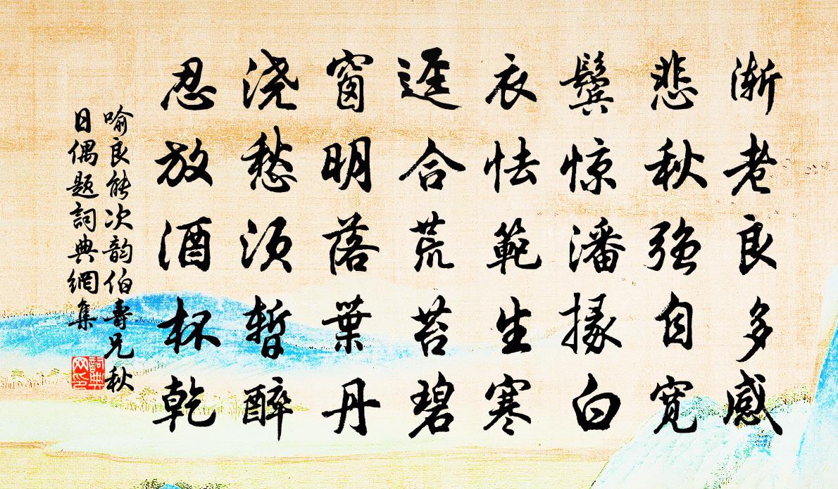 詩詞名句歷史字典書法欣賞書法字典國語詞典說文解字康熙字典古漢語字典標 題 作 者 詩 句 次韻伯壽兄秋日偶題作者:喻良能 朝代:宋代次韻伯壽兄秋日偶題原文漸老良多感,悲秋強自寬。鬢驚潘掾白,衣怯范生寒。逕合荒苔碧,窗明落葉丹。澆愁須暫醉,忍放酒杯乾。詩詞問答問:次韻伯壽兄秋日偶題的作者是誰?答:喻良能問:次韻伯壽兄秋日偶題寫於哪個朝代?答:宋代喻良能次韻伯壽兄秋日偶題書法欣賞次韻伯壽兄秋日偶題書法作品詩詞推薦挽陳菊坡樞密二首陳著〔宋代〕家學淵源遠,公今德行科。一純光白璧,重望壓頹波。職業居朝久,文章八石多。平生何所似,霜菊在秋坡。溪上野人家釋文珦〔宋代〕隔水兩三家,荊扉帶郭斜。春風喧燕雀,時雨足桑麻。翁媼皆垂白,衣冠不尚華。烏蓬船一隻,出入渡頭沙。於忽操王令〔宋代〕於忽乎,不可以為,其又奚為。謂雞斯飛,誰得而羈。謂豕斯突,何取於縛。是皆以食而得之,吾方飢而噫。雞兮臨江仙晁補之〔宋代〕自古齊山重九勝,登臨夢想依依。偶來恰值菊花時。難逢開口笑,須插滿頭歸。昨夜一江風色好,平明秋浦帆飛。癸卯與宋堯夫集於豫章之貢院既別堯夫就親南曾豐〔宋代〕吾人同醉豫章春,別後惟君日日新。家據東床官北關,腰錢騎鶴更何人。泛舟至蜻蜓浦小泊漁村陸游〔宋代〕醉泛蜻蜓浦,咿啞一櫓聲。陂塘秋水瘦,墟落暮煙生。野店曾留醉,樵翁不記名。相逢雖惘惘,懹抱已先傾。劉九法曹鄭瑕邱石門宴集杜甫〔唐代〕秋水清無底,蕭然靜客心。椽曹乘逸興,鞍馬到荒林。能吏逢聊璧,華筵直一金。晚來橫吹好,泓下亦龍吟。巫峽敝廬奉贈侍御四舅別之澧朗杜甫〔唐代〕江城秋日落,山鬼閉門中。行李淹吾舅,誅茅問老翁。赤眉猶世亂,青眼只途窮。傳語桃源客,人今出處同。次韻良佐陶夢桂〔宋代〕回也逍遙只寓言,參乎三省道真傳。明知榮悴何由我,誰道修為亦屬天。朝市山林皆寄耳,簡編燈火故依然。窮年病中絕句范成大〔宋代〕溽暑薰天地湧泉,變跧避濕掛行纏。出門斟酌無忙事,睡過黃梅細雨天。寄虞大卿四首姜特立〔宋代〕昔年寓郡獲親依,句妙時時得解頤。每過雙溪溪上路,邦人猶誦使君詩。獨酌李白〔唐代〕春草如有意,羅生玉堂陰。東風吹愁來,白髮坐相侵。獨酌勸孤影,閒歌面芳林。長松爾何知,蕭瑟為誰吟。手舞游僊陸游〔宋代〕玄圃春風賜宴時,雙成獨奏玉參差。侍晨飲釂虛皇喜,一段龍綃索進詩。香港感懷十首黃遵憲〔清代〕彈指樓台現,飛來何處峰?為誰劉黎藋,遍地出蕪蓉。方丈三神地,諸侯百里封。居然成重鎮,高壘矗狼烽。約劉良叔觀苔梅方岳〔宋代〕水曹為骨逋為髓,風雪灞橋誰共看。千里夢回歸路遠,一枝春占暮江寒。飛飛兩片猶堪醉,點點晴香亦帶酸。雙玉次韻再答少蘊知府甥和四兄長句並見寄二首晃沖之〔宋代〕錦袍昔是詩成得,別墅今非棋賭來。山蔚藍光交抱舍,水桃花色合圍台。通人竹塢深深入,謝客松扉遠遠開。定與江行夜泊李中〔唐代〕扁舟倦行役,寂寂宿江乾。半夜風雷過,一天星斗寒。潮平沙觜沒,霜苦雁聲殘。漁父何疏逸,扣舷歌未闌。新春葉茵〔宋代〕老來分外喜新春,春事關心世事輕。棋肯輸時方是著,路疑險處不須行。雨催農業鳩夫婦,風帶邊聲雁弟兄。辦得長相思(探梅摘歸)呂勝己〔宋代〕冒寒吹。訪瓊姬。行到青山遇玉肌。凝 * 待誰。山疏籬。手同攜。踏月隨香清夜歸。乘歡撥凍醅。閭丘醫視脈曰老人之脈如小春有感樓鑰〔宋代〕老去光陰似小春,如何比得少年人。君看桃李秋風后,縱有花開不是真。名句推薦花漸凋疏不耐風,畫簾垂地晚重工,墮階縈蘚舞愁紅孫光憲《浣溪沙·花漸凋疏不耐風》 方慚不耕者,祿食出閭里。韋應物《觀田家》 鴛鴦密語同傾蓋,且莫與、浣紗人說。張炎《疏影·詠荷葉》 起來無語理朝妝,寶匣鏡凝光顧敻《虞美人·觸簾風送景陽鍾》 欲將輕騎逐,大雪滿弓刀。盧綸《和張僕射塞下曲·其三》 酒逢知己千杯少,話不投機半句多歐陽修《春日西湖寄謝法曹韻》 胭脂雪瘦熏沉水,翡翠盤高走夜光。蔡松年《鷓鴣天·賞荷》 曲終過盡松陵路,回首煙波十四橋。姜夔《過垂虹》 為高必因丘陵,為下必因川澤。孟子《孟子·離婁章句上·第一節》 迢遞嵩高下,歸來且閉關。王維《歸嵩山作》