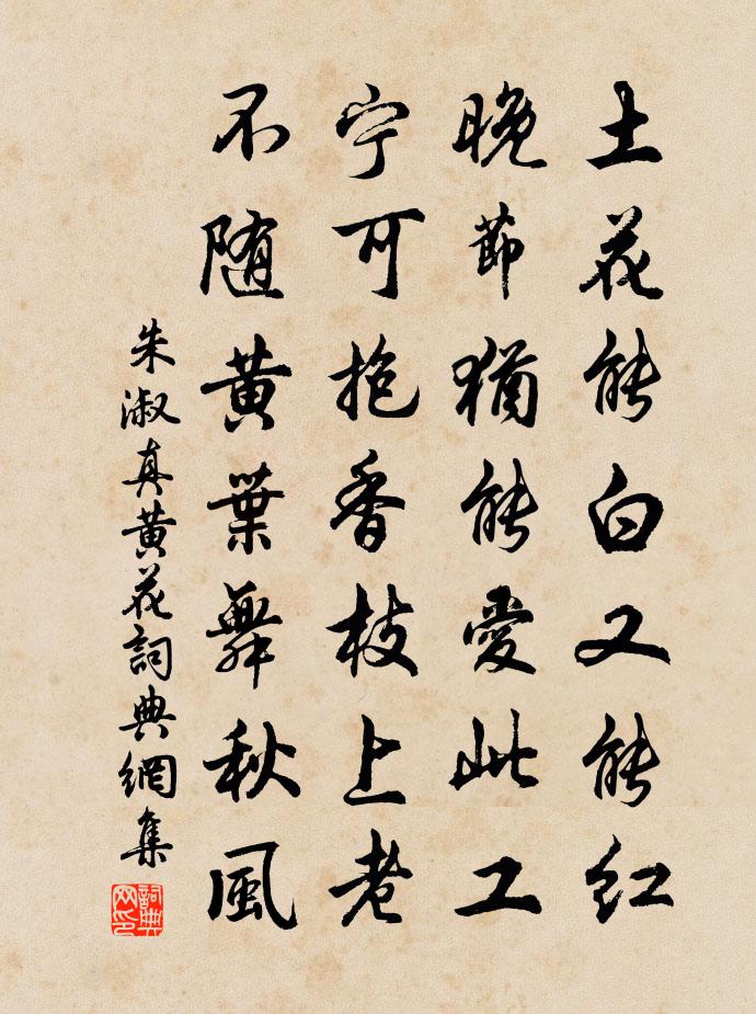 詩詞名句歷史字典書法欣賞書法字典國語詞典說文解字康熙字典古漢語字典標 題 作 者 詩 句 黃花作者:朱淑真 朝代:宋代黃花原文土花能白又能紅,晚節猶能愛此工。寧可抱香枝上老,不隨黃葉舞秋風。詩詞問答問:黃花的作者是誰?答:朱淑真問:黃花寫於哪個朝代?答:宋代問:黃花是什麼體裁?答:七絕問:朱淑真的名句有哪些?答:朱淑真名句大全朱淑真黃花書法欣賞黃花書法作品譯文和注釋譯文這種花可以說是白色,也可以說是紅色,到了晚年尤其是喜愛這種菊花。他寧可在枝頭老去,也不隨著落葉在秋風中飛舞飄落。注釋黃花:菊花。標籤:寫花詩詞推薦花底杜甫〔唐代〕紫萼扶千蕊,黃須照萬花。忽疑行暮雨,何事入朝霞。恐是潘安縣,堪留衛玠車。深知好顏色,莫作委泥沙。昭君怨·牡丹劉克莊〔宋代〕曾看洛陽舊譜,只許姚黃獨步。若比廣陵花,太虧他。舊日王侯園圃,今日荊榛狐兔。君莫說中州,怕花愁。櫻桃花元稹〔唐代〕櫻桃花,一枝兩枝千萬朵。花磚曾立摘花人,窣破羅裙紅似火。牡丹羅隱〔唐代〕艷多煙重欲開難,紅蕊當心一抹檀。公子醉歸燈下見,美人朝插鏡中看。當庭始覺春風貴,帶雨方知國色寒。日晚好事近(詠梅)陳亮〔宋代〕的皪兩三枝,點破暮煙蒼碧。好在屋檐斜入,傍玉奴橫笛。月華如水過林塘,花陰弄苔石。欲向夢中飛蝶,恐幽香最高樓(詠梅)陳亮〔宋代〕春乍透,香早暗偷傳。深院落,斗清妍。紫檀枝似流蘇帶,黃金須勝辟寒鈿。更朝朝,瓊樹好,笑當年。花不向沈野菊楊萬里〔宋代〕未與騷人當糗糧,況隨流俗作重陽。政緣在野有幽色,肯為無人減妙香。已晚相逢半山碧,便忙也折一枝黃。花應詠槿李白〔唐代〕園花笑芳年,池草艷春色。猶不如槿花,嬋娟玉階側。芬榮何夭促,零落在瞬息。豈若瓊樹枝,終歲長翕赩。解佩令·人行花塢史達祖〔宋代〕人行花塢。衣沾香霧。有新詞、逢春分付。屢欲傳情,奈燕子、不曾飛去。倚珠簾、詠郎秀句。相思一度。穠愁一水龍吟·載學士院有之辛棄疾〔宋代〕倚欄看碧成朱,等閒褪了香袍粉。上林高選,匆匆又換,紫雲衣潤。幾許春風,朝薰暮染,為花忙損。笑舊家桃李相見歡·林花謝了春紅李煜〔唐代〕林花謝了春紅,太匆匆。無奈朝來寒雨晚來風。胭脂淚,相留醉,幾時重。自是人生長恨水長東。(相留 一作:詠紅梅花得“紅”字曹雪芹〔清代〕桃未芳菲杏未紅,沖寒先喜笑東風。魂飛庾嶺春難辨,霞隔羅浮夢未通。綠萼添妝融寶炬,縞仙扶醉跨殘虹。看來芙蕖李漁〔清代〕 芙蕖與草本諸花似覺稍異,然有根無花,一歲一生,其性同也。譜云:“產於水者曰草芙蓉,產於陸者曰旱蓮揚州慢·瓊花鄭覺齊〔宋代〕弄玉輕盈,飛瓊淡濘,襪塵步下迷樓。試新妝才了,炷瀋水香球。記曉剪、春冰馳送,金瓶露濕,緹騎新流。甚天葬花吟曹雪芹〔清代〕花謝花飛花滿天,紅消香斷有誰憐?遊絲軟系飄春榭,落絮輕沾撲繡簾?閨中女兒惜春暮,愁緒滿懷無釋處;手把更漏子·出牆花晏幾道〔宋代〕出牆花,當路柳,借問芳心誰有。紅解笑,綠能顰,千般惱亂春。北來人,南去客,朝暮等閒攀折。憐晚秀,惜殘杜鵑花得紅字真山民〔宋代〕愁鎖巴雲往事空,只將遺恨寄芳叢。歸心千古終難白,啼血萬山都是紅。枝帶翠煙深夜月,魂飛錦水舊東風。至今題畫蘭鄭燮〔清代〕身在千山頂上頭,突岩深縫妙香稠。非無腳下浮雲鬧,來不相知去不留。落梅風·人初靜馬致遠〔元代〕人初靜,月正明。紗窗外玉梅斜映。梅花笑人偏弄影,月沉時一般孤零。感芍藥花寄正一上人白居易〔唐代〕今日階前紅芍藥,幾花欲老幾花新。開時不解比色相,落後始知如幻身。空門此去幾多地?欲把殘花問上人。名句推薦愛親者,不敢惡於人;敬親者,不敢慢於人。孔子及其弟子《孝經·天子》 白錦無紋香爛漫,玉樹瓊葩堆雪。丘處機《無俗念·靈虛宮梨花詞》 君子之言寡而實,小人之言多而虛。劉向《說苑·談叢》 事不三思終有悔,人能百忍自無憂。馮夢龍《醒世恆言·卷三十四》 世事浮云何足問,不如高臥且加餐。王維《酌酒與裴迪》 朝真暮偽何人辨,古往今來底事無。白居易《放言五首·其一》 帆影依依楓葉外,灘聲汩汩碓床間查慎行《雨過桐廬》 九日黃花酒,登高會昔聞。岑參《奉陪封大夫九日登高》 故人早晚上高台。贈我江南春色、一枝梅。舒亶《虞美人·寄公度》 河西幕中多故人,故人別來三五春。岑參《涼州館中與諸判官夜集》