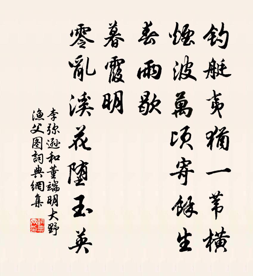 詩詞名句歷史字典書法欣賞書法字典國語詞典說文解字康熙字典古漢語字典標 題 作 者 詩 句 和董端明大野漁父圖作者:李彌遜 朝代:宋代和董端明大野漁父圖原文釣艇夷猶一葦橫,煙波萬頃寄餘生。春雨歇,暮霞明。零亂溪花墮玉英。詩詞問答問:和董端明大野漁父圖的作者是誰?答:李彌遜問:和董端明大野漁父圖寫於哪個朝代?答:宋代李彌遜和董端明大野漁父圖書法欣賞和董端明大野漁父圖書法作品詩詞推薦書林逸人壁釋惠崇〔宋代〕詩語動驚眾,誰知慕隱淪。水煙常似暝,林雪乍如春。薄酒懶邀客,好書愁借人。有時行藥去,忘卻戴紗巾。中秋月寄子由三首蘇軾〔宋代〕六年逢此月,五年照離別。歌君別時曲,滿座為淒咽。留都信繁麗,此會豈輕擲。熔銀百頃湖,掛鏡千尋闕。三更眉州禪僧一首蘇籀〔宋代〕吳蜀跨萬里,余老師非壯。勉哉令修行,手書勞四枉。性命吾基本,權譎初不尚。蕭條寂寞中,咄咄祛礙障。面目水調歌頭(再用前韻)李彌遜〔宋代〕不上長安道,霜鬢幾驚秋。故人何在,時序欺我去如流。賞對洛濱仙伯,共說薌林佳致,魂夢與追游。更唱中秋句憶王孫王丹桂〔元代〕本來真性喚神仙。為愛幽棲遠市廛。獨隱山堂妙最玄。樂恬然。欣即次天元十載華陰發兵,作時有郎官點發儲光羲〔唐代〕鬼方生獫狁,時寇盧龍營。帝念霍嫖姚,詔發鹹林兵。天星下文閣,簡師臨我城。三陌觀勇夫,五餌謀長纓。雷野謝潘端叔惠紅梅樓鑰〔宋代〕縞裙練帨玉為肌,誰點微頳向北枝。若使羅虬見顏色,定須將此比紅兒。答友問白居易〔唐代〕似玉童顏盡,如霜病鬢新。莫驚身頓老,心更老於身。候仙亭同諸客醉作白居易〔唐代〕謝安山下空攜妓,柳惲洲邊只賦詩。爭及湖亭今日會,嘲花詠水贈蛾眉。將游西池偶書李處權〔宋代〕去年客中愁,忽忽意未伸。歸來媚兒曹,行樂猶及辰。融怡帝鄉日,浩蕩天街春。物色豈不好,所思難重陳。婉孌瑞鷓鴣(登博見樓作)呂勝己〔宋代〕與君躡足共憑闌。俯視周回四面山。目靜魯邦心渺渺,氣吞夢澤意閒閒。煙雲變化更明晦,烏鵲忘機互往還。喚取德政上睦州胡中丞方乾〔唐代〕上德由來合動天,旌旗到日是豐年。群書已熟無人似,五字研成舉世傳。莫道政聲同宇宙,須知紫氣滿山川。豈唯園步雜興張鎡〔宋代〕豆籬黃葉被蔬田,靜極情懷似黯然。居舍又從東壁看,柳梢濃處起廚煙。和仲良春晚即事楊萬里〔宋代〕筍改齋前路,蔬眠雨後畦。晴江明處動,遠櫥看來齊。我語真雕朽,君詩妙斫泥。殷勤報春去,恰恰一鶯啼。華之高壽魯齋先生七十金履祥〔宋代〕百里何為,亦顯其君。武公九十,懿戒維新。主家祠楊維楨〔元代〕主家宴新客,內屋深羅帷。貴戚金與史,長者陶與猗。美人間中坐,玉質縷金衣。歌聲上碧落,不放青雲飛。杯行雪中六解姜夔〔宋代〕曾泛扁舟詣石湖,恍然坐我范寬圖。天寒遠掛一行雁,三十六峰生玉壺。寄致明並紀惠雁觀梅之舊劉子翬〔宋代〕稚劉於我最多情,此日詩筒不絕聲。孤雁相依真得地,早梅一粲又傾城。向來蘭好知誰許,病後霜林懶獨行。小几再韻謝張持甫過訪二首劉宰〔宋代〕道自周衰說異同,眼明伊洛振遺風。過人高行非難事,入聖微言本大公。道在鬼神常共在,術窮天地本無窮。三才足虞叟兄句蘇泂〔宋代〕六月還當月盡休,今年節令卻齊頭。蕭蕭不待聽梧葉,一見銀河認得秋。名句推薦聞道春還未相識,走傍寒梅訪訊息。李白《早春寄王漢陽》 不務天時,則財不生;不務地利,則倉廩不盈管仲《管子·牧民》 天山雪後海風寒,橫笛偏吹行路難。李益《從軍北征》 大風起兮雲飛揚。威加海內兮歸故鄉。安得猛士兮守四方!劉邦《大風歌》 君在天一涯,妾身長別離。江淹《古離別》 不求金玉重重貴,但願兒孫個個賢。佚名《增廣賢文·上集》 斑騅只系垂楊岸,何處西南任好風。李商隱《無題·鳳尾香羅薄幾重》 東岩富松竹,歲暮幸同歸。王勃《送盧主簿》 朱門酒肉臭,路有凍死骨。杜甫《自京赴奉先縣詠懷五百字 / 自京赴奉先詠懷五百字》 玉露凋傷楓樹林,巫山巫峽氣蕭森杜甫《秋興八首·其一》