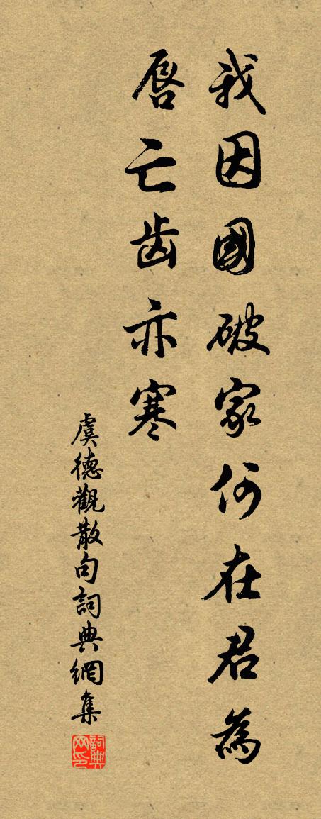 詩詞名句歷史字典書法欣賞書法字典國語詞典說文解字康熙字典古漢語字典標 題 作 者 詩 句 句作者:虞德觀 朝代:宋代句原文我因國破家何在,君為唇亡齒亦寒。詩詞問答問:句的作者是誰?答:虞德觀問:句寫於哪個朝代?答:宋代虞德觀句書法欣賞句書法作品詩詞推薦先天易吟三十首方回〔宋代〕鐘律及星曆,軍師兼井田。方圓兩圖在,萬古立鰲天。王應仲欲附張恭甫舟過湖南久不決今日忽聞遂陳與義〔宋代〕我身如孤雲,隨風墮湖邊。牆東木陰好,初識避世賢。從來有名士,不用無名錢。披君三逕草,分我一味禪。胡為山鷺鷥方回〔宋代〕行行萬山頂,無復大陂池。小磵清且駛,時見白鷺鷥。有魚必不大,何況亦無之。聯拳一弧影,盡日沙邊窺。七澤正月九日有美堂飲醉歸徑睡五鼓方醒不復能眠蘇軾〔宋代〕之眾人事紛擾,志士獨悄悄。何異琵琶弦,常遭腰鼓鬧。三杯忘萬慮,醒後還皎皎。有如轆轤索,已脫重縈繞。家玉台體利登〔宋代〕羸馬前山東復東,沈沈窗戶鎖愁紅。春風一把相思骨,又落江南煙雨中。參選有感葉茵〔宋代〕元是江湖蕭散客,誰將幽夢落南柯。十年不調幸然好,一著才差悟處多。肯使北山馳鶴信,且隨西舍唱漁歌。野人次韻學士重陽雪中見招不赴前後十六首洪皓〔宋代〕憶孟懷陶亦已陳,杖藜弔影召魂神。假書豈產狸為士,帶箭寧思鶴是賓。臂上垂囊災可代,江邊錫宴食多辛。典衣竹枝歌蘇轍〔宋代〕舟行千里不至楚,忽聞竹枝皆楚語。楚言啁哳安可分,江中明月多風露。扁舟日落駐平沙,茅屋竹籬三四家。連春煙雨館葛紹體〔宋代〕酒杯光動柳梢月,衣袖涼生蘆葉風。露坐夜深醒似困,釣船人語過湖東。贈慈上人趙汝鐩〔宋代〕踏遍叢林後,歸來隱石崖。任梅斜到牖,聽竹長侵街。掛壁塵堆笠,穿山雲惹鞋。真機須要悟,餘事是持齋。柬施上舍劉宰〔宋代〕萬里秋光酒一鍾,別來木末幾西風。懷人滾滾東流水,問訊冥冥北去鴻。愧我形容難似書,喜君意氣尚摩空。相逢林道士故廬陳允平〔宋代〕青城道士跨青牛,去作清都汗漫遊。朝扣九關朝玉闕,暮回三島宴金樓。丹隨鶴舞緱山月,劍伴龍歸洛浦秋。猶有初春幽居陸游〔宋代〕滿榼芳醪手自攜,陂湖南北埭東西。茂林處處見松鼠,幽圃時時聞竹雞。零落斷雲斜鄣日,霏微過雨未成泥。老民夜笛詞施肩吾〔唐代〕皎潔西樓月未斜,笛聲寥亮入東家。卻令燈下載衣婦,誤剪同心一半花。杏花天陸游〔宋代〕老來駒隙駸駸度。算只合、狂歌醉舞。金杯到手君休訴。看著春光又暮。誰為倩、柳條系住。且莫遣、城笳催去。流杯池曾鞏〔宋代〕行盡壇前石崖路,忽見一曲清泠,酒行到我不辭醉,安用了了分愚賢。江城子(再和呈馬守)王庭珪〔宋代〕天回北斗欲中宵。屢移杓。客魂消。記得皇州,燈火虹成橋。異俗西南開萬里,冠帶盡,百蠻徭。盧溪太守未還朝某獲造司空府得至便座見文禽五六夷猶曲池上毛滂〔宋代〕許近清池養羽儀,恩波穩暖自忘歸。長依竹石供瀟灑,不學蒼鷹飽便飛。舊聞邵叟名今識面目於詩句字畫中輒取二詩賡王洋〔宋代〕曾參古佛問忘情,可笑初孩尚未名。自刻肺肝戾定誓,時牽耳目雙寒盟。苦無藉在書窗冷,賴有知憐風竹聲。好是六言五首為倉部弟壽劉克莊〔宋代〕薄田足可躬稼,餘俸尚堪買山。家庭有個郊疇,姬院欠他素蠻。名句推薦倦遊京洛風塵,夜來病酒無人問。晁端禮《水龍吟·詠月》 雲想衣裳花想容,春風拂檻露華濃李白《清平調·其一》 日暮秋煙起,蕭蕭楓樹林。戴叔倫《過三閭廟》 人見利而不見害,魚見食而不見鉤。李汝珍《鏡花緣·第九十二回》 心事孤山春夢在,到思量、猶斷詩魂吳文英《極相思·題陳藏一水月梅扇》 小軒窗。正梳妝。相顧無言,惟有淚千行。蘇軾《江城子·乙卯正月二十日夜記夢》 樂易者常壽長,憂險者常夭折。荀子《荀子·榮辱》 草木秋死,松柏獨在劉向《說苑·談叢》 梨花院落溶溶月,柳絮池塘淡淡風。晏殊《無題·油壁香車不再逢》 磧里征人三十萬,一時回向月明看。李益《從軍北征》