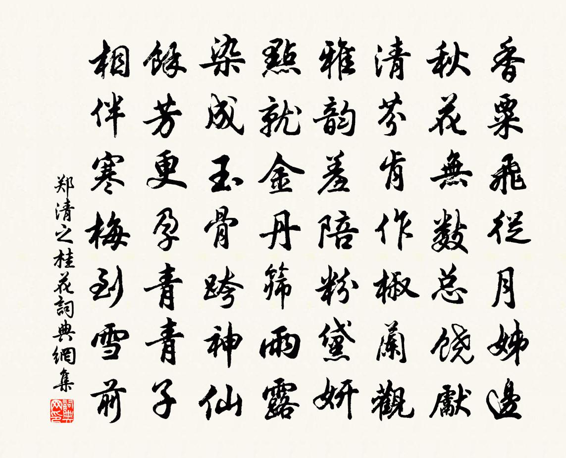 詩詞名句歷史字典書法欣賞書法字典國語詞典說文解字康熙字典古漢語字典標 題 作 者 詩 句 桂花作者:鄭清之 朝代:宋代桂花原文香粟飛從月姊邊,秋花無數總饒先。清芬肯作椒蘭觀,雅韻羞陪粉黛妍。點就金丹篩雨露,染成玉骨跨神仙。余芳更孕青青子,相伴寒梅到雪前。詩詞問答問:桂花的作者是誰?答:鄭清之問:桂花寫於哪個朝代?答:宋代鄭清之桂花書法欣賞桂花書法作品詩詞推薦句黃元靚〔宋代〕各人自掃門前雪,休管他人瓦上霜。奉和山池庾信〔南北朝〕樂宮多暇豫,望苑暫回輿。鳴笳陵絕浪,飛蓋歷通渠。桂亭花未落,桐門葉半疏。荷風驚浴鳥,橋影聚行魚。日落詠史下謝安陳普〔宋代〕封胡羯末皎琳琅,歲久渾無憶洛陽。江左家居照江水,謝安元為宋齊梁。次韻清修老墨梅新茗方岳〔宋代〕此詩合讓簡齋老,盡洗世間聲色塵。我更鑿空難著語,蹇驢粗記雪橋春。戲和淳詩卷樓鑰〔宋代〕澄江如練淨,新月似鐮磨。老柳飄輕絮,良苗颭細波。歌聲追古郢,詩價怯新羅。到處還成醉,芳醪旨且多。過樵川林時中趙若槸〔宋代〕建水樵川隔幾重,相逢孰意大江東。客行芳草垂楊外,春在柔桑小麥中。細雨疏田流水碧,殘霞擁樹遠林紅。浮生光風霽月觀鸕鶿聚灘下搜獵慈慘已而坐歲寒見錢時〔宋代〕出沒雲根上下浮,蘸蒲清溜十分幽。前灘烏鬼能撩亂,爭似盤魚得自由。游青城山楊可弼〔宋代〕我笑羊叔子,峴首矜一生。又怪謝阿客,伐山覓崢嶸。豈如銅梁守,出門便赤城。陌上花八首晁補之〔宋代〕娘子歌傳樂府悲,當年陌上看芳菲。曼聲更緩何妨緩,莫似東風火急歸。蠶食胡宏〔宋代〕蠶食人間我厚顏,命成奇數故偷閒。不知世上山河大,張日徘徊百水間。省墓葉茵〔宋代〕隴上松杉手自移,至今苔蘚半寒枝。夢中不記重泉隔,猶學兒童戲采時。黃陵題詠趙希鄂〔宋代〕悵望鸞輿不復還,令人疑盡九疑山。朱弦一斷南風操,粉淚長留楚竹斑。往事悠悠流水去,空祠寂寂暮雲閒。客情題常州獨孤檜翁卷〔宋代〕此檜何時種,相傳是獨孤。年深成古物,名重入州圖。老節堅難蠹,皴皮裂似枯。托根列帝廟,應不慮樵夫。浣溪沙(席中答錢漕)洪适〔宋代〕憶得熙春曉立班。使星曾入紫微垣。歸來小飲友芝蘭。投轄風流今復見,開尊禮數自來寬。更看寶唾寫烏闌。不寐車若水〔宋代〕通夕不能寐,隔戶聞鐘聲。野雞四方啼,披衣天未明。蕭條六合內,耿耿華發生。斷鰲何能立四極,杞人憂天自心武肅王有旨石橋設齋會進一詩釋延壽〔宋代〕登雲步嶺涉煙程,好景隨心次第生。聖者已符祥瑞事,地靈全副禱祈情。洞深重疊拖雲濕,灘淺潺湲漱水清。願滿酒泉子·長憶觀潮潘閬〔宋代〕長憶觀潮,滿郭人爭江上望。來疑滄海盡成空。萬面鼓聲中。弄潮兒向濤頭立。手把紅旗旗不濕。別來幾向夢中看烏夜啼楊維楨〔元代〕蘢蔥高樹青門西,夜夜棲烏來上啼。報君凶,報君喜,願君高樹成連理。啼烏夜夜 * 子,莫使君家高樹移。烏生前海觀蓮花峰石濤〔清代〕海風吹白練,百里涌青蓮。壁立不知頂,崔嵬勢接天。雲開峰墜地,島闊樹相連。坐久忘歸去,蘿衣上紫煙。暑雨陸游〔宋代〕欲雨未雨雷車奔,欲睡不睡人思昏。蠻童正報煮茶熟,忽有野僧來叩門。名句推薦遊人不管春將老,來往亭前踏落花。歐陽修《豐樂亭遊春·其三》 郴江幸自繞郴山,為誰流下瀟湘去。秦觀《踏莎行·郴州旅舍》 怕相思,已相思,輪到相思沒處辭,眉間露一絲。俞彥《長相思·折花枝》 人告之以有過則喜。孟子《孟子·公孫丑章句上·第八節》 新葉初冉冉,初蕊新霏霏。謝朓《詠落梅》 虛則知實之情,靜則知動者正。韓非及後人《韓非子·主道》 唯見鴻雁飛,令人傷懷抱。高適《登百丈峰二首》 舟遙遙以輕颺,風飄飄而吹衣。陶淵明《歸去來兮辭·並序》 倉廩實,則知禮節;衣食足,則知榮辱管仲《管子·牧民》 世事一場大夢,人生幾度秋涼?蘇軾《西江月·世事一場大夢》