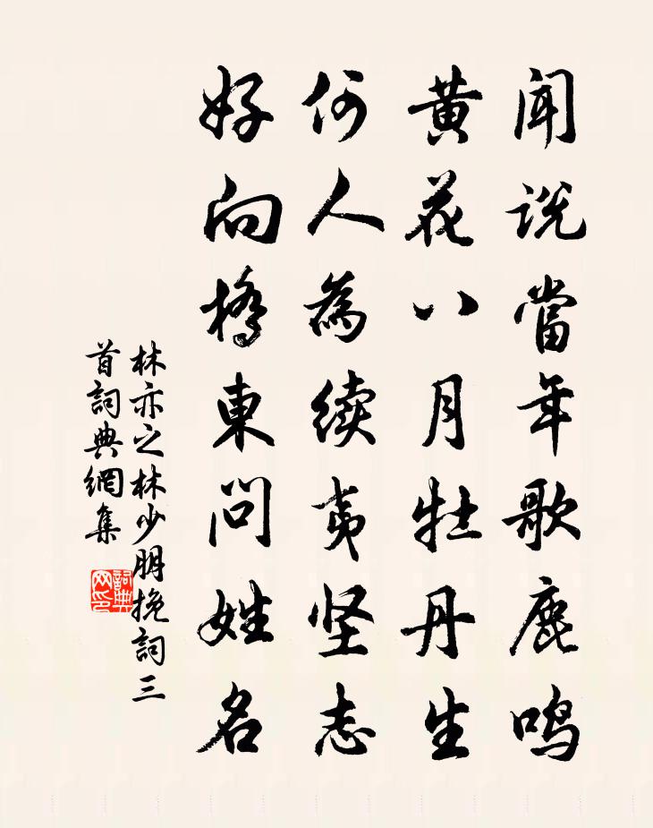 詩詞名句歷史字典書法欣賞書法字典國語詞典說文解字康熙字典古漢語字典標 題 作 者 詩 句 林少朋輓詞三首作者:林亦之 朝代:宋代林少朋輓詞三首原文聞說當年歌鹿鳴,黃花八月牡丹生。何人為續夷堅志,好向橋東問姓名。詩詞問答問:林少朋輓詞三首的作者是誰?答:林亦之問:林少朋輓詞三首寫於哪個朝代?答:宋代林亦之林少朋輓詞三首書法欣賞林少朋輓詞三首書法作品詩詞推薦提舉京城四壁守御劉公靖康小雅〔宋代〕有赫劉公,心在王室。氣吞強敵,忠貫日月。九鼎既淪,四溟盪潏。公如山嶽,萬仞屹屹。富貴莫誘,威武莫屈。竹枝皇甫松〔唐代〕芙蓉並蒂一心連,花侵槅子眼應穿。夏日南湖汎舟因過瓊華園六首張鎡〔宋代〕草生荒徑沒靴深,寂寂危亭蘚暈侵。翠輦不來知幾夏,野禽啼暝古松林。鷓鴣天(宣和己亥代人贈別)向子諲〔宋代〕斗帳歡盟不計年。誰知驀地遠如天。何曾一霎離心上,怎得而今在眼前。魚不斷,雁相連。可無小字寄芳箋。薄情次同叔見寄二首胡仲弓〔宋代〕窮通俱莫問,久遠是前程。涉世事多俗,吟詩人較清。論心欠蘭友,知已有梅兄。不被虛名縛,江湖得散行。六月十三日四更登舟縣岸遲明抵歲步宿雨猶濕趙蕃〔宋代〕月落櫓咿啞,曉登江上家。沖田多偃稻,直岸有頹沙。始悟雨如許,更欣晴亦佳。林中尚余滴,不管墊烏紗。虞美人(二日小雨達旦,西園獨臥,寒甚不能寐,時窗前梨花將謝)葉夢得〔宋代〕數聲微雨風驚曉,燭影欹殘照。客愁不奈五更寒。明日梨花開盡、有誰看。追尋猶記清明近。為向花前問。東風正除日始雪遄霽陳杰〔宋代〕去年冬孟朔朝雪,今歲臘三十日來。釀久直疑包地盡,飛狂忽作舞風回。盈虛有數天已定,氣候不齊人得猜。流轉走筆次廷藻韻二絕張元乾〔宋代〕小蘇一物絕風流,竹杖荒鞋愛討幽。招隱歸來吐佳句,何時一笑共重遊。送顏幾聖龍學尚書出守泉州二首楊萬里〔宋代〕聽履星辰北斗寒,三能只隔寸雲間。周家冢宰均四海,漢制尚書本百官。鵷鷺班齊瞻進步,鳳凰池近卻飛還。河圖牡丹唐彥謙〔唐代〕真宰多情巧思新,固將能事送殘春。為云為雨徒虛語,傾國傾城不在人。開日綺霞應失色,落時青帝合傷神。嫦娥採芙蓉詞楊冠卿〔宋代〕采采芙蓉華,集之以為裳。自從若耶谿,登於君子堂。馨香壓紉蘭,把玩卑瓊芳。佩服古無斁,懷人思沅湘。老夫白居易〔唐代〕七八年來游洛都,三分遊伴二分無。風前月下花園裡,處處唯殘個老夫。世事勞心非富貴,人生實事是歡娛。誰能和胡定甫仇遠〔宋代〕淡泊相逢古溧州,世情客況兩悠悠。腐儒都不通人事,冷掾何曾似宦遊。輕薄成風雖可畏,廉勤律己每無愁。他時漫興七首楊維楨〔元代〕青畫溪頭翠水家,水邊短竹夾桃花。春風嗾人狂無那,走覓南鄰羯鼓撾。丈人接縭白氈裁,花邊下馬不驚猜。環沉舞曲歌辭。獨漉篇李白〔唐代〕獨漉水中泥,水濁不見月。不見月尚可,水深行人沒。越鳥從南來,胡鷹亦北渡。我欲彎弓向天射,惜其中道失歸和龔同叔春日即事五首趙善括〔宋代〕柳綿飛撲撲,荷葉散田田。物幻無窮意,春歸何處天。事隨鸞鏡改,人逐燕巢遷。一笑千金價,吾羞魯仲連。再蒙簽判丈惠示惜花三絕句因次韻趙蕃〔宋代〕試覓圖經看,宜章路幾多。彼謀寧去穴,吾備且橫戈。累土生平地,安流起丈波。計愚無可采,敢復問云何。贈宜陽張使君戎昱〔唐代〕暫作宜陽客,深知太守賢。政移千里俗,人戴兩重天。舊郭多新室,閒坡盡闢田。倘令黃霸在,今日恥同年。過故友舊居許渾〔唐代〕往年公子宅,夜宴樂難忘。高竹動疏翠,早蓮飄暗香。珠盤凝寶瑟,綺席遞華觴。今日皆何處,閉門春草長。名句推薦因風吹火,用力不多。佚名《增廣賢文·上集》 凡大事皆起於小事,小事不論,大事又將不可救吳兢《貞觀政要·卷一·論政體》 昨夜笙歌容易散,酒醒添得愁無限馮延巳《鵲踏枝·梅落繁枝千萬片》 問渠那得清如許?為有源頭活水來。朱熹《觀書有感二首·其一》 朝陽不再盛,白日忽西幽。阮籍《詠懷八十二首·其三十二》 奉勸世間夫婦,固不可彼此相仇,亦不可過於情篤。沈復《浮生六記·坎坷記愁》 窗含西嶺千秋雪,門泊東吳萬里船。杜甫《絕句》 鑒前世之興衰,考當今之得失司馬光《資治通鑑·後周紀五》 寄語洛城風日道,明年春色倍還人。杜審言《春日京中有懷》 積雪覆平皋,飢鷹捉寒兔。孟浩然《南歸阻雪》