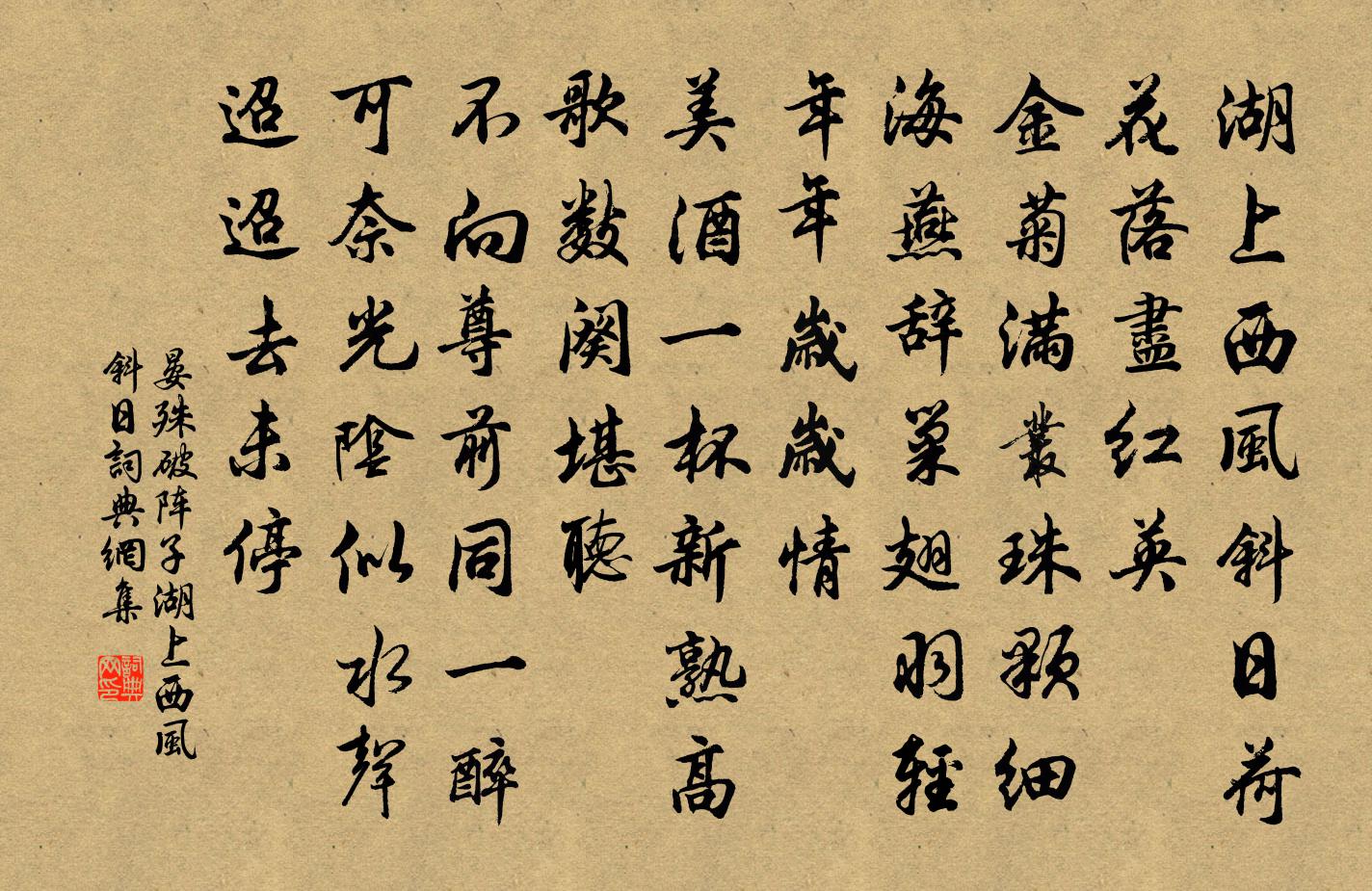 湖上西風斜日,荷花落盡紅英。金菊滿叢珠顆細,海燕辭巢翅羽輕。年年歲歲情。