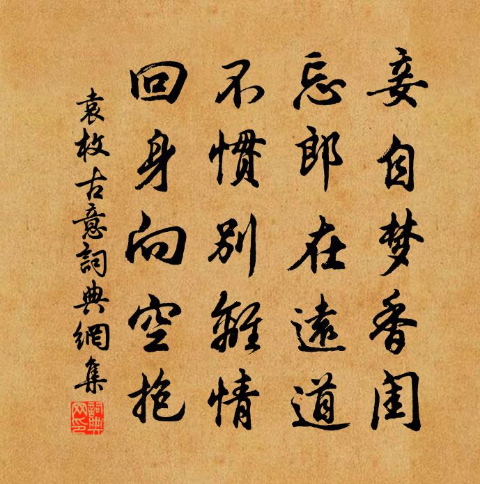 詩詞名句歷史字典書法欣賞書法字典國語詞典說文解字康熙字典古漢語字典標 題 作 者 詩 句 古意作者:袁枚 朝代:清代古意原文妾自夢香閨, 忘郎在遠道。不慣別離情, 回身向空抱。詩詞問答問:古意的作者是誰?答:袁枚問:古意寫於哪個朝代?答:清代問:袁枚的名句有哪些?答:袁枚名句大全袁枚古意書法欣賞古意書法作品詩詞推薦長干行陸游〔宋代〕裙腰綠如草,衫色石榴花,十二學彈箏,十三學琵琶。寧嫁與商人,夫婦各天涯,朝朝問水神,夜夜夢三巴。聘金鑿山為墳貽侄有詩公韻方岳〔宋代〕著書無復可藏山,朽骨何堪定眠觀。從左右旋天倚蓋,哉生死魄月循環。虛空身亦為吾患,見在心誰乞汝安。試問清湖小酌得生字方回〔宋代〕泯默抑幽抱,低回挫高情。肥遁夙果決,羈旅猶牽縈。華摭有舊習,冷嗜無新營。醲鮮世所競,褒博日以輕。小人游章義寺王安石〔宋代〕九日章義寺,倦遊因解鑣。拂榻寄午夢,起尋北山椒。岑蔚鳥絕跡,悲鳴唯一蜩。歡言與僧期,於此共簞瓢。斬松下章安杜瀆七首姚寬〔宋代〕風林葉脫減秋聲,山擁秋光到眼明。秋興悲秋俱有賦,安仁宋玉是前生。雪夜詹伯尹周少隱見過置酒次伯尹韻李彌遜〔宋代〕春雪花不禁風,花散作六花墮花,方庭截明玉,純白不可唾。枯腸索慳句,喁噞空白過。同襟得二妙,敵我悉城破浪淘沙(中秋陰雨,同顯忠、椿年、諒之坐寺門作)朱敦儒〔宋代〕圓月又中秋。南海西頭。蠻雲瘴雨晚難收。北客相逢彈淚坐,合恨分愁。無酒可銷憂。但說皇州。天家宮闕酒家樓自潁上歸再題寺壁二絕劉渙〔宋代〕被布羹藜三十春,苦空存性已通真。我來試問孤高士,翻愧區區名利身。陳鎮江生辰陳棣〔宋代〕著物薰然一氣和,溫溫眉宇得春多。腰黃眼赤渾閒事,柳綠花紅奈樂何。舊事幾經銅狄話,佳詞慣聽雪兒歌。一杯奉和江沖陶居二十韻汪炎昶〔宋代〕截斷浙東雲,朝昏變奇狀。平生采芝心,復此一惆悵。鷓鴣天(壽何簿乃尊)牟巘〔宋代〕鳩杖龐眉鶴髮仙。詩中有史筆如椽。愛蓮自是平生趣,吟到梅花晚更堅。珍九鼎,食萬錢。誰如有子采衣鮮。蜀陳遊春張玉孃〔宋代〕侍兒傅野約,趣伴出燃姬。竹外花迎佩,溪邊柳笑眉。春隨流水遠,日度錦雲遲。拾翠人爭問,含羞獨有詩。和陶淵明飲酒詩滕岑〔宋代〕佳辰菊始華,白衣適爾至。開樽且復坐,徑向叢邊醉。陶死向千載,風流孰其次。達人豈在酒,寓意乃為貴。吾知南歌子(楚守周豫出舞鬟,因作二首贈之)蘇軾〔宋代〕紺綰雙蟠髻,雲欹小偃巾。輕盈紅臉小腰身。疊鼓忽催花拍、斗精神。空闊輕紅歇,風和約柳春。蓬山才調最清新偈頌二十五釋智遇〔宋代〕一日日一,一時進。逗到臘八誑,眼上錯安眉。東西不辨,南北狐疑,從教萬古業風吹。有懷故居梅花趙蕃〔宋代〕梅花照耀山下村,舊居不返傷我魂。破苔履跡誰復掃,定要風雨參成昏。只今環堵聊自存,亦有獨樹背竹園。驟看茶王鎡〔宋代〕圓石磨邊轉片時,晴雷隱隱玉雲飛。龍身帶入波濤里,化作清風去不歸。天台四睡贊釋慧開〔宋代〕既是伏爪藏牙,不用三頭六臂。只圖夢裡惺惺,任疑大蟲瞌睡。姑蘇懷古葛起耕〔宋代〕闔閭城下水連天,故國淒涼思惘然。堤柳數行垂舞帶,砌苔幾疊暈歌鈿。了無麋鹿游台下,只有鳧鷖戲水邊。往事初冬山居即事十首吳芾〔宋代〕田宅雖無幾,琴書幸有餘。不妨臨水賦,況是背山居。適意真為樂,浮名總是虛。前賢猶若此,我輩欲何如。名句推薦松排山面千重翠,月點波心一顆珠。白居易《春題湖上》 雁柱十三弦,一一春鶯語。歐陽修《生查子·含羞整翠鬟》 榮寵有初,鮮有終者;吉凶無常,智者少禍。來俊臣《羅織經·固榮卷第六》 凌波不過橫塘路,但目送、芳塵去。賀鑄《青玉案·凌波不過橫塘路》 開花必早落,桃李不如松。李白《箜篌謠》 驚鳥去無際,寒蛩鳴我傍。馬戴《楚江懷古三首》 白鳥悠悠自去,汀洲外、無限蒹葭。王國維《滿庭芳·水抱孤城》 日中則昃,月盈則食佚名《易傳·彖傳下·豐》 神椎鑿石塞神潭,白馬參覃赤塵起。溫庭筠《拂舞詞 / 公無渡河》 非其地而樹之,不生也。劉向《說苑·雜言》
