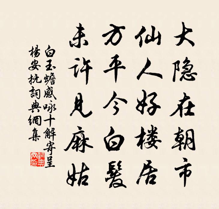 詩詞名句歷史字典書法欣賞書法字典國語詞典說文解字康熙字典古漢語字典標 題 作 者 詩 句 感詠十解寄呈楊安撫作者:白玉蟾 朝代:宋代感詠十解寄呈楊安撫原文大隱在朝市,仙人好樓居。方平今白髮,未許見麻姑。詩詞問答問:感詠十解寄呈楊安撫的作者是誰?答:白玉蟾問:感詠十解寄呈楊安撫寫於哪個朝代?答:宋代問:感詠十解寄呈楊安撫是什麼體裁?答:五絕白玉蟾感詠十解寄呈楊安撫書法欣賞感詠十解寄呈楊安撫書法作品詩詞推薦酬李補闕紓皎然〔唐代〕不住東林寺,雲泉處處行。近臣那得識,禪客本無名。壬戌立春日王炎〔宋代〕晼晼流年度,淒涼短景催。月圓疑臘半,歲閏已春回。一箸青絲菜,三杯白玉醅。主人無喜事,蠟炬誤花開。金蓮出玉花 勸劉法司放鸚鵡馬鈺〔元代〕綠毛紅嘴。因為能言還自累。奉勸修何。語得分明愈著魔。不如省覺。緘口藏機懷卓犖。人總嫌伊。得出凡籠自在先天易吟三十首方回〔宋代〕八卦各為八,枝從幹上橫。厥初有何物,萬物一根生。蘇十三瞻登玉泉寺峰入寺中見贈作儲光羲〔唐代〕慶門疊華組,盛列鍾英彥。貞信發天姿,文明葉邦選。為情貴深遠,作德齊隱見。別業在春山,懷歸出芳甸。逖聽無題張籍〔唐代〕桃溪柳陌好經過,燈下妝成月下歌。為是襄王故宮地,至今猶有細腰多。挽龔竹卿陳杰〔宋代〕同朝尚憶當時事,我去明朝公入台。岳柱摧邊忽英簜,海塵揚處又蓬萊。夢闌杞國憂天痛,世換遼東避地回。似爾偶成趙蕃〔宋代〕落盡群芳未肯晴,重尋破褐尚寒生。風輕檐廡頻來燕,雨合林園未有鶯。慷慨董生悲不遇,蕭條靖節賦閒情。倚樓江行四首陳造〔宋代〕遠近青山不辦看,翩翾征雁敢爭先。船頭起浪風頭孰,不假驂鸞自半仙。和似表弟次吳江李彌遜〔宋代〕路入吳江眼倍明,長谼雨立萬□□。仙翁曾下遼在鶴,詩老猶傳跨海鯨。夜榜風蒲嗟去國,秋山雲履趁尋盟。憑誰小閣晚望陳與義〔宋代〕澤國候易變,孟冬乃微和。解襟憑小閣,日暮歸雲多。蒼蒼散草木,莽莽雜山河。荒野蟲亂鳴,長空鳥時過。萬象狂風晁說之〔宋代〕十日狂風不偶然,未教桃李斗嬋娟。關西將士曾如此,直入齊宮斬小憐。李參政折贈黃香梅與八詠俱至用韻以謝魏了翁〔宋代〕玄天黃露真顏色,金步搖中顫舞娃。更倩南窗書妳味,不妨來伴太常齋。恨契詩晁說之〔宋代〕坎壈愚無計,慟哭老無淚。居處近何適,隱遁遠何暨。爰來未嘗恨,始恨金石契。何朝熔而泥,亦暮泐以滓。有美曾宏甫到光山遣送鵝梨淮魚等數種曾幾〔宋代〕吾宗席未暖淮濱,遣騎持書賸送珍。美實來從壓沙寺,巨魚長比藉糟人。欲雕好語略為報,但愧新詩如有神。領客一寸金佚名〔宋代〕富貴又爭人我,貧窮更待如何。有緣有分是非多。無福無災無禍。教他一任奢侈,簞瓢也是存活。勸君休要苦張羅丙子丁丑年避難南山之西坑今春投北山兩雪竇陳著〔宋代〕西坑曾避難,今又一西坑。十有四年夢,兩番多事驚。天乎存老息,地亦定前名。何動不關命,怡然心氣平。同鄭君瑞出瀨溪即事十首劉克莊〔宋代〕豪士寧淪鬼趣中,曼卿昔去管芙蓉。君今定作梅花主,來往山間儻一逢。大鑒禪師贊釋慧開〔宋代〕菩堤無樹鏡非台,臭門分明鬼擘開。幸是賣柴無事獠,剛然惹得一身災。乾寒拾贊釋心月〔宋代〕對面撫掌,兩鏡相照。雙磵與五峰,冷地齊失笑。喚作普賢還料掉。名句推薦朝落暮開空自許,竟無人解知心苦晏幾道《蝶戀花·笑艷秋蓮生綠浦》 學而不思則罔,思而不學則殆。孔子弟子《論語·為政篇》 江湖多風波,舟楫恐失墜。杜甫《夢李白二首·其二》 茅檐人靜,蓬窗燈暗,春晚連江風雨。陸游《鵲橋仙·夜聞杜鵑》 君子之事親孝,故忠可移於君。孔子及其弟子《孝經·廣揚名》 凡戰,所謂攻者,知彼者也。佚名《百戰奇略·第四卷·攻戰》 一年之計在於春,一日之計在於寅。佚名《增廣賢文·上集》 鼙鼓動時雷隱隱,獸頭凌處雪微微。盧肇《競渡詩 / 及第後江寧觀競渡寄袁州剌史成應元》 漠漠水田飛白鷺,陰陰夏木囀黃鸝。王維《積雨輞川莊作 / 秋歸輞川莊作》 吃一分虧,受無量福。馮夢龍《警世通言·卷三》