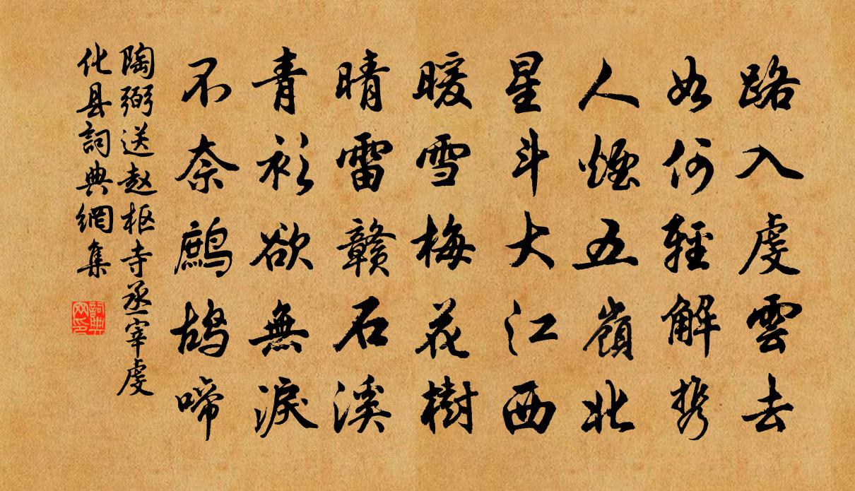 詩詞名句歷史字典書法欣賞書法字典國語詞典說文解字康熙字典古漢語字典標 題 作 者 詩 句 送趙樞寺丞宰虔化縣作者:陶弼 朝代:宋代送趙樞寺丞宰虔化縣原文路入虔雲去,如何輕解攜。人煙五嶺北,星斗大江西。暖雪梅花樹,晴雷贛石溪。青衫欲無淚,不奈鷓鴣啼。詩詞問答問:送趙樞寺丞宰虔化縣的作者是誰?答:陶弼問:送趙樞寺丞宰虔化縣寫於哪個朝代?答:宋代陶弼送趙樞寺丞宰虔化縣書法欣賞送趙樞寺丞宰虔化縣書法作品詩詞推薦春居雜興王禹偁〔宋代〕雨株桃杏映籬斜,妝點商山副使家。何事春風容不得,和鶯吹折數枝花。九日與客登鳳凰山酌涌金泉泛舟西歸李洪〔宋代〕西山爽氣壓城闉,攜客登高日未晡。稚子已諳撐舴艋,老夫羞更插茱萸。文章不進空黃你,生計無多問木奴。貧病遠齋頃寄在湖日所作三詩舟中次韻趙蕃〔宋代〕近日杭州見,殷勤蒙置樽。別來幾朝夕,書問欠寒溫。譚妙元超詣,詩高外語言。何當從杖履,底盡得深論。寄歐陽元老吳則禮〔宋代〕耿耿坐不寐,浩歌睇流雲。寒商動清夜,落木何紛紛。幽閨納華月,宴幾停余薰。聊復飲蘭露,無因持寄君。魯中送魯使君歸鄭州韓翃〔唐代〕城中金絡騎,出餞沈東陽。九月寒露白,六關秋草黃。齊謳聽處妙,魯酒把來香。醉後著鞭去,梅山道路長。登雲庵釋正覺〔宋代〕屠蘇對碧溪,霜草露幽蹊。顧我丘壑醉,知誰塵土迷。蘿門窺窈窕,雪磴履高低。猿鳥未相棄,伴人煙樹棲。范滂徐鈞〔宋代〕慨然攬轡志澄清,一激誰知黨禍成。母子可憐終死別,庶幾廣孝在揚名。春郊王銍〔宋代〕碧飛紅斷正傷春,萬里天涯一病身。芳草路長樓百尺,樓中更有憑欄人。同鄭相併歌姬小飲戲贈 / 杜丞相悰筵中贈美人李群玉〔唐代〕裙拖六幅湘江水,鬢聳巫山一段雲。風格只應天上有,歌聲豈合世間聞。胸前瑞雪燈斜照,眼底桃花酒半醺。不是留題郡齋白居易〔唐代〕吟山歌水嘲風月,便是三年官滿時。春為醉眠多閉閣,秋因晴望暫褰帷。更無一事移風俗,唯化州民解詠詩。費華文輓詩二首魏了翁〔宋代〕三鳳齊飛日,相期到白頭。一丘生處樂,萬事死前休。風急啼烏放,霜零斷雁秋。懷人竟何極,緘淚寄西州。周顒徐鈞〔宋代〕紛紛世代我何知,春韭秋菘味可奇。何事輕招猿鶴怨,至今人訝北山移。玉光亭章得象〔宋代〕千層懷玉對軒窗,池上新亭號玉光。祇此便堪為吏隱,神仙官職水雲鄉。謁金門盧祖皋〔宋代〕間院宇。獨自行來行去。花片無聲簾外雨。峭寒生碧樹。做弄清明時序。料理春酲情緒。憶得歸時停棹處。畫橋看行朝早春侍師門宴西溪席上作殷文圭〔唐代〕西溪水色淨於苔,畫橫風絳帳開。弦管旋飄蓬島去,公卿皆是蕊宮來。金鱗擲浪錢翻荇,玉爵粘香雪泛梅。三榜生句符載〔唐代〕綠迸穿籬筍,紅飄隔戶花。段家堤西望晚山蔡襄〔宋代〕月下西山千萬重,日光山氣鬱蔥籠。鮫綃數幅須移得,惆悵如今無畫工。清平樂(秋葉)高觀國〔宋代〕盤枝翦翠。葉葉西風意。吹上玉人云□底。無限新涼氣味。飄蕭露捲菸柔。絕憐不逐宮流。寄語多情宋玉,悲秋得監試蓮花峰劉得仁〔唐代〕太華萬餘重,岧嶢只此峰。當秋倚寥泬,入望似芙蓉。翠拔千尋直,青危一朵穠。氣分毛女秀,靈有羽人蹤。倒影示女子鄭俠〔宋代〕吾生鮮兒婦,汝次今居首。柔惠少語言,天性非矯揉。女生必有適,二親非終守。既嫁又他州,安能長相就。幸然名句推薦東邊日出西邊雨,道是無晴卻有晴。劉禹錫《竹枝詞二首·其一》 黃葉覆溪橋,荒村唯古木。柳宗元《秋曉行南谷經荒村》 機關算盡太聰明,反算了卿卿性命。曹雪芹《紅樓夢·第五回》 田園寥落干戈後,骨肉流離道路中。白居易《望月有感》 桃李待日開,榮華照當年。李白《長歌行》 煙霏霏。雪霏霏。雪向梅花枝上堆。吳淑姬《長相思令·煙霏霏》 青衫匹馬萬人呼,幕府當年急急符。辛棄疾《送湖南部曲》 商葉墮乾雨,秋衣臥單雲。孟郊《秋懷十五首》 妾身獨自眠,月圓人未圓。王元鼎《憑欄人·閨怨》 應是天仙狂醉,亂把白雲揉碎。李白《清平樂·畫堂晨起》