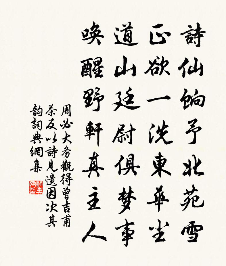 詩詞名句歷史字典書法欣賞書法字典國語詞典說文解字康熙字典古漢語字典標 題 作 者 詩 句 務觀得曾吉甫茶反以詩見遺因次其韻作者:周必大 朝代:宋代原文詩仙餉予北苑雪,正欲一洗東華塵。道山廷尉俱夢事,喚醒野軒真主人。詩詞問答問:《務觀得曾吉甫茶反以詩見遺因次其韻》的作者是誰?答:周必大問:該詩寫於哪個朝代?答:宋代書法欣賞務觀得曾吉甫茶反以詩見遺因次其韻書法作品詩詞推薦雜曲歌辭。東飛伯勞歌李暇〔唐代〕秦王龍劍燕後琴,珊瑚寶匣鏤雙心。誰家女兒抱香枕,開衾滅燭願侍寢。瓊窗半上金縷幬,輕羅隱面不障羞。青綺戊子正月二十六日夜夢梅堯臣〔宋代〕自我再婚來,二年不入夢。昨宵見顏色,中夕生悲痛。暗燈露微明,寂寂照梁棟。無端打窗雪,更被狂風送。題尤使君郡圃十二詩玉霄亭李庚〔宋代〕亭亭玉霄峰,列仙皆羽化。把酒碧桃間, * 明月下。嗟我落塵凡,鶴背應難跨。夫子真癯儒,好上班麟駕。次韻張直閣對雨項安世〔宋代〕九重城裡作山園,隔盡紅塵一世喧。今雨未妨連昨日,春寒聊為破冬溫。客傅條令來梅圃,僮報平安向竹村。我在賀新郎·九日劉克莊〔宋代〕湛湛長空黑。更那堪、斜風細雨,亂愁如織。老眼平生空四海,賴有高樓百尺。看浩蕩、千崖秋色。白髮書生神州天賜白陳郁〔宋代〕君不見書生鐫羌勒兵入,羌來薄城束縛急。蠟丸飛出辭大家,帳下健兒紛雨泣。鑒沙到石終無水,擾擾萬人如渴蟻溽暑蘇轍〔宋代〕東風吹鼎方然薪,游魚出沒一世人。隨湯上下猶欣欣,不識河漢清涼津。十年我已不出門,可憐尚寄生死濱。老知雪後守之家梅未開,呈宗偉范成大〔宋代〕瓦溝凍殘雪,檐溜粘輕冰。破寒一竿日,春隨人意生。端葉再三白,南枝尚含情。定知司花女,未肯嫁娉婷。官居雪中三首白玉蟾〔宋代〕曉來紅日尚羞明,四外彤雲欲詐晴。一夜九天開玉闕,六花萬里散璚英。九月八日夜大風雨寄王定國秦觀〔宋代〕長年身外事都捐,節物驚心一悵然。正是山川秋入夢,可堪風雨夜連天。桐梢摵摵增淒斷,燈燼飛飛落小圓。湔洗青山辭陳天麟〔宋代〕青山崔崔,白雲溶溶。我疑其中,仙人所宮。風馬雲輿,霓旌羽幢。遊行太空,翩然相從。望而不見,使我心忡。金陵雜興二百首蘇泂〔宋代〕二十四番風信催,郭南間道有花開。園官欲斗金錢賞,名字先供百品來。水龍吟(用瓢泉韻戲陳仁和兼簡諸葛元亮,且督和詞)辛棄疾〔宋代〕被公驚倒瓢泉,倒流三峽詞源瀉。長安紙貴,流傳一字,千金爭舍。割肉懷歸,先生自笑,又何廉也。但銜杯莫問減字木蘭花(壽女婿)王觀〔宋代〕瑞雲仙霧。拂曉重重遮繡戶。一炷清香。千尺流霞入壽觴。家門轉好。從此應須長不老。來歲春風。看拜西樞小令挽陳漢英杜范〔宋代〕庠塾崇師道,鄉閭重典刑。麟經開晚學,鶚表動天庭。頭未終朝黑,補能幾日青。文章難得力,愁絕峴山塋。滿江南(用吳淵吳潛二公韻)王淮〔宋代〕踏遍江南,予豈為、解衣推食。謾贏得、煙波短棹,月樓長笛。看劍功名心已死,積薪涕淚今誰滴。想中原、一望金陵書事胡銓〔宋代〕六代風流最永嘉,郁蔥勝氣隱晴霞。折衝樽俎神俱旺,表裹山河險莫夸。幾縷碧煙迷杏眼,半篙清漲減蒲芽。歌聲浙東參政寄示會稽蓬萊閣詩軸,次韻寄題范成大〔宋代〕仙翁來佩玉符麟,綠髮無霜照碧筠。永夜闌乾千嶂月,清風揮塵七州春。塵埃不隔壺中境,功業猶關物外身。鸞鶴冬日述懷華岳〔宋代〕寒入肌膚粟已生,銀河凍合水無聲。梅花漏泄春先到,風色商量雪未成。有愧何須問天理,無求方始合人情。男兒伯和見過鄒浩〔宋代〕參軍跋馬瘴江濱,一笑相逢意轉親。偶復面論前日事,恍疑身是隔生人。風隨玉塵傾新蓋,暑避冰姿返舊輪。八桂名句推薦鵬北海,鳳朝陽。辛棄疾《鷓鴣天·送廓之秋試》 置酒長安道,同心與我違。王維《送綦毋潛落第還鄉 / 送別》 流星飛玉彈,寶劍落秋霜。張玉娘《從軍行》 隔牖風驚竹,開門雪滿山。王維《冬晚對雪憶胡居士家》 是故,君子有終身之憂,無一朝之患也。孟子《孟子·離婁章句下·第二十八節》 見肝之病,知肝傳脾,當先實脾張仲景《金匱要略·卷上·藏府經絡先後病脈證一》 秋到長門秋草黃。畫梁雙燕去,出宮牆。薛昭蘊《小重山·秋到長門秋草黃》 雁過也,正傷心,卻是舊時相識。李清照《聲聲慢·尋尋覓覓》 野店桃花紅粉姿,陌頭楊柳綠菸絲。趙孟頫《東城》 一曲陽關,斷腸聲盡,獨自憑蘭橈柳永《少年游·參差煙樹灞陵橋》