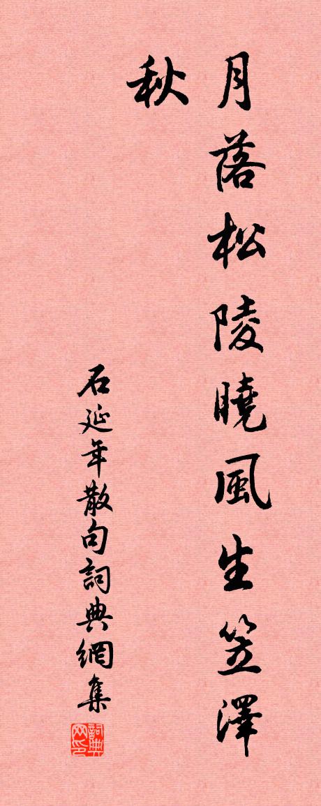 詩詞名句歷史字典書法欣賞書法字典國語詞典說文解字康熙字典古漢語字典標 題 作 者 詩 句 句作者:石延年 朝代:宋代句原文月落松陵曉,風生笠澤秋。詩詞問答問:句的作者是誰?答:石延年問:句寫於哪個朝代?答:宋代石延年句書法欣賞句書法作品詩詞推薦頌古一百首釋智愚〔宋代〕有問自知無答處,卻將柏樹當門庭。搖風擺雨經年久,不似松根有茯苓。山寺陸游〔宋代〕路盡初逢寺,行行獨叩扉。民貧稀送供,僧老少完衣。日正樓鍾動,溪深藥草肥。吾衰亦久矣,舍此欲疇依?寶祐二年皇子冠二十首佚名〔宋代〕路寐闢門,黼坐恭已。群公在庭,所重維禮。正心齊家,以燕翼子。於萬斯年,王心載喜。過秀寄麋秘書項安世〔宋代〕圓嶠仙人厭久如,戲求何穎作周書。半生聞誼親無路,一日同僚分有餘。西子湖邊春載酒,征官亭上夜分裾。秋來過楊處士幽居姚合〔唐代〕引水穿風竹,幽聲勝遠溪。裁衣延野客,翦翅養山雞。酒熟聽琴酌,詩成削樹題。惟愁春氣暖,松下雪和泥。次韻德先步月答所問語魏了翁〔宋代〕霽月光湓浦,吟風歸洛京。迥無纖靄翳,千古識真清。徐審知置酒會者三人以為此春酒以介眉壽分韻趙蕃〔宋代〕餓死因細腰,半額由廣眉。是知風化速,有類形影移。時人走功名,我輩陳詩書。雖病勿是疚,雖貧勿自悲。偈頌七十一首釋了惠〔宋代〕大地為囹圄,鞫勘佛與祖。款案猶未圓,棒喝如雷雨。平白累山僧,有屈無雪處。有雪處,楖{左木右栗}橫擔不題醒心軒黃庭堅〔宋代〕盡日竹風談法要,無人竹影又斜陽。他時若有相應者,莫負開軒人姓黃。點絳唇(和翁子西)趙師俠〔宋代〕日暖風暄,殿春瓊蕊依台榭。雪堆花架。不用丹青寫。瑩徹精神,映月唯宜夜。幪香帕。倩風扶下。碎玉殘妝卸。臨江仙趙長卿〔宋代〕天外濃云云外雨,雨聲初上檐牙。紅蕖應褪洗妝花。晚涼如有意,霫霫到山家。為喚山童多索酒,金鍾細酌流霞。乙未冬久雨陳普〔宋代〕隴上初黃霧四垂,禾頭盡墨正淋漓。衡山自有開雲手,只有人間人不知。正旦呈諸僚友張伯玉〔宋代〕拂霧酴酥酒滿巡,越山如鬣水如鱗。日邊雖望龍庭遠,海上初傳鳳歷新。好景融融來破雪,和風細細欲黏人。莫言送孫子淵潭州司理葉適〔宋代〕我住瀟湘獄自清,囚衫蟲蠹雨飄零。如今三院更幽寂,閉戶勘書花滿廳。彭祖井(一本題上有奉和王相公五字)皇甫冉〔唐代〕上公旌節在徐方,舊井莓苔近寢堂。訪古因知彭祖宅,得仙何必葛洪鄉。清虛不共春池竟,盥漱偏宜夏日長。聞道挽陳司直二首劉克莊〔宋代〕五朝際遇諸家少,四葉封崇一品榮。不似鶯花貴公子,宛然螢雪老書生。交遊綠野舊賓客,濡染滄洲賢父兄。吾老清平調·其二李白〔唐代〕一枝紅艷露凝香,雲雨巫山枉斷腸。借問漢宮誰得似,可憐飛燕倚新妝。憶四明上元晁說之〔宋代〕翡翠隨潮月,琉璃共佛燈。沈香問遠遠,珠樹間層層。湖州歌九十八首 其十一汪元量〔宋代〕昨夜三更淚濕腮,伍胥何事夢中來。三宮從此相分別,自勒潮頭白馬回。八景勝概劍峽遲鸞方鳳〔宋代〕峽中候帝子,青鳥空徘徊。搔首叩玄律,何當化鶴來。名句推薦日暖桑麻光似潑,風來蒿艾氣如薰。蘇軾《浣溪沙·軟草平莎過雨新》 立身之道何窮,只得一敬字,便事事皆整。王永彬《圍爐夜話·第一六三則》 眇眇孤舟逝,綿綿歸思紆。陶淵明《始作鎮軍參軍經曲阿作》 春近寒雖轉,梅舒雪尚飄。陰鏗《雪裡梅花詩》 甚獨抱清高,頓成淒楚。王沂孫《齊天樂·蟬》 奢侈足以敗家;慳吝亦足以敗家。王永彬《圍爐夜話·第五九則》 最傷情、送客鹹陽,佩結西風怨。吳文英《瑣窗寒·玉蘭》 天與短因緣,聚散常容易。晏幾道《生查子·狂花頃刻香》 江流天地外,山色有無中。王維《漢江臨泛 / 漢江臨眺》 溪深古雪在,石斷寒泉流。李白《尋高鳳石門山中元丹丘》