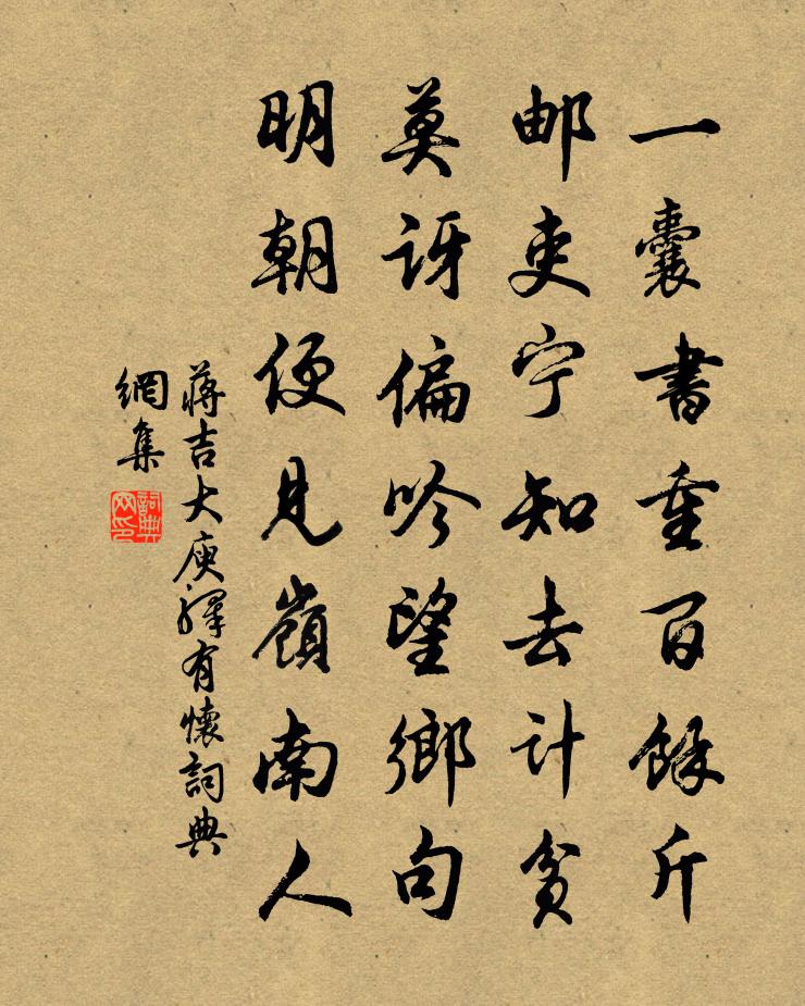 詩詞名句歷史字典書法欣賞書法字典國語詞典說文解字康熙字典古漢語字典標 題 作 者 詩 句 大庾驛有懷作者:蔣吉 朝代:唐代大庾驛有懷原文一囊書重百餘斤,郵吏寧知去計貧。莫訝偏吟望鄉句,明朝便見嶺南人。詩詞問答問:大庾驛有懷的作者是誰?答:蔣吉問:大庾驛有懷寫於哪個朝代?答:唐代蔣吉大庾驛有懷書法欣賞大庾驛有懷書法作品詩詞推薦寄曾使君謝伋〔宋代〕江色城霞氣象新,中興岳牧用詩人。爭趨畫戟高門地,竊伏荒山漲海瀕。敢望車魚延傳舍,先持箋簡具州民。猿驚贈玉壺相士陳杰〔宋代〕黃金取印斗來大,白玉作壺冰樣寒。子號甚清堪自照,吾詩愈淡欲誰看。司空相公輓歌王禹偁〔宋代〕去歲頻宣召,觀燈復賞花。健嫌靈壽杖,輕棄富人車。列座先台席,溫顏逼翠華。而今宅前路,雨破築堤沙。和象翁絕句衛宗武〔宋代〕恰好軒窗傍竹開,絕勝舞榭與歌台。樅樅甲刃丈夫立,彈壓炎威不敢來。和馬大夫闢佛五首胡宏〔宋代〕三綱亡有辨夷華,一處分明萬不差。可怪棄君逃父客,妄談心印自雄夸。玩松竹滕岑〔宋代〕蕭蕭園中竹,不複數萱草,蒼蒼池上松,豈更問苹藻。二物吾所愛,難為俗人道。竹如吾之節,松似吾之老。煙雨雲霧斂譚處端〔元代〕匿光輝,認愚鹵。兀兀騰騰,閒里尋閒步。垢面蓬頭衣襤褸。乞食忘慚,方稱煙霞侶。絕驕矜,趣真素。不受人欽搗衣吳大江〔唐代〕沙塞秋應晚,金閨恨已空。那堪裂紈素,時許出房櫳。杵影弄寒月,砧聲調夜風。裁縫雙淚盡,萬里寄雲中。禪人寫真求贊釋正覺〔宋代〕握筇之像,對機之身。六根攝一處,三昧起諸塵。蚌腸孕於月明之夜,蟄戶開於雷動之春。個般手段兮,分付善應過梅里七首家…今列題於後。憶東郭居(效丘遲)李紳〔唐代〕昔余過稚齒,從師昧知奧。徒懷利物心,不獲藏身寶。曳婁一縫掖,出處勞昏早。醒醉迷啜哺,衣裳辨顛倒。忠誠逍遙堂二首王之道〔宋代〕娜婀風前竹,空濛雨外山。孤雲心共遠,短艇興俱還。酒有雙蓮勝,詩無一字閒。因君成悵想,時到夢魂間。連日暴下薾然不支戲作陸游〔宋代〕老子心如行腳僧,秋風久已辦行縢。紙衾夜夜江湖夢,小復遲留待判懲。景定初元即事十首劉克莊〔宋代〕臣繇賀捷表,臣結中興碑。亘古雄辭在,於今老學誰。旅中思家王炎〔宋代〕野田既雨水皆滿,山路無風花自香。且復將身供世事,也能隨處對春光。絕嫌俗物眼多白,未辦生涯髯已蒼。待看浣溪沙趙長卿〔宋代〕堆枕冠兒悲翠釵。蒙金領子滿絣鞋。於中沈淨好情懷。新浴晚涼梳洗罷,半嬌微笑下堂來。蓮花因甚未曾開。游白石岩樓鑰〔宋代〕我遊仙都觀獨峰,轍跡雖在車不通。鼎湖望極幾怊悵,悵無羽翮凌天風。茲來樂成望白石,玉甑突兀摩蒼穹。人言繼和嚴君壁上韻杜范〔宋代〕山舍榱楹朽蠹余,朅來小圃作閒居。推移寧免人間世,酒落還同心地初。鷗鷺齊盟忘物我,薜蘿交翠映簪裾。恭惟醉眠亭關景山〔宋代〕杜老顛狂尋酒伴,經旬只走出空床。輸君縱飲還高臥,長有生涯作醉鄉。畫堂春(春日)趙鼎〔宋代〕空籠簾影隔垂楊。夢回芳草池塘。杏花枝上蝶雙雙。春晝初長。強理雲鬟臨照,暗彈粉淚沾裳。自憐容艷惜流光。憶秦娥劉辰翁〔宋代〕燒燈節。朝京道上風和雪。風和雪。江山如舊,朝京人絕。百年短短興亡別。與君猶對當時月。當時月。照人燭淚名句推薦天地交而萬物通也,上下交而其志同也。佚名《易傳·彖傳上·泰》 轉眼葵肌初繡,又紅欹欄角。陳維崧《好事近·分手柳花天》 至人天隱,其次地隱,其次名隱。王通《中說·卷四·事君篇》 直道相思了無益,未妨惆悵是清狂。李商隱《無題·重幃深下莫愁堂》 舉頭望雲林,愧聽慧鳥語。王冕《墨萱圖·其一》 屋漏在上,知者在下。王充《論衡·卷十一·答佞篇》 青春幾何時,黃鳥鳴不歇。李白《江南春懷》 春思亂,芳心碎。惠洪《千秋歲·半身屏外》 落絮無聲春墮淚,行雲有影月含羞。吳文英《浣溪沙·門隔花深夢舊遊》 人不見,春在綠蕪中。祖可《小重山·誰向江頭遺恨濃》