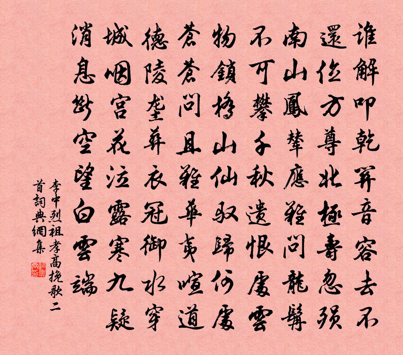 詩詞名句歷史字典書法欣賞書法字典國語詞典說文解字康熙字典古漢語字典標 題 作 者 詩 句 烈祖孝高輓歌二首作者:李中 朝代:唐代烈祖孝高輓歌二首原文誰解叩乾關,音容去不還。位方尊北極,壽忽殞南山。鳳輦應難問,龍髯不可攀。千秋遺恨處,雲物鎖橋山。仙馭歸何處,蒼蒼問且難。華夷喧道德,陵壟葬衣冠。御水穿城咽,宮花泣露寒。九疑訊息斷,空望白雲端。詩詞問答問:烈祖孝高輓歌二首的作者是誰?答:李中問:烈祖孝高輓歌二首寫於哪個朝代?答:唐代問:烈祖孝高輓歌二首是什麼體裁?答:五律李中烈祖孝高輓歌二首書法欣賞烈祖孝高輓歌二首書法作品注釋全唐詩:卷748-33詩詞推薦甲戌冬屬疾賜告二首宋庠〔宋代〕恩告偃衡蓽,年華飛琯灰。右眠安佛脅,深息養仙胎。數犯稽違禁,誰憐濩落材。使軺均病粟,更自囅然咍。壽丘曹王邁〔宋代〕三分長月一分過,天產真仙積慶多。西國玉枝家世襲,霸陵銅狄手長摩。功名本自歸談笑,壽考何勞著詠歌。行直靜觀堂十偈汪晫〔宋代〕長空一望如水碧,泉潤幽幽風淅淅。驚人暑退寒漸生,蓼染春紅映素壁。雜劇·錦雲堂暗定連環計佚名〔元代〕第一折(淨扮董卓領外扮李儒、李肅、卒子上,詩云)擁兵入衛立奇功,文武群臣避下風。九錫恩深猶未厭,私心南園四首陸游〔宋代〕安用移封向酒泉,醉鄉只擬乞南園。更添小閣臨灘石,一洗人間歌吹喧。【雙調】慶東原_嘆世拔山力馬致遠〔元代〕嘆世拔山力,舉鼎威,暗鳴叱吒千人廢。陰陵道北,烏江岸西,休了衣錦東歸,不如醉還醒,醒而醉。明月閒旌旆題鹿門山絕頂升雲亭項安世〔宋代〕上到山頭十八盤,貪高不計足心酸。年來學力荒唐甚,羞向升雲頂上看。送程給事知越州謝景溫〔宋代〕青瑣初辭佩守符,過家衣錦耀鄉閭。丹心忽厭承明直,白首猶刊麗正書。滿目湖山真吏隱,半空樓閣信仙居。若耶詠史下慕容恪陳普〔宋代〕五族交飛日月昏,就中造休尚堪論。景雲峰起龍城裹,猶為遺黎憶太原。明月逐人來(壽仙翁)史浩〔宋代〕莫嫌春淺。寒威俱斂。陽和至此時方見。木君敷令,把雪霜掃斷。要集德星勝伴。為有仙翁,正爾名喧蕃漢。眉壽廣謫仙怨·胡塵犯闕沖關竇弘余〔唐代〕天寶十五載正月,安祿山反,陷沒洛陽。王師敗績,關門不守。車駕幸蜀,途次馬嵬驛,六軍不發,賜貴妃自盡,游滄浪亭袁說友〔宋代〕出門猶未識滄浪,勝日能銷一詠觴。綠障千巒森羽戟,翠綃十頃颭池塘。清談杖履窮幽徑,歸路籃輿帶夕陽。豈是酴醾金沙二花合發王安石〔宋代〕相扶照水弄春柔,發似矜誇歛似羞。碧合晚雲霞上起,紅爭朝日雪邊流。我無丹白知如夢,人有朱銳見即愁。疑此春雨漫興袁易〔元代〕日日春陰只欲眠,強尋南陌復東阡。猶殘碧樹花多少,莫惜金尊酒十千。象管烏絲題往事,玉簫錦瑟負華年。愁來張王臣載酒約同過梁和仲既以風雨大作舉杯相趙蕃〔宋代〕只疑寒食無風雨,不料今晨頓如許。縱然風雨敢怨尤,留得佳人駐南浦。佳人雖駐亦何為,杯酒竟成孤晤語。巴陵贈妓人李群玉〔唐代〕誰家少女字千金,省向人間逐處尋。今日分明花里見,一雙紅臉動春心。氵隱亭元好問〔金代〕春物已清美,客懷自幽獨。危亭一徘徊,翛然若新沐。宿雲淡野川,元氣浮草木。微茫盡楚尾,平遠疑杜曲。生平初冬山居即事十首吳芾〔宋代〕歸來非計失,事少得心寬。村落年方稔,庭闈病復安。詩當隨景賦,酒莫放杯乾。插架書還在,仍容子細看。題錢則父凜對軒軒有老檜奇甚張榘〔宋代〕老紅落盡蒼苔院,萬物隨時自流轉。蒼然古檜夜窗前,獨抱寒姿聳孤榦。幽人丈室空地埃,風聲月影共徘徊。樹兮曹主簿涇自卜壽藏追范石湖韻謹依虛谷使君例汪炎昶〔宋代〕醉吟且傍釣硯揪,墳上何曾酒到劉。從古英雄皆地下,向家掃拜尚原頭。光陰且勒私顏子,螻曦那知望孔丘。名在名句推薦楚天千里清秋,水隨天去秋無際。辛棄疾《水龍吟·登建康賞心亭》 山中也有千年樹,世上難逢百歲人。佚名《增廣賢文·上集》 西登香爐峰,南見瀑布水。李白《望廬山瀑布水二首》 無言獨上西樓,月如鉤。寂寞梧桐深院鎖清秋。李煜《相見歡·無言獨上西樓》 湘女歸魂,佩環玉冷無聲,凝情誰訴。吳文英《過秦樓·黃鐘商芙蓉》 不覺碧山暮,秋雲暗幾重。李白《聽蜀僧濬彈琴 / 聽蜀僧浚彈琴》 一觴雖獨盡,杯盡壺自傾。陶淵明《飲酒·其四》 小池寒綠欲生漪,雨晴還日西。秦觀《阮郎歸·春風吹雨繞殘枝》 積薄而為厚,聚少而為多劉向《戰國策·秦四·或為六國說秦王》 胡馬嘶風,漢旗翻雪,彤雲又吐,一竿殘照。時彥《青門飲·寄寵人》