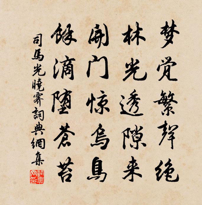 詩詞名句歷史字典書法欣賞書法字典國語詞典說文解字康熙字典古漢語字典標 題 作 者 詩 句 曉霽作者:司馬光 朝代:宋代曉霽原文夢覺繁聲絕,林光透隙來。開門驚烏鳥,余滴墮蒼苔。詩詞問答問:曉霽的作者是誰?答:司馬光問:曉霽寫於哪個朝代?答:宋代問:司馬光的名句有哪些?答:司馬光名句大全司馬光曉霽書法欣賞曉霽書法作品詩詞推薦丙辰年鄜州遇寒食城外醉吟五首韋莊〔唐代〕滿街楊柳綠絲煙,畫出清明二月天。好是隔簾花樹動,女郎撩亂送鞦韆。雕陰寒食足遊人,金鳳羅衣濕麝薰。腸斷守齋和張倅古岩詩予用韻賦三絕呈守齋陳鑒之〔宋代〕貳車林下喜逢僧,眼底千峰逸興生。五馬未游心已到,吟箋零亂岫雲清。扇子詩李石〔宋代〕手栽楊柳喚春歸,喚得黃鸝語碧枝。驚起南窗一覺睡,滿庭花影日高時。郊廟歌辭享太廟樂章大定舞李回〔唐代〕受天明命,敷佑下土。化時以儉,衛文以武。氛消夷夏,俗臻往古。億萬斯年,形於律呂。壽安雜詩十首永濟渡二首司馬光〔宋代〕洛水寒可涉,長汀柳飛葉。節物行無期,自與幽懷愜。宿嘉興新城市董嗣杲〔宋代〕泛秋入禾鄉,鈍舟無期程。西風吹官河,其壤惟新城。雲圍畎畝遍,星零聚落盈。前畈出頑獷,有可敵無勍。梵坊淳化鄉飲酒三十三章佚名〔宋代〕瞻彼南陔,時物嘉良。有泉清泚,有蘭聲香。晨飲是汲,夕膳是賞。慈顏未悅,我民靡遑。和趙積中白蓮三首王之道〔宋代〕翠蓋亭亭水滿塘,六銖新制帶天香。晚來扶洗嬌無力,盡斗冰肌不鬥妝。夏冰歌韋應物〔唐代〕出自玄泉杳杳之深井,汲在朱明赫赫之炎辰。九天含露未銷鑠,閶闔初開賜貴人。碎如墜瓊方截璐,粉壁生寒象筵春雪呈張仲謀黃庭堅〔宋代〕暮雪霏霏若撒鹽,須知千隴麥纖纖。夢闌半枕聽飄瓦,曉起高堂看入簾。剩與月明分夜砌,即成春溜滴晴檐。萬金和陶淵明己酉歲九日詩一首趙蕃〔宋代〕山中無曆日,不知冬已交。起行視林園,草木如半凋。黃花獨何為,亭亭有餘高。俯不愧轉蓬,仰何羨凌霄。當其再和趙知錄韻三首吳潛〔宋代〕只道梅花已亂飛,何須點綴謝莊衣。獨欣凍死安西虜,戴取狐巴馬上歸。傷老姜特立〔宋代〕老翁足力北,踉蹌如小兒。須杖乃能行,動步憂欹危。發禿生細毛,正似出胎時。忽復長兒齒,輔車兩相依。還童玉漏遲 泛舟東溪劉因〔元代〕故園平似掌。人生何必,武陵溪上。三尺蓑衣,遮斷紅塵千丈。不學東山高臥,也不似、鹿門長往。君試望。遠山壽星明/沁園春佚名〔宋代〕玉露迎寒,金風薦冷,正蘭桂香。覺秋光過半,日臨三九,蔥蔥佳氣,藹藹琴堂。見說當年,申生穀旦,夢葉長庚田家趙崇嶓〔宋代〕雞豚白酒樂豐年,飽即高眠不問天。少長有恩相爾汝,淳風應似伏羲前。彭衙行(郃陽縣西北有彭衙城)杜甫〔唐代〕憶昔避賊初,北走經險艱。夜深彭衙道,月照白水山。盡室久徒步,逢人多厚顏。參差谷鳥吟,不見遊子還。痴女禪人並化主寫真求贊釋正覺〔宋代〕廓然而瑩,了無餘影。卓爾而存,豈有他痕。靜非像也,徹見其源。動順緣也,萌發其根。用綿綿兮攪不渾。沁園春姚勉〔宋代〕一部周官,學問淵源,山齋得來。最雄姿直氣,不塗脂粉,仙風道骨,不涴塵埃。萬里青雲,相期闊步,底事向天書睢陽事後黃庭堅〔宋代〕莫道睢陽覆我師,再興唐祚匪公誰。流離顛沛義不辱,去就死生心自知。政使賀蘭非長者,豈妨南八是男兒。乾坤名句推薦半夜銜枚,滿城深雪,忽已亡懸瓠。李綱《念奴嬌·憲宗平淮西》 銅華滄海,愁霾重嶂,燕北雁南天外。吳文英《永遇樂·乙巳中秋風雨》 酌酒以自寬,舉杯斷絕歌路難。鮑照《擬行路難·其四》 想當年,金戈鐵馬,氣吞萬里如虎。辛棄疾《永遇樂·京口北固亭懷古》 欲說還休,卻道“天涼好個秋”!辛棄疾《醜奴兒·書博山道中壁》 夫嚴家無悍虜,而慈母有敗子。韓非及後人《韓非子·顯學》 遙看孟津河,楊柳郁婆娑。佚名《折楊柳歌辭五首》 須愁春漏短,莫訴金杯滿。韋莊《菩薩蠻·勸君今夜須沈醉》 人生不相見,動如參與商。杜甫《贈衛八處士》 天下英雄誰敵手?曹劉。生子當如孫仲謀辛棄疾《南鄉子·登京口北固亭有懷》