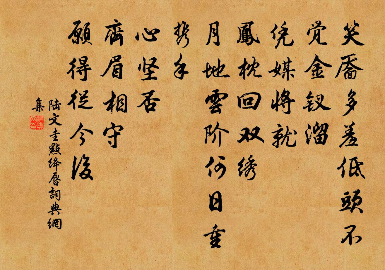 詩詞名句歷史字典書法欣賞書法字典國語詞典說文解字康熙字典古漢語字典標 題 作 者 詩 句 點絳唇作者:陸文圭 朝代:元代點絳唇原文笑靨多羞,低頭不覺金釵溜。憑媒將就。鳳枕回雙繡。月地雲階,何日重攜手。心堅否。齊眉相守。願得從今後。詩詞問答問:點絳唇的作者是誰?答:陸文圭問:點絳唇寫於哪個朝代?答:元代問:點絳唇是什麼體裁?答:詞陸文圭點絳唇書法欣賞點絳唇書法作品詩詞推薦留別梁任南漢挪路盧梁啓超〔清代〕瀝血狗一杯狗,與狗君兄弟交狗,君母即我母,君仇即吾仇。況我實君累,君更不我尤,我若不報君,狗彘之不猶用夾穀子括吳山晚眺韻十首方回〔宋代〕泰伯封疆四望寬,勝將吳越舊書觀。苧羅山下春才到,麋鹿台邊沼已寒。不有采香專怙寵,可能嘗膽便除殘。今年留題鑒遠樓三首李彌遜〔宋代〕憑虛瞰碧與雲浮,只有閒身盡日留。更擬夢回還獨上,來看殘夜水明樓。應天長周邦彥〔宋代〕條風布暖,霏霧弄晴,池台遍暖春色。正是夜堂無月,沈沈暗寒食。梁間燕,社前客,似笑我、閉門愁寂。亂花過擬九頌雁湖程公許〔宋代〕水平湖兮溶溶,雁鳴秋兮雝雝,氣相求兮聲相應,渺萬里兮葭葺叢。晴雲淡兮天宇清,行不亂兮字縱橫。伊美人兮潮熱華岳〔宋代〕南方有神名祝融,發赭面丹唇朱紅。執鞭入海驅赤龍,火車勒駕燒長空。千驂萬乘如聯轡,烈焰騰騰灼天地。九霄別眉山源上人員興宗〔宋代〕我生喜際招提客,欲宜漚幻子塵色。偶然揮斥仍六極,無相光中豈南北。上人得我慰寂寞,相與含笑了一默。生死贈別鄭秋蕃兼謝惠畫梁啓超〔清代〕魯孱漆室泣,周蠢嫠緯悲,謀國自有肉食輩,乾卿甚事,胡乃長嘆而累欷?覆巢之下無完卵,智者怵惕愚者嬉,天酬令狐相公六言見寄劉禹錫〔唐代〕已嗟別離太遠,更被光陰苦催。吳苑燕辭人去,汾川雁帶書來。愁吟月落猶望,憶夢天明未回。今日便令歌者,唱次韻子都兄鮑庵芍藥李洪〔宋代〕春歸鶯老禁無音,天數紅芳著意深。姝色自應傾一國,多情向惜費千金。如迎如舞緣風拆,不淡不深愁雨侵。宜與虎柙葉茵〔宋代〕生長古林丘,擒來鐵繫囚。休憐廣變豹,尚覺氣吞牛。檻陷終難況,咆哮亦可休。山中藜藿少,君合早為謀。垂虹亭觀打魚斫鱠四首楊萬里〔宋代〕橋柱疏疏四寂然,亭前突出八魚船。一聲磔磔鳴榔起,驚出銀刀躍玉泉。百年吟邵雍〔宋代〕百年嗟荏苒,千里痛蕭條。忍逐東流水,無斯任所飄。裴墳周端臣〔宋代〕賣船穿僻徑,墳古最幽深。山近風常冷,松蟋晝亦陰。來時無速騎,歸路有鳴禽。寄語城居者,何人肯訪尋。臨泉寺徐瑞〔宋代〕扁舟駐寒瀨,輕策到臨泉。僧說黃巢事,碑鑱慶曆年。幽花荒甃晚,落木古城煙。興廢俱陳跡,相看一茫然。黃道士出爻戴復古〔宋代〕林屋何瀟灑,權為羽士家。客來多載酒,僧至自煎茶。試墨題新竹,攜筇數落花。飲中忙過日,無暇問丹砂。夜坐陸游〔宋代〕山城意象自蕭然,況是高齋作雪天。漸暗玉蟲寒有燼,欲殘金鴨暖無煙。衰容病後如添歲,遙夜冬來抵過年。安得再次贈張學錄韻十詩陳造〔宋代〕李蔡下中爾,萬目指騫騰。何蕃頭欲白,秋窗耿青燈。寄潘致虛項安世〔宋代〕長憶潘居士,相望今幾州。生涯溫飽未,故舊往還不。問訊憑雙鯉,觀身渺一漚。湖南元好住,吾欲具扁舟。贈韋評事儹戴叔倫〔唐代〕與道共浮沈,人間歲月深。是非園吏夢,憂喜塞翁心。細草誰開徑,芳條自結陰。由來居物外,無事可抽簪。名句推薦風回小院庭蕪綠,柳眼春相續。李煜《虞美人·風回小院庭蕪綠》 萬里妾心愁更苦,十春和淚看嬋娟。華清淑《望江南·燕塞雪》 桃花塢裏桃花庵,桃花庵裏桃花仙。唐寅《桃花庵歌》 天涯地角有窮時,只有相思無盡處。晏殊《玉樓春·春恨》 洊雷,震;君子以恐懼修省。佚名《易傳·象傳下·震》 金風飄菊蕊,玉露泫萸枝。韋安石《奉和九日幸臨渭亭登高應制得枝字》 歸雁橫秋,倦客思家。張可久《折桂令·九日》 古岩泉滴滴,幽谷鳥關關。令狐楚《賦山 / 一七令·山》 休說鱸魚堪膾,盡西風,季鷹歸未?辛棄疾《水龍吟·登建康賞心亭》 玉樹歌殘王氣終,景陽兵合戍樓空。許渾《金陵懷古》