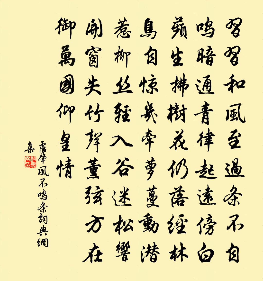 詩詞名句歷史字典書法欣賞書法字典國語詞典說文解字康熙字典古漢語字典標 題 作 者 詩 句 風不鳴條作者:盧肇 朝代:唐代風不鳴條原文習習和風至,過條不自鳴。暗通青律起,遠傍白蘋生。拂樹花仍落,經林鳥自驚。幾牽蘿蔓動,潛惹柳絲輕。入谷迷松響,開窗失竹聲。薰弦方在御,萬國仰皇情。詩詞問答問:風不鳴條的作者是誰?答:盧肇問:風不鳴條寫於哪個朝代?答:唐代問:風不鳴條是什麼體裁?答:五排盧肇風不鳴條書法欣賞風不鳴條書法作品注釋全唐詩:卷551-4詩詞推薦飛練鄧深〔宋代〕見說天孫巧一機,銀河練就雪爭輝。長風吹下三千尺,只恐 * 合得衣。閏月二日雨三日復雨寄斯遠三首趙蕃〔宋代〕無人南澗游,老我北窗臥。雨為洗炎蒸,身成起頹情。幽花曜叢叢,新竹排個個。是中有途詩,獨唱誰其和。懷君雨歇劉子翬〔宋代〕雨歇長虹淡欲收,疏疏寒靄暮依樓。西風滿院催搖落,已覺梧桐不耐秋。和劉明仲都曹見別三首蘇頌〔宋代〕久污朝寵老非宜,祿厚躬間不爾虧。優詔還令使真室,特恩仍免覲京師。力疲都是垂頭馬,志適何殊曳尾龜。年事又次韻宋茂叔送行五絕兼謝修叔趙蕃〔宋代〕山到窮時一徑開,數松幾竹與縈迴。我歸釀黍仍鋤菜,準擬籃輿窈窕來。和陳天予岩桂吳芾〔宋代〕乞身未遂歸岩谷,滿面塵埃慵靧沐。鈴齋獨坐更悲秋,喜見吾人駐車轂。吾人別久正懷思,一旦渴心還慰沃。天公南鄉子(張子儀席上作)管鑒〔宋代〕檐外雪紛紛。霧閣雲窗氣自溫。謾道使台霜樣峻,情親。引到壺中別有春。尊酒負殷勤。病減杯中量幾分。十五年暗香吳潛〔宋代〕曉霜一色。正恁時隴上,征人橫笛。驛史不來,借問孤芳為誰折。休說和羹未晚,都付與、逋仙吟筆。算只是,野早發赴洞庭舟中作白居易〔唐代〕閶門曙 * 蒼蒼,星月高低宿水光。棹舉影搖燈燭動,舟移聲拽管弦長。漸看海樹紅生日,遙看包山白帶霜。出郭歸棹蘇泂〔宋代〕形役何時已,淒涼莫更論。雁啼雲背月,人語水邊村。十月冬猶暖,三杯酒易昏。悠悠信歸棹,今夜宿誰門。袁長官女詩(題峽山僧壁)佚名〔唐代〕剛被恩情役此心,無端變化幾湮沈。不如逐伴歸山去,長笑一聲煙霧深。同皇甫侍御齋中春望見示之作獨孤及〔唐代〕望遠思歸心易傷,況將衰鬢偶年光。時攀芳樹愁花盡,晝掩高齋厭日長。甘比流波辭舊浦,忍看新草遍橫塘。因君任伯仲時德升用均你韻送德父守菑川邀奈同賦傅察〔宋代〕妙齡擢秀如黃童,藉甚詞林振古風。瀾翻千載常在口,磊落萬卷獨蟠胸。不將龜筮論從逆,獨向詩書有高識。琳宮好事近汪莘〔宋代〕風日未全春,又是春來風日。不出方壺門戶,見東皇訊息。此時春事苦無多,春意最端的。卻被草牙引去,向柳梢失調名佚名〔宋代〕恩愛頓成離別恨。久欲乞歸未得一日蒙恩放歸不勝欣喜塗中得十吳芾〔宋代〕路傍遙見一山居,歡喜猶如見故廬。見似故該猶自喜,如今到後喜何如。浪淘沙(觀潮作)曾覿〔宋代〕一線海門來。雪噴雲開。崑山移玉下瑤台。捲地西風吹不斷,直到蓬萊。羯鼓譟春雷。鼉舞蛟回。歌樓鼓吹夕陽催雜詠五言五首劉克莊〔宋代〕傳呼尤赫赫,變滅忽休休。鴻筆銘勳績,蟬冠斂髑髏。春夜喜雪有懷王二十二白居易〔唐代〕夜雪有佳趣,幽人出書帷。微寒生枕席,輕素封階墀。坐罷楚弦曲,起吟班扇詩。明宜滅燭後,淨愛褰簾時。窗引朝中措(寄元立)韓淲〔宋代〕薰風兩節照稽山。三百里湖間。鏡上誰為賀老,棹船能伴官閒。今年壽日,不妨吟嘯,還上清班。為寄長生新曲,名句推薦山不在高,有仙則名水不在深,有龍則靈劉禹錫《陋室銘》 而天下皆曰其力也,必不能曰我見命焉。墨子《墨子·36章 非命(中)》 但怪得、當年夢緣能短。吳文英《三姝媚·過都城舊居有感》 陰晴圓缺都休說,且喜人間好時節。徐有貞《中秋月·中秋月》 津橋春水浸紅霞,煙柳風絲拂岸斜。雍陶《天津橋望春》 只匆匆眺遠,早覺閒愁掛喬木。史達祖《八歸·秋江帶雨》 車轔轔,馬蕭蕭,行人弓箭各在腰。杜甫《兵車行》 貴上極則反賤,賤下極則反貴。司馬遷《史記·貨殖列傳》 漫向寒爐醉玉瓶,喚君同賞小窗明。陸游《浣溪沙·和無咎韻》 空山梵唄靜,水月影俱沉。納蘭性德《水調歌頭·題西山秋爽圖》