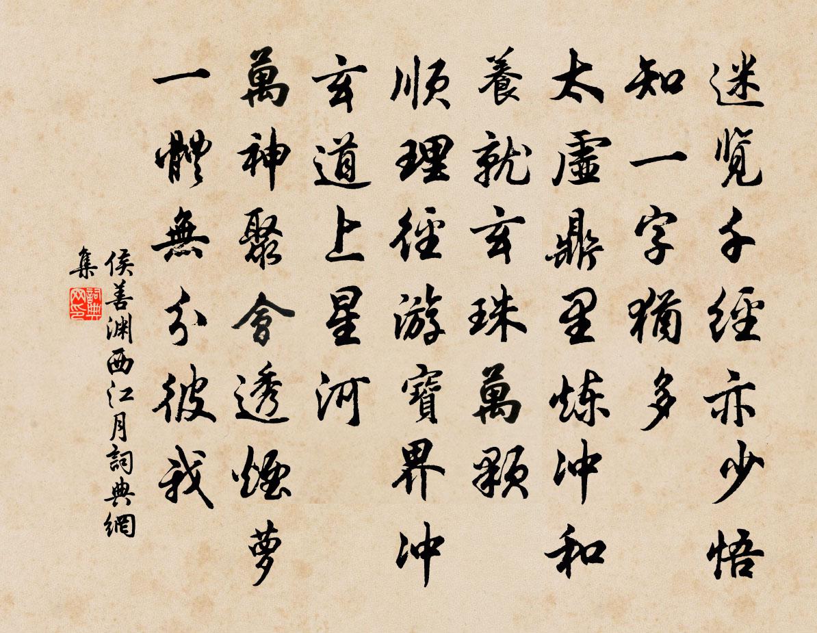 詩詞名句歷史字典書法欣賞書法字典國語詞典說文解字康熙字典古漢語字典標 題 作 者 詩 句 西江月作者:侯善淵 朝代:元代西江月原文迷覽千經亦少,悟知一字猶多。太虛鼎里煉沖和。養就玄珠萬顆。順理徑游寶界,沖玄道上星河。萬神聚會透煙蘿。一體無分彼我。詩詞問答問:西江月的作者是誰?答:侯善淵問:西江月寫於哪個朝代?答:元代問:西江月是什麼體裁?答:詞侯善淵西江月書法欣賞西江月書法作品詩詞推薦晚飲劉子翬〔宋代〕招提聊駐屐,卻去白雲堆。老眼看山仙,余懷向酒開。晚涼微雨送,秋意一蟬催。醉裹揮犀妙,方知有逸才。叢翠亭歐陽修〔宋代〕柳色滿重城,迢迢出翠甍。春雲依檻暖,夕照落山明。走馬章街曉,翻鴻洛浦晴。清樽但留客,桴鼓晝無驚。梁廣文歸自襄陽作古樂章迎之陳造〔宋代〕自君之出矣,饑民日北首。春從二天來,共拜更生手。未議解倒垂,促膝此何有。非君面揚榷,誰有筆連線埠。竹溪釋普濟〔宋代〕漱石穿崖落落,隨流截流自瞞。窮到不知源處,風枝雨葉蕭然。寄題悠然閣三絕句張元乾〔宋代〕誰標此閣作悠然,萬事無非信手拈。參得東籬把菊意,不妨老遠引陶潛。曉枕范成大〔宋代〕病夫心口相語,何日佳眠似渠?舒慘常隨天氣,關心窗暗窗明。日晏扶頭未起,喚人先問陰晴。招弟輩飲次韻陳著〔宋代〕淺量能消酒幾杯,爭如俗子厭人來。明朝定到梅山下,不管梅花開未開。御街行 送王君冕二首王沂〔元代〕煙中列岫青無數。遮不斷、長安路。杜鵑誰道等閒啼,迤邐得人歸去。隴雲秦樹,周台漢苑,滿眼相思處。停杯莫時宣義輓詞秦觀〔宋代〕奮發多難里,哀榮後夜中。妙年推正行,末路見陰功。風雨雙龍合,山川弔鶴空。懸知青史上,又載一於公。讀書至夜分感嘆有賦陸游〔宋代〕老人世間百念衰,惟好古書心未移。斷碑殘刻亦在櫝,時時取玩忘朝飢。推尋點畫到曲折,想見落筆縱橫時。豈惟晚秋登樓王同祖〔宋代〕獨上危樓望落暉。昏鴉歸處遠煙微。湖光洗得秋容淨,爭奈江南雁又飛。游老君洞楊幼輿〔宋代〕陰陽無端更去流,世間盛福難全收。古人一麾恥外郡,今我半刺來邊州。到官未久出按懸,滿眼猺獞森戈矛。誰知句繆鑒〔宋代〕門因好客時時掃,窗為看山面面閉。立春帖子太上皇帝閣周必大〔宋代〕官家閱武向茅籬,供帳都亭看凱還。鳳輦過門親獻壽,春風先已滿人間。昭君怨二首(前首一作董初詩)董思恭〔唐代〕新年猶尚小,那堪遠聘秦。裾衫沾馬汗,眉黛染胡塵。舉眼無相識,路逢皆異人。唯有梅將李,猶帶故鄉春。琵琶題西亭白居易〔唐代〕多見朱門富貴人,林園未畢即無身。我今幸作西亭主,已見池塘五度春。眡役於清偶書四韻寄示幕中賓客祖無擇〔宋代〕經旬一水湄,風土花緇衣。豈敢嗟於役,何當賦式微。雲中晴特秀,花木暖相輝。期子同攜手,春遊事勿違。僮諭吳錫疇〔宋代〕小隱生涯無別事,護持蓑笠傍鷗沙。清泉頻注吟邊硯,活火隨煎飯後茶。趁早須來添鶴料,便忙也去看梅花。焚香贈陳孝子庸梅堯臣〔宋代〕康州水邊龍母墳,草樹蒙蒙起風雨。五色五蛇時往來,野鼠不穴墳上土。嗟哉異類猶厚親,豈彼人兮忘恃怙。果生閒題滕岑〔宋代〕漏雲殘日淒欲陰,占巢歸鷺紛投林。風吹曠野暮色白,山近小窗秋意深。已將夢事了得喪,更憑杯酒寄浮沉。書生名句推薦風遞幽香出,禽窺素艷來。齊己《早梅》 當斷不斷,反受其亂。司馬遷《史記·齊悼惠王世家》 羈心積秋晨,晨積展游眺。謝靈運《七里瀨》 春宵苦短日高起,從此君王不早朝。白居易《長恨歌》 喧啾百鳥群,忽見孤鳳凰。韓愈《聽穎師彈琴》 客思似楊柳,春風千萬條。王安石《壬辰寒食》 赤壁磯頭落照,肥水橋邊衰草,渺渺喚人愁張孝祥《水調歌頭·和龐佑父》 翻被梨花冷看,人生苦戀天涯。張炎《朝中措·清明時節》 碧海年年,試問取、冰輪為誰圓缺?納蘭性德《琵琶仙·中秋》 夜來能有幾多寒,已瘦了、梨花一半。黃升《鵲橋仙·春情》