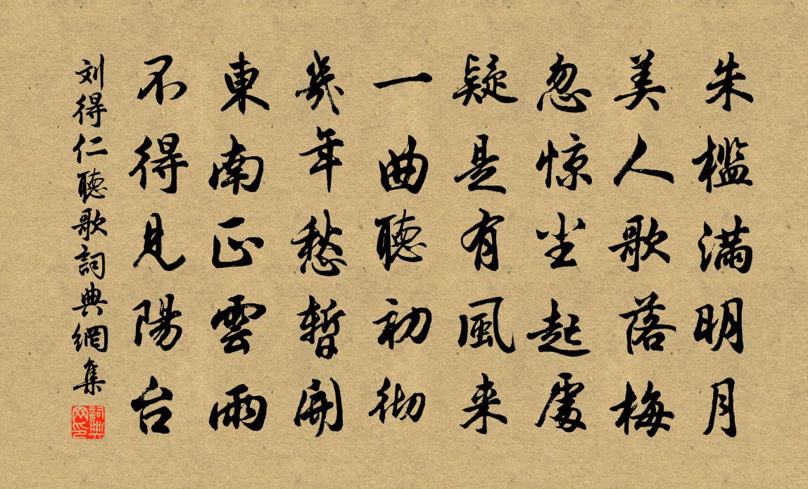 詩詞名句歷史字典書法欣賞書法字典國語詞典說文解字康熙字典古漢語字典標 題 作 者 詩 句 聽歌作者:劉得仁 朝代:唐代聽歌原文朱檻滿明月,美人歌落梅。忽驚塵起處,疑是有風來。一曲聽初徹,幾年愁暫開。東南正雲雨,不得見陽台。詩詞問答問:聽歌的作者是誰?答:劉得仁問:聽歌寫於哪個朝代?答:唐代問:聽歌是什麼體裁?答:五律劉得仁聽歌書法欣賞聽歌書法作品注釋全唐詩:卷544-1詩詞推薦訪隱者遇沈醉書其門而歸韓偓〔唐代〕曉入江村覓釣翁,釣翁沈醉酒缸空。夜來風起閒花落,狼藉柴門鳥徑中。靜中好晃逈〔宋代〕靜中好,冥心歸宴寂。齋己不虛吟,靜是真訊息。中書偶成王安石〔宋代〕忽忽餘年往,茫茫不自知。殷懃照清淺,邂逅見衰遲。輔世無賢業,容身有聖時。歸歟今可矣,何以長人為。使君次韻再賦二首劉克莊〔宋代〕下車不識疾呼聲,郡政清平教亦行。曹相治齊賓蓋老,何侯在楚厚龔生。甘棠通國俱懷惠,遺藁因公得記名。老受春秋戰國門韓昭侯周曇〔唐代〕去年秦伐我宜陽,今歲天災旱且荒。對此不思人力困,樓門何可更高張。藥圃陸游〔宋代〕少年讀爾雅,亦喜騷人語。幸茲身少閒,治地開藥圃。破荒斸瓦礫,引水灌膏乳。玉芝移石帆,金星取天姥。申椒念奴嬌 桃葉渡鄭燮〔清代〕橋低紅板,正秦淮水長,綠楊飄撇。管領春風陪舞燕,帶露含淒惜別。煙軟梨花,雨嬌寒食,芳草催時節。畫船簫獻金陵牧薛大夫白馬詩王曾〔宋代〕白馬披絲練一團,今朝被絆欲行難。雪中放去唯留跡,月下牽來祇見鞍。賂北長鳴天外遠,臨風斜墜耳邊寒。自知大佛寺留題李新〔宋代〕綠篠寒松小翠微,魚聲寂寂鼓聲稀。山頭遠見龜屏出,海嶠誰遷石筍歸。欲得鬼神添嶺檜,卻愁風雨斷天衣。醵錢孤山於石〔宋代〕老梅半樹倚枯槎,路入湖心第幾家。水月荒涼誰復問,遊人多隻看荷花。端午帖子詞二十首九夫人合五首歐陽修〔宋代〕涼生玉宇來風細,日永金徒報漏稀。皎潔冰壺清水殿,三千爭捧赭黃衣。書後湖集趙蕃〔宋代〕我懷蘇養直,不作漢三公。隱墅人安在,春溪草自豐。遺文尚亡恙,斯道未應窮。會與吾尊友,青燈話此翁。望江南張繼先〔宋代〕西源好,幽徑不成斜。山谷隱連無改色,池塘空靜默無瑕。人釣水之涯。仙舫小,人慾盼君家。歸棹日回如覽鏡,自嘲陸游〔宋代〕野叟身常雜傭保,茀圃荒庭自鋤掃。小兒耕養堇堇足,大兒遊宦垂垂老。朝餐未破百瓮齏,晚餉猶存兩囷棗。舂粳瑞鶴仙葛長庚〔宋代〕殘蟾明遠照。正一番霜訊,四山秋老。孤村帶清曉。有鳴鞭歸騎,亂林啼鳥。青簾縹緲。懶行時,持杯自笑。甚年夜泊渭津李昌符〔唐代〕漂漂東去客,一宿渭城邊。遠處星垂岸,中流月滿船。涼歸夜深簟,秋入雨余天。漸覺家山小,殘程尚幾年。九日雨中言懷薛逢〔唐代〕糕果盈前益自愁,那堪風雨滯刀州。單床冷席他鄉夢,紫樧黃花故國秋。萬里音書何寂寂,百年生計甚悠悠。潛將點絳唇(聖節)陳亮〔宋代〕電繞璇樞,此時昌運生真主。慶聯簪組。喜氣生綿宇。宴啟需雲,湛露恩均布。鏘韶滬。鳳歌鸞舞。玉斗飛香醑。鷓鴣天周紫芝〔宋代〕樓上緗桃一萼紅。別來開謝幾東風。武陵春盡無人處,猶有劉郎去後蹤。香閣小,翠簾重。今宵何事偶相逢。行雲和疊山小姑廟王奕〔宋代〕舟如飛葉浪如雷,寄與江神不用猜。貞士偶因諸老出,兩生端為聖門來。但沿沂水求雩瑟,即返嚴灘訪釣台。可惜名句推薦將順其美,匡救其惡,故上下能噲親也司馬遷《史記·管晏列傳》 東風動百物,草木盡欲言。李白《長歌行》 親戚或余悲,他人亦已歌。陶淵明《擬輓歌辭三首》 如來說諸心皆為非心是名為心。鳩摩羅什譯《金剛經·一體同觀》 在天成象,在地成形。脫脫《宋史·志·卷五十二》 孤雲將野鶴,豈向人間住。劉長卿《送方外上人 / 送上人》 君是南山遺愛守,我為劍外思歸客。蘇軾《滿江紅·江漢西來》 寂寞柴門村落里,也教插柳記年華。趙元鎮《寒食書事》 江深竹靜兩三家,多事紅花映白花。杜甫《江畔獨步尋花七絕句》 守身必謹嚴,凡足以戕吾身者宜戒之王永彬《圍爐夜話·第九八則》