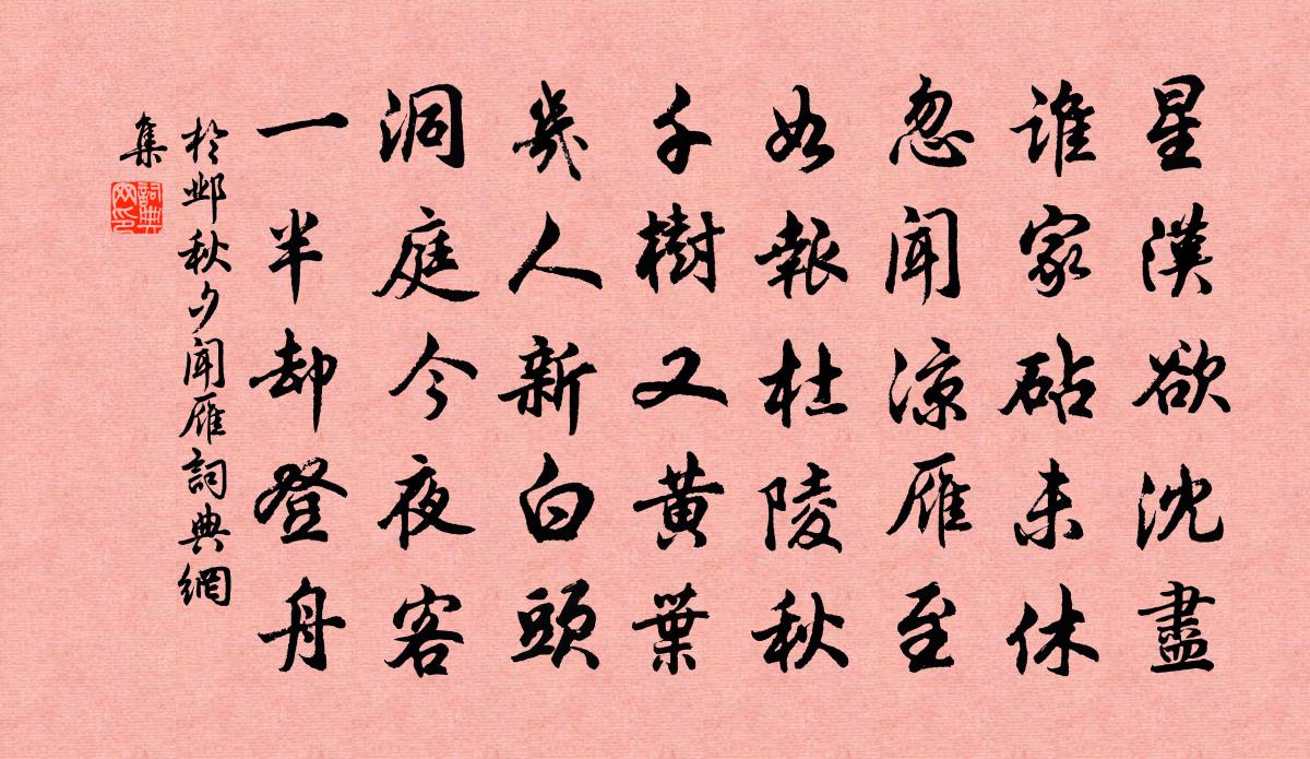 詩詞名句歷史字典書法欣賞書法字典國語詞典說文解字康熙字典古漢語字典標 題 作 者 詩 句 秋夕聞雁作者:於鄴 朝代:唐代秋夕聞雁原文星漢欲沈盡,誰家砧未休。忽聞涼雁至,如報杜陵秋。千樹又黃葉,幾人新白頭。洞庭今夜客,一半卻登舟。詩詞問答問:秋夕聞雁的作者是誰?答:於鄴問:秋夕聞雁寫於哪個朝代?答:唐代問:秋夕聞雁是什麼體裁?答:五律於鄴秋夕聞雁書法欣賞秋夕聞雁書法作品注釋全唐詩:卷725-11詩詞推薦陝府芮城縣群賢涼軒詩李寔〔宋代〕自昔聞南國,於今訟已微。優哉賢墨綬,經始雅軒扉。白日有餘樂,清風知所歸。如何心已花,尚寄玉琴徽。元夕八首陳世崇〔宋代〕買市今宵看帥臣,九衢車馬隘香塵。歡呼百姓同沾惠,無限攙行賣卜人。南鄉子馮延巳〔唐代〕細雨泣秋風,金鳳花殘滿地紅。閒蹙黛眉慵不語,情緒,寂寞相思知幾許。玉枕擁孤衾,挹恨還同歲月深。簾捲曲山茶花徐月溪〔宋代〕山花又晚出,舊不聞圖經。花深嫌少態,曾入蘇公評。邇來亦變怪,紛然著名稱。黃香開最早,與菊為輩朋。紛紅南澗王建〔唐代〕野桂香滿溪,石莎寒覆水。愛此南澗頭,終日湲潺里。入峽蘇轍〔宋代〕舟行瞿唐口,兩耳風鳴號。渺然長江水,千里投一瓢。峽門石為戶,郁怒水力驕。扁舟落中流,浩如一葉飄。呼吸病中示彭德器張元乾〔宋代〕老病無堪正坐貧,交遊相見賴情親。從渠造物小兒戲,不礙維摩老子神。三顧九遷成底事,一區二頃合由人。君侯游洞霄紀實馬元演〔宋代〕甲寅良月初,為拜帥垣檄。遍走三盪所,村落怪荒寂。人謂白升里,杭邑才咫尺。杭有洞霄宮,神仙其窟宅。慣是訶孟子李覯〔宋代〕完廩損階未可知,孟軻深信亦遠疑。岳翁方助為天子,女婿如何弟殺之。步至湖上寓小舟還舍陸游〔宋代〕萬壑爭流地,身閒得縱觀。未能容蟹舍,聊得寄漁竿。遠浦樵風急,空山窆石寒。踟躕不知晚,磔磔有歸翰。杭城風雨中簡子昂戴表元〔宋代〕五月錢塘風雨秋,懷人頻倚面山樓。雲收樹色遙成海,水學江聲暗入溝。一斗盡輸無事飲,千金不買辟寒裘。自憐蛇浦橋下重送嚴維劉長卿〔唐代〕秋風颯颯鳴條,風月相和寂寥。黃葉一離一別,青山暮暮朝朝。寒江漸出高岸,古木猶依斷橋。明日行人已遠,空村景陳與義〔宋代〕黃昏吹角聞呼鬼,清曉持竿看牧鵝。蠶上樓時桑葉少,水鳴車處稻苗多。送王穎叔分教山陽劉宰〔宋代〕向宮來宮食昧遠謀,坐談欲復千古仇。良平不逐勝詭游,宮錐竟作宮生羞。楚山蒼蒼楚水流,甲光向日金鱗稠。酒秋日作高適〔唐代〕端居值秋節,此日更愁辛。寂寞無一事,蒿萊通四鄰。閉門生白髮,回首憶青春。歲月不相待,交遊隨眾人。雲霄用韻戲簡叔孫應時〔宋代〕平生習主簿,經渭極分明。學道深忘味,能詩新有聲。弈寧論勝負,琴不計虧成。獨怕春宵雁,南來動別情。步虛司空圖〔唐代〕阿母親教學步虛,三元長遣下蓬壺。雲韶韻俗停瑤瑟,鸞鶴飛低拂寶爐。客中歲晚呈何宏甫戴復古〔宋代〕歲事費料理,三杯意適然。與其愁度日,曷若醉忘年。桑落冬前酒,梅花雪後天。不知身是客,多謝主人賢。贈無咎八音歌黃庭堅〔宋代〕金馬避世客,談諧玩漢朝。石門抱關人,長往閉寂寥。絲蟲日夜織,勞苦則以食。竹生罹斧斤,高林乃其賊。匏樽和暮秋聞雁有懷趙希逢〔宋代〕數聲雁送故鄉愁,喚起滄江萬頃秋。料想日寒風色慘,可堪寂寞冷沙洲。名句推薦刻薄成家,理無久享;倫常乖舛,立見消亡。朱柏廬《朱子家訓·全文》 莫向西湖歌此曲,水光山色不勝悲。趙孟頫《岳鄂王墓》 葉落風不起,山空花自紅。陳師道《妾薄命·為曾南豐作》 成敗相因,理不常泰李大師、李延壽《南史·本紀·卷一》 不義不昵,厚將崩。左丘明《左傳·隱公·隱公元年》 關山別盪子,風月守空閨。薛道衡《昔昔鹽》 燕子欲歸時節,高樓昨夜西風。晏殊《破陣子·燕子欲歸時節》 古人今人若流水,共看明月皆如此。李白《把酒問月·故人賈淳令予問之》 無半點閒愁去處,問三生醉夢何如。喬吉《折桂令·七夕贈歌者》 欲剪箱中一尺天,吳娥莫道吳刀澀李賀《羅浮山父與葛篇》