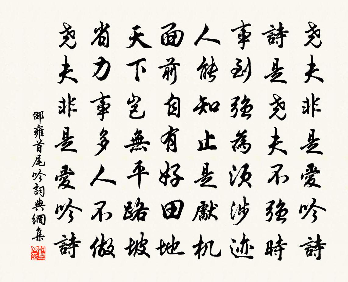 詩詞名句歷史字典書法欣賞書法字典國語詞典說文解字康熙字典古漢語字典標 題 作 者 詩 句 首尾吟作者:邵雍 朝代:宋代首尾吟原文堯夫非是愛吟詩,詩是堯夫不強時。事到強為須涉跡,人能知止是先機。面前自有好田地,天下豈無平路坡。省力事多人不做,堯夫非是愛吟詩。詩詞問答問:首尾吟的作者是誰?答:邵雍問:首尾吟寫於哪個朝代?答:宋代邵雍首尾吟書法欣賞首尾吟書法作品詩詞推薦送胡彥思葉適〔宋代〕秋旱兼春處處祈,微茫欲雨又還非。汝行恰值此時別,不到為霖不肯歸。列岫亭書事釋紹嵩〔宋代〕極浦遙山合翠微,週乃秀色自清機。長江淡淡吞天去,白鳥翩翩接翅飛。屐齒苔痕猶故跡,露沙霜樹映斜暉。牧童蠶謝枋得〔宋代〕養口資身賴以桑,終成王道澤流長。吐絲不羨蜘蛛巧,飼葉頻催織女忙。三起三眠時化運,一生一死命天常。待看謹和老人官山看高子厚修墓洪咨夔〔宋代〕秋風問訊老芙蕖,靖節前行後阿舒。緩策穩過金絡馬,小烹佳勝蔗漿廚。何榮何辱人千古,誰是誰非冢一區。遇著聞泉李鹹用〔唐代〕淅淅夢初驚,幽窗枕簟清。更無人共聽,只有月空明。急想穿岩曲,低應過石平。欲將琴強寫,不是自然聲。虞美人·好風微揭簾旌起孫光憲〔五代〕好風微揭簾旌起,金翼鸞相倚。翠檐愁聽乳禽聲,此時春態暗關情,獨難平。畫堂流水空相翳,一穗香搖曳。教人祝英台近佚名〔宋代〕客氈寒,蘭房悄,金爐爇 * 。好個霜天,消遣正宜酒。嫩橙初截鵝肪,肌膚香透。又還記、吳姬縴手。事難偶。懷寄周元翁十首賀鑄〔宋代〕周郎嗜茗飲,偶與吾好同。贈行發吾寶,紫璧琱雲龍。此實太官物,分甘玉堂公。我曹百石史,藜菽每不充。詩人華嚴真師以詩見貺聊成二章紀其趣尚司馬光〔宋代〕素髮青眸七十餘,未嘗遊學只安居。旁無几杖身輕健,應為心閒得自如。送嚴侍御武元衡〔唐代〕巴檄故人去,蒼蒼楓樹林。雲山千里合,霧雨四時陰。峽路猿聲斷,桃源犬吠深。不須貪勝賞,漢節待南侵。南鄉子(和元規)張繼先〔宋代〕無奈這群迷。味色聲中若系羈。盡任改頭兼換面,何悲。不染伊時不管伊。春去又秋兮。莫遣空逾十二時。好把自初聞得校書郎示同官三絕蘇轍〔宋代〕讀書猶記少年狂,萬卷縱橫曬腹囊。奔走半生頭欲白,今年始得校書郎。百家小邑萬重山,慚愧斯民愛長官。粳稻山堂鞏先生輓詩三首姜特立〔宋代〕綰章南北異,轉首死生分。手澤空遺墨,書籤冷舊芸。行須潘岳誄,碑已蔡邕文。身後無儋石,玄成似子云。解佩令佚名〔宋代〕臉兒端正。心兒峭俊。眉兒長、眼兒入鬢。鼻兒隆隆,口兒小、舌兒香軟。耳垛兒、就中紅潤。項如瓊玉,發如雲宮詞王珪〔唐代〕盆山高疊小蓬萊,檜柏屏風鳳尾開。綠繞金階春水闊,新分一派御溝來。丞相大資葉公輓詞喻良能〔宋代〕德望堂堂重,威名凜凜寒。三年袞衣粲,四海寸心丹。綠野悲裴度,蒼生憶謝安。白頭賓客在,慚痛淚闌乾。桃花園馬上應制張說〔唐代〕林間艷色驕天馬,苑裡穠華伴麗人。願逐南風飛帝席,年年含笑舞青春。雷塘徐振〔唐代〕九重城闕悲涼盡,一聚園林怨恨長。花憶所為猶自笑,草知無道更應荒。詩名占得風流在,酒興催教運祚亡。若問瀔江秋居作貫休〔唐代〕無事相關性自據,庭前拾葉等閒書。青山萬里竟不足,好竹數竿涼有餘。近看老經加澹泊,欲歸少室復何如。面前初夏郊行陳韡〔宋代〕羽檄暫稀槐晝永,出郊遠眺得神清。田間野水縱橫注,林外嬌鶯自在鳴。為羨僧閒逢寺飲,要知民樂繞村行。逢迎名句推薦秋侵人影瘦,霜染菊花肥。沈復《浮生六記·閨房記樂》 成大功者不小苛。劉向《說苑·政理》 記年時、舊宿淒涼,暮煙秋雨野橋寒。吳文英《霜花腴·重陽前一日泛石湖》 論如析薪,貴能破理。劉勰《文心雕龍·論說》 此地動歸念,長年悲倦遊。王籍《入若耶溪》 其進銳者,其退速。孟子《孟子·盡心章句上·第四十四節》 巨屨小屨同賈,人豈為之哉。孟子《孟子·滕文公章句上·第四節》 琉璃鍾,琥珀濃,小槽酒滴真珠紅。李賀《將進酒》 滿隄芳草不成歸,斜日畫橋煙水冷。吳翌鳳《玉樓春·空園數日無芳信》 及茲春未深,數畝猶足佃。王守仁《謫居糧絕請學於農將田南山詠言寄懷》