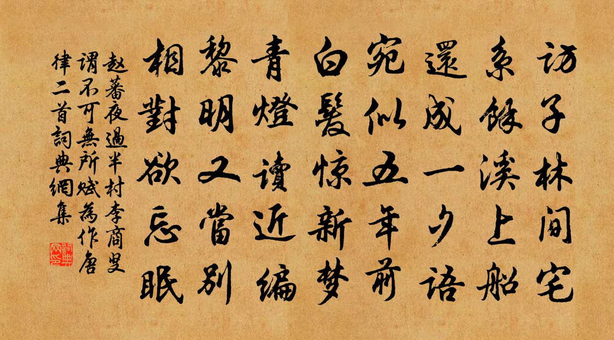 詩詞名句歷史字典書法欣賞書法字典國語詞典說文解字康熙字典古漢語字典標 題 作 者 詩 句 夜過半村李商叟謂不可無所賦為作唐律二首作者:趙蕃 朝代:宋代原文訪子林間宅,系余溪上船。還成一夕語,宛似五年前。白髮驚新夢,青燈讀近編。黎明又當別,相對欲忘眠。詩詞問答問:《夜過半村李商叟謂不可無所賦為作唐律二首》的作者是誰?答:趙蕃問:該詩寫於哪個朝代?答:宋代書法欣賞夜過半村李商叟謂不可無所賦為作唐律二首書法作品詩詞推薦贈逸民詩 八蕭衍〔南北朝〕思懷友朋。遠至歡適。躬開二敬。徑延三益。繾綣故舊。綢繆宿昔。善言無違。相視莫逆。情如斷金。義若投石。雪後過集賢裴令公舊宅有感白居易〔唐代〕梁王捐館後,枚叟過門時。有淚人還泣,無情雪不知。台亭留盡在,賓客散何之?唯有蕭條雁,時來下故池。吊天竺海月辯師三首蘇軾〔宋代〕欲尋遺蹟強沾裳,本自無生可得亡。今夜生公講堂月,滿庭依舊冷如霜。生死猶如臂屈伸,情鍾我輩一酸辛。樂天卜運算元·天生百種愁徐俯〔宋代〕天生百種愁,掛在斜陽樹。綠葉陰陰占得春,草滿鶯啼處。不見生塵步。空憶如簧語。柳外重重疊疊山,遮不斷、樂府詩曹叡〔魏晉〕晝作不輟手。猛燭繼望舒。句劉褒〔宋代〕蘇堤一帶柳陰長。再韻二首楊公遠〔宋代〕榾柮爐紅密掩窗,傷嗟勞役度時光。朝三雖怒暮還四,鳧短難添鶴自長。老憶少年成感慨,吟殘永夜越淒涼。教兒海棠落盡次謝司法韻方岳〔宋代〕花前誰與東西玉,但遣能詩一夔足。雨寒無奈雪飄零,酒醒卻愁香陸續。阿嬌深貯黃金屋,阿環初出華清浴。騎{步蟾宮(妻壽夫)張仲殊〔宋代〕笙歌喜慶爭催曉。篆煙舞、龍鸞縹緲。香羅上、不畫壽仙人,獻一段、長生壽草。一心一意同歡笑。兩心事、卒難讀商君傳二首陳耆卿〔宋代〕大信之信本不約,至誠之誠乃如神。欲識唐虞感通處,泊然無物自相親。和外舅夙興三首黃庭堅〔宋代〕瓜蔓已除壟,苔痕猶上牆。蓬蒿貪雨露,松竹見冰霜。卷幔天垂斗,披衣日在房。無詩嘆不還,千古一潛郎。偈頌一百五十首釋心月〔宋代〕白髮垂垂一葉身,今年貧似去年貧。住山不與山為主,水石煙雲也笑人。屬疾五首宋祁〔宋代〕里旅居仍隘,台家疾見寬。何言漢樸學,正似楚枝官。煦渚藏勞尾,投林戢倦翰。上恩何日報,怯步已蹣跚。江口阻風寄琅山衷老姜特立〔宋代〕人間有淨境,咫尺不易通。今朝解塵縛,始到天人宮。疊嶂擁崔嵬,夏木郁青蔥。白鳥巢半山,掩映畫圖中。高低贈古若之上人王之道〔宋代〕灩潭澄碧見師心,我欲窮源何處尋。萬壑松風酬夜諷,一犁花雨發春吟。不妨契闊三年別,卻得留連數日陰。竹外木蘭花慢 喜玉田至袁易〔元代〕渺仙遊倦跡,乍玄圃,又蒼梧。甚海闊天長,月梁有夢,雁足無書。泠然御風萬里,喜□袍、還對紫霞裾。一自黃劉八窗見訪一夕即別武衍〔宋代〕五年苕上別,別後愧相疎。今夕知何夕,憶渠俄見渠。同持一杯酒,勝寄百寺書。未及論心事,曉風回蹇驢。漫題司空圖〔唐代〕經亂年年厭別離,歌聲喜似太平時。詞臣更有中興頌,磨取蓮峰便作碑。古風其二十五李白〔唐代〕世道日交喪。澆風散淳源。不採芳桂枝。反棲惡木根。所以桃李樹。吐花竟不言。大運有興沒。群動爭飛奔。歸來次韻楊宰雪陳造〔宋代〕對雪動遐想,此情今古同。饒為灞橋句,會奏蔡城功。恥臥袁安屋,思乘列子風。高翔廣樂地,眩旋九霞紅。名句推薦瀚海闌乾百丈冰,愁雲慘澹萬里凝。岑參《白雪歌送武判官歸京》 凡道字,重且舒。勿急疾,勿模糊。李毓秀《弟子規·信》 無事如有事時堤防,可以弭意外之變;有事如無事時鎮定,可以銷局中之危。陳繼儒《小窗幽記·集峭篇》 魏都接燕趙,美女夸芙蓉。李白《魏郡別蘇明府因北游》 同穴窅冥何所望,他生緣會更難期。元稹《遣悲懷三首·其三》 桂花香霧冷,梧葉西風影。高觀國《菩薩蠻·何須急管吹雲暝》 倚闌凝望,獨立漁翁滿江雪。李綱《六么令·次韻和賀方回金陵懷古鄱陽席上作》 隨你官清似水,難逃吏滑如油。馮夢龍《警世通言·卷十五》 若順吾皇意,即無臣子心。棲蟾《送遷客》 飛花兩岸照船紅,百里榆堤半日風。陳與義《襄邑道中》