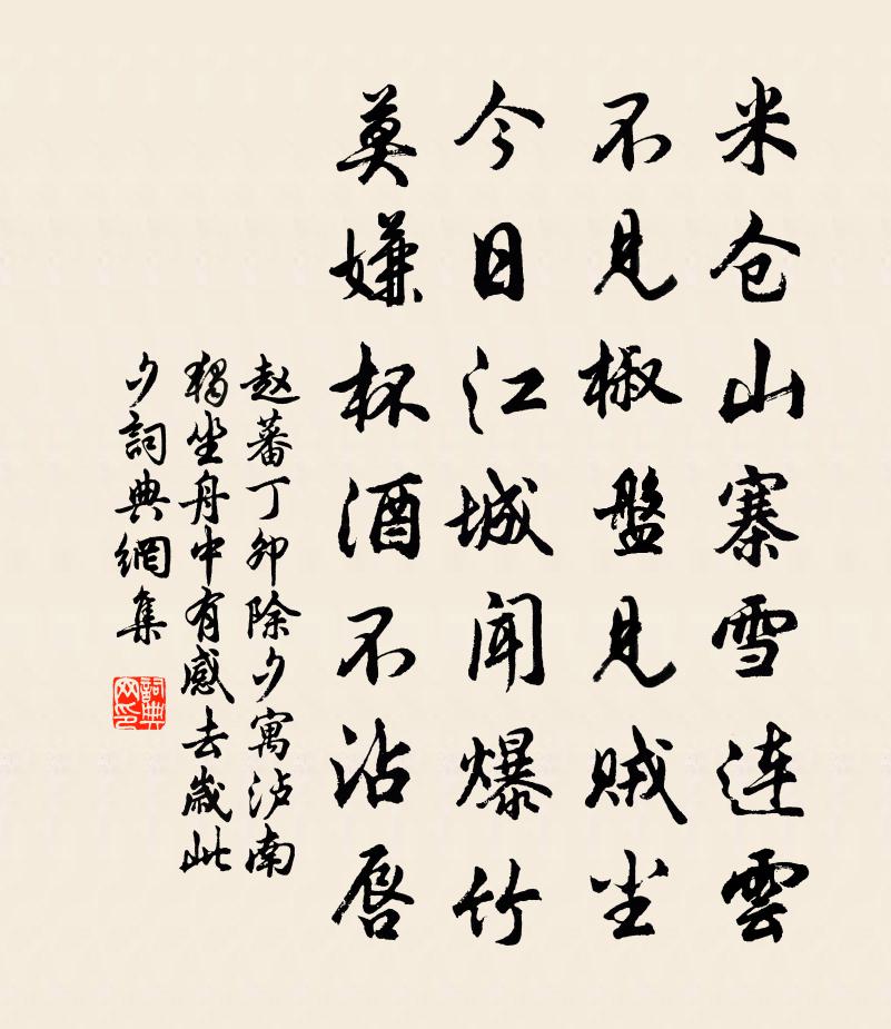 詩詞名句歷史字典書法欣賞書法字典國語詞典說文解字康熙字典古漢語字典標 題 作 者 詩 句 丁卯除夕寓瀘南獨坐舟中有感去歲此夕作者:趙蕃 朝代:宋代原文米倉山寨雪連雲,不見椒盤見賊塵。今日江城聞爆竹,莫嫌杯酒不沾唇。詩詞問答問:《丁卯除夕寓瀘南獨坐舟中有感去歲此夕》的作者是誰?答:趙蕃問:該詩寫於哪個朝代?答:宋代書法欣賞丁卯除夕寓瀘南獨坐舟中有感去歲此夕書法作品詩詞推薦郊居即事一首王阮〔宋代〕涉世足悔吝,杜門安退藏。謗從閒處省,樂向靜中長。薜荔日緣壁,琅玕春透牆。近來無事作,渾以醉為鄉。浣溪沙張炎〔宋代〕艾B63D香消火未殘。便能晴去不多寒。冶遊天氣卻身閒。帶雨移花渾懶看,應時插柳日須攀。最堪惆悵是東闌五更仇遠〔宋代〕雁鳴鶴亦鳴,不待雞戒旦。平生善利心,一鳴思過半。和麟老韻五絕王炎〔宋代〕詩清雖為竹庵編,禪妙元從佛眼傳。用處縱橫能殺活,匣藏不肯試龍泉。晉靈公不君左丘明〔先秦〕 晉靈公不君。厚斂以雕牆。從台上彈人,而觀其辟丸也。宰夫胹熊蹯不熟,殺之,寘諸畚,使婦人載以過朝。馬上作白居易〔唐代〕處世非不遇,榮身頗有餘。勛為上柱國,爵乃朝大夫。自問有何才?兩入承明廬。又問有何政?再駕朱輪車。矧予送進士陳嶢往睦州謁馮郎中章孝標〔唐代〕孤帆幾日程,投刺水邊城。倚棹逢春老,登筵見月生。飲酣杯有浪,棋散漏無聲。太守憐才者,從容禮不輕。送劉長清敏蘇轍〔宋代〕汝州太守臥病年,亹亹猶復能清言。平生雄辯嗟不見,風流尚有曹州存。歷下東遊少相識,歡喜聞君在西邑。舊知過芙蓉嶺對鏡嶺羊斗嶺新嶺塔嶺賦短歌五首方回〔宋代〕千鈞巨石百十萬,亂堆橫峙塞山澗。故今流水作嗚咽,行人厭聞猶喜闞。芙蓉非花鏡非鏡,無可充君耳目玩。第一題清淮樓蘇軾〔宋代〕觀魚惠子台蕪沒,夢蝶莊生冢木秋。惟有清淮供四望,年年依舊背城流。送陳笠峰路教之燕陳著〔宋代〕笠峰秀甲東南郊,面勢雄特根基牢。上與日月星辰交,下走海脈通六鰲。蘊蓄玉金賁山毛,噴泄雲雨蘇焦熬。之子和鄭樞山竹夫人韻黃庚〔宋代〕玉環傾國起胡兵,有色終污後世名,九夏專房何在貌,一身空洞若為情。寵名本自無心得,婦節從來澈骨清。愁見賢者之孝二百四十首韓思復林同〔宋代〕向來曹孟德,曾擬表征西。那得忠孝字,金書作墓題。墨竹梅堯臣〔宋代〕許有盧娘能畫竹,重抹細拖神且速。如將石上蕭蕭枝,生向筆間天意足。戰葉斜尖點映間,透勢虛黍斷還續。粉節題北村六首張載〔宋代〕求富誠非憎執鞭,安貧隨分樂丘園。兩間茅屋青山下,贏得浮生避世喧。醉蓬萊霍安人〔宋代〕正朱明時侯,院宇清和,慶逢佳節。夢應熊羆,堯蓂翻三葉,羅綺如雲,壽杯爭勸,競起歌新闋。瑞氣氤氳,祥雲詠史上劉虞陳普〔宋代〕疽潰中平甲子年,蒲蠃桑椹亦蕭然。幽州別是神仙土,谷石人間三十錢。詠史詩房陵胡曾〔唐代〕趙王一旦到房陵,國破家亡百恨增。魂斷叢台歸不得,夜來明月為?次韻和丁右丞因贈致政張少卿二首宋庠〔宋代〕幾年辭寵解華紳,佛忍莊恬共嗇神。歲晏始知松柏茂。凌雲高節不關春。和韻奉酬王原父集福山之什張元乾〔宋代〕平生契所崇,晚得故人語。驚呼追曩游,世道今如許。中原鞠茂草,萬里盡豺虎。天王巡江濆,對壘眺淮楚。未聞名句推薦及時當勉勵,歲月不待人。陶淵明《雜詩·人生無根蒂》 侵陵雪色還萱草,漏泄春光有柳條。杜甫《臘日》 不知何歲月,得與爾同歸?韋承慶《南中詠雁詩》 曾伴浮雲歸晚翠,猶陪落日泛秋聲。高蟾《金陵晚望》 還背垂虹秋去,四橋煙雨,一宵歌酒。吳文英《瑞龍吟·送梅津》 寂寂柴門村落里,也教插柳記年華。趙鼎《寒食》 冰合井泉月入閨,金缸青凝照悲啼。李白《夜坐吟》 零落棲遲一杯酒,主人奉觴客長壽。李賀《致酒行》 繁華事散逐香塵,流水無情草自春。杜牧《金谷園》 騷屑西風弄晚寒,翠袖倚闌乾。納蘭性德《眼兒媚·詠紅姑娘》
