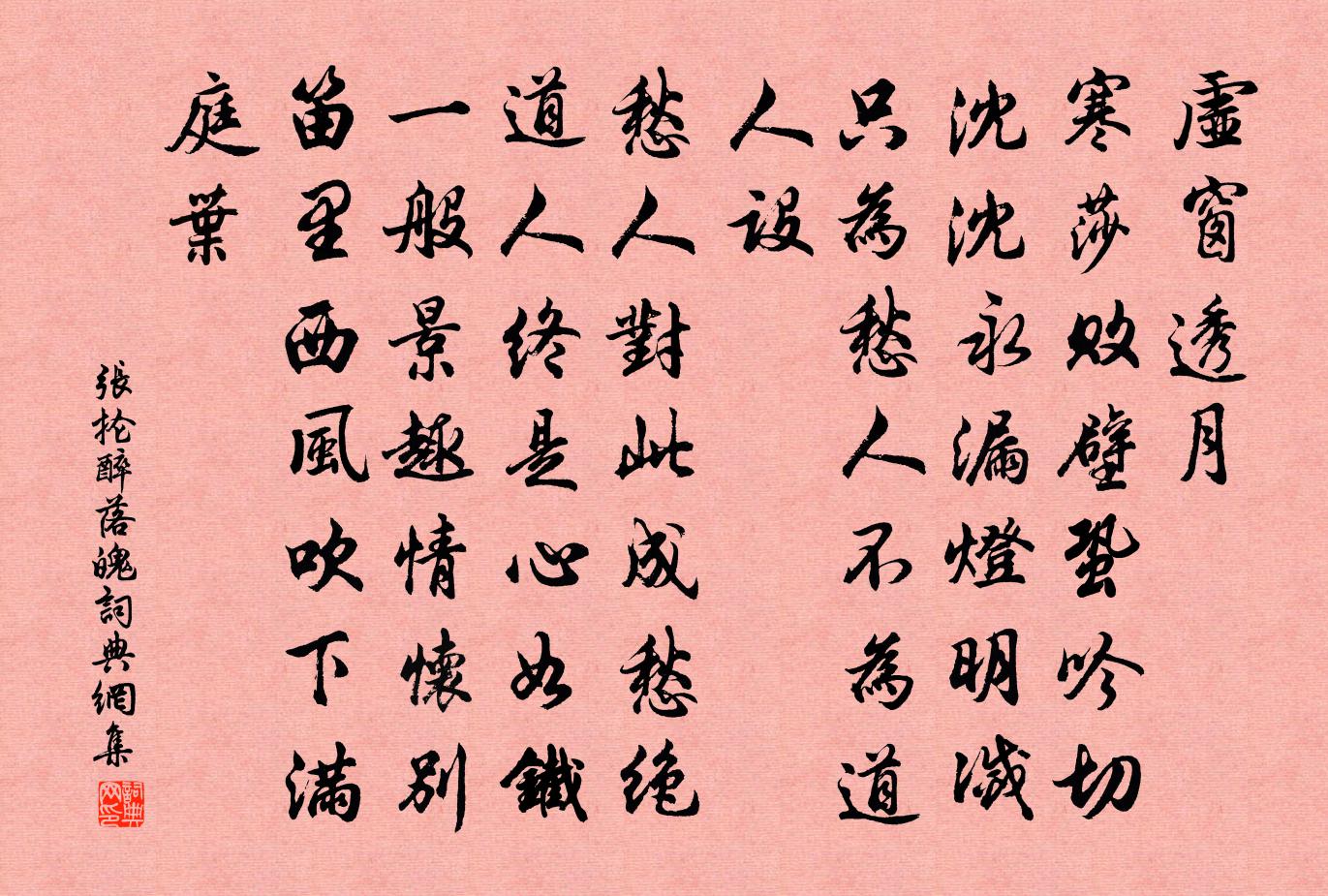 詩詞名句歷史字典書法欣賞書法字典國語詞典說文解字康熙字典古漢語字典標 題 作 者 詩 句 醉落魄/一斛珠作者:張掄 朝代:宋代醉落魄/一斛珠原文虛窗透月。寒莎敗壁蛩吟切。沈沈永漏燈明滅。只為愁人,不為道人設。愁人對此成愁絕。道人終是心如鐵。一般景趣情懷別。笛里西風,吹下滿庭葉。詩詞問答問:醉落魄/一斛珠的作者是誰?答:張掄問:醉落魄/一斛珠寫於哪個朝代?答:宋代問:醉落魄/一斛珠是什麼體裁?答:詞張掄醉落魄/一斛珠書法欣賞醉落魄/一斛珠書法作品詩詞推薦卜運算元·雪月最相宜張孝祥〔宋代〕雪月最相宜,梅雪都清絕。去歲江南見雪時,月底梅花發。今歲早梅開,依舊年時月。冷艷孤光照眼明,只欠些兒會稽頌賀監祠諸葛興〔宋代〕山簇簇兮環湖,水淼淼兮縈紆。人何游兮明鏡,鳥何飛兮畫圖。懷賀老兮今昔,想逸致兮林廬。老之襟兮天闊,老寄崇福源長老釋智愚〔宋代〕一髮千鈞適此時,風前無語皺雙眉。松源正脈將枯竭,浚發靈源復是誰。納涼王維〔唐代〕喬木萬餘株,清流貫其中。前臨大川口,豁達來長風。漣漪涵白沙,素鮪如游空。偃臥盤石上,翻濤沃微躬。漱流題酒家韋莊〔唐代〕酒綠花紅客愛詩,落花春岸酒家旗。尋思避世為逋客,不醉長醒也是痴。答任開叔郎中昆仲相訪邵雍〔宋代〕竹影戰棋罷,閒思安樂窩。曠時稱不見,聯轡幸相過。寵莫兼金比,褒逾華袞多。從來有詩癖,使我遂成魔。道間偶成周弼〔宋代〕彎彎田角路周遭,摘盡柔桑露淺蒿。無限寂寥門半掩,一車偏健夕陽繰。木綿鋪劉克莊〔宋代〕庵遠人稀行未休,風煙絕不類中州。何須更問明朝路,才出南門極目愁。江行四首陳造〔宋代〕帆桅飛去東空明,人倚東風兩翼生。世事快人如此否,日斜三百不留行。冬夜有感李新〔宋代〕蓼蟲常食苦,旅雁自知寒。談士惜捲舌,將軍解愁鞍。雪霜滿天冬夜永,地爐無火青燈殘。功名富踐苦不早,一年偈頌四首釋鹹傑〔宋代〕眼裡耳里絕纖塵,鐵眼銅晴覷不破。蚊子排頭咬鐵釘,上下四維俱匌匝。只將此語報深恩,朵朵紅蓮火里發。華亭山房象山黃大輿〔宋代〕客游厭城市,僧房見岩壑。偉石羅眾峰,寒砂結層堮。為谷既窈窕,置嶺復綿邈。溪源互相注,花草紛已錯。空聞題鄭郎中谷仰山居齊己〔唐代〕檐壁層層映水天,半乘岡壟半民田。王維愛甚難拋畫,支遁憐多不惜錢。巨石盡含金玉氣,亂峰深鎖棟樑煙。秦爭短歌行曹操〔魏晉〕對酒當歌,人生幾何?譬如朝露,去日苦多。慨當以慷,憂思難忘。何以解憂,唯有杜康。青青子衿,悠悠我心。偈頌十二首釋如淨〔宋代〕斬鯨龍頭角,截虎豹爪牙。爛泥團受用不盡,踏著刺方見作家。誰在畫樓沽酒處,相邀來喫趙州茶。江山漁隱圖王冕〔元代〕隔 * 山青欲流,江雲洗盡江風秋。幽人小艇江上游,碧波萬頃無白鷗。我知幽人愛瀟灑,豈是機危鷗不下?浩歌平江清明書所聞見陳藻〔宋代〕早插綠楊檐外去,晚攜黃騰杖頭歸。富者幾家貧者眾,年年漸見賞人稀。金石錄後序李清照〔宋代〕 右金石錄三十卷者何?趙侯德父所著書也。取上自三代,下迄五季,鍾、鼎、甗、鬲、盤、彝、尊、敦之款識【正宮】梁州令南李子昌〔元代〕芳草長亭露帶沙,盼遊子來家。翠消紅減亂如麻,隔妝檯慵梳掠掩菱花。 【賽鴻秋北】我這裡望賓鴻目斷夕陽葉西廬惠冬菊三絕王柏〔宋代〕霜天無物不凋殘,忽見青蕤羽葆攢。欲制頹齡須耐冷,一陽定有落英餐。名句推薦疲馬山中愁日晚,孤舟江上畏春寒。張謂《杜侍御送貢物戲贈》 獨抱濃愁無好夢,夜闌猶剪燈花弄。李清照《蝶戀花·暖雨晴風初破凍》 槐柳野橋邊,行塵暗馬前。齊己《送人游塞》 高情已逐曉雲空。不與梨花同夢。蘇軾《西江月·梅花》 見侮而不鬥,辱也!公孫龍《公孫龍子·跡府》 漢口夕陽斜渡鳥,洞庭秋水遠連天。劉長卿《自夏口至鸚鵡洲夕望岳陽寄源中丞》 鷹擊長空,魚翔淺底,萬類霜天競自由。 * 《沁園春·長沙》 浩氣清英,仙材卓犖,下土難分別丘處機《無俗念·靈虛宮梨花詞》 芳菲歇去何須恨,夏木陰陰正可人。秦觀《三月晦日偶題》 好人之所惡,惡人之所好,是謂拂人之性,災必逮夫身。曾子《大學·第十一章》