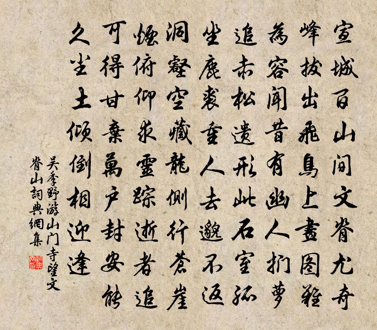 詩詞名句歷史字典書法欣賞書法字典國語詞典說文解字康熙字典古漢語字典標 題 作 者 詩 句 游山門寺望文脊山作者:吳季野 朝代:宋代游山門寺望文脊山原文宣城百山間,文脊尤奇峰。拔出飛鳥上,畫圖難為容。聞昔有幽人,捫蘿追赤松。遺形此石室,孤坐鹿裘重。人去邈不返,洞壑空藏龍。側行蒼崖煙,俯仰求靈蹤。逝者追可得,甘棄萬戶封。安能久塵土,傾倒相迎逢。詩詞問答問:游山門寺望文脊山的作者是誰?答:吳季野問:游山門寺望文脊山寫於哪個朝代?答:宋代吳季野遊山門寺望文脊山書法欣賞游山門寺望文脊山書法作品詩詞推薦立春日有感陳棣〔宋代〕剪彩漫添懷抱惡,簪花空映鬢毛秋。流年舊事陳芻狗,佳節新春報土牛。里社浮沉貧可忍,身名坎壈老宜休。天高登祝融寺蘭若盧肇〔唐代〕祝融絕頂萬餘層,策杖攀蘿步步登。行到月宮霞外寺,白雲相伴兩三僧。湘江漁父齊己〔唐代〕湘潭春水滿,岸遠草青青。有客釣煙月,無人論醉醒。門前蛟蜃氣,蓑上蕙蘭馨。曾受蒙莊子,逍遙一卷經。理公岩楊蟠〔宋代〕日月岩前鳥,秋來不復聞。達人今已化,名擊此山雲。建他解歸詩復徐意一二首李昴英〔宋代〕恨未澄清盡,孤蹤已不安。繆悠臣罪大,感激上恩寬。鄉國三千里,人心百八盤。夢歸今始驗,為我謝言官。七交七首張判官歐陽修〔宋代〕洛城車隆隆,曉門爭道入。連袂紛如帷,文者豈無十。壯矣張太素,拂羽擇其集。遠慕鄴才子,一笑懽相挹。雖有褒中即事於鄴〔唐代〕風吹殘雨歇,雲去有煙霞。南浦足游女,綠蘋應發花。遠鍾當半夜,明月入千家。不作故鄉夢,始知京洛賒。【雙調】新水令_一春常費買景元啟〔元代〕一春常費買花錢,錦營中慣曾游遍。酒斟金叵羅,人伴玉嬋娟。急管繁弦,高樓上恣歡宴。 【駐馬聽】驕馬吟自延安回道中作晁說之〔宋代〕延州紅勝洛州花,打剝工夫阿那家。我亦勞心添病骨,悔將黃卷負年華。眾樂亭吳充〔宋代〕使君新自四明歸,邀我同為眾樂詩。山川可愛惜不見,晝想夕思心為罷。怳然神遇若有得,齎身乃在天之涯。漲海梅花陸游〔宋代〕冰崖雪谷木未芽,造物破荒開此花。神全形枯近有道,意莊色正知無邪。高堅政要飽憂患,放棄何遽愁荒遐。移根用韻酬翟曾二倅和章虞儔〔宋代〕詩成開府讓清新,紙掃溪藤筆弄銀。斗轉蒼龍歸北望,日行黃道傒東巡。人情自是隨時變,天意何私與物春。官里幽事陸游〔宋代〕老大常愁節物催,東皇又挽斗杓回。江天慘慘不成雪,山驛蕭蕭初見梅。隱士寄雲從地肺,游僧問路上天台。戲書寄克齋舅氏趙蕃〔宋代〕不幸書題遂一年,書猶斷絕況詩傳。興來亦復吟喔否,讀罷何當疾痼痊。慷慨初無伏波志,憂愁枉類屈原遷。使來道旁桐花楊萬里〔宋代〕春色來時物喜初,春光歸日興闌余。更無人餞春行色,猶有桐花管領渠。秋興陸游〔宋代〕酌酒桑陰下,邠風入醉歌。何須繩檢外,名教樂還多。偈頌一百一十七首釋紹曇〔宋代〕貧苦芝峰,賞元宵節。宴樂佳賓,將何鋪設。明挑海底燈,細剪亭前月。打拍東山瓦鼓歌,掤領先剌札,樂有餘,賦得花發上林王儲〔唐代〕東陸和風至,先開上苑花。穠枝藏宿鳥,香蕊拂行車。散白憐晴日,舒紅愛晚霞。桃間留御馬,梅處入胡笳。城郭范致政輓詞樓鑰〔宋代〕酒後昇平曲,閒中安樂窩。千金曾累致,一醉竟無何。老驥志空在,孤鸞悲亦多。相望才歲許,托體共山阿。青玉案(贈勉道琵琶人)趙彥端〔宋代〕當年萬里龍沙路。載多少、離愁去。冷壓層簾雲不度。芙蓉雙帶,垂楊嬌髻,弦索初調處。花凝玉立東風暮。曾記名句推薦彩扇紅牙今都在,恨無人、解聽開元曲。蔣捷《賀新郎·夢冷黃金屋》 所謂敬天者,不獨嚴而有禮,當有其實。張廷玉《明史·本紀·卷三》 凡人有疾,不時即治,隱忍冀差,以成痼疾。張仲景《傷寒論·傷寒例》 瀑布風前千尺影,疑瀉銀河一派。朱栴《念奴嬌·雪霽夜月中登樓望賀蘭山作》 旦別河橋楊柳風,夕臥伊川桃李月。宋之問《寒食還陸渾別業》 生前心已碎,死後性空靈。曹雪芹《紅樓夢·第五回》 千里馬常有,而伯樂不常有。韓愈《馬說》 醉後涼風起,吹人舞袖回。李白《與夏十二登岳陽樓》 遠信入門先有淚,妻驚女哭問何如。元稹《得樂天書》 把酒對斜日,無語問西風。楊炎正《水調歌頭·把酒對斜日》