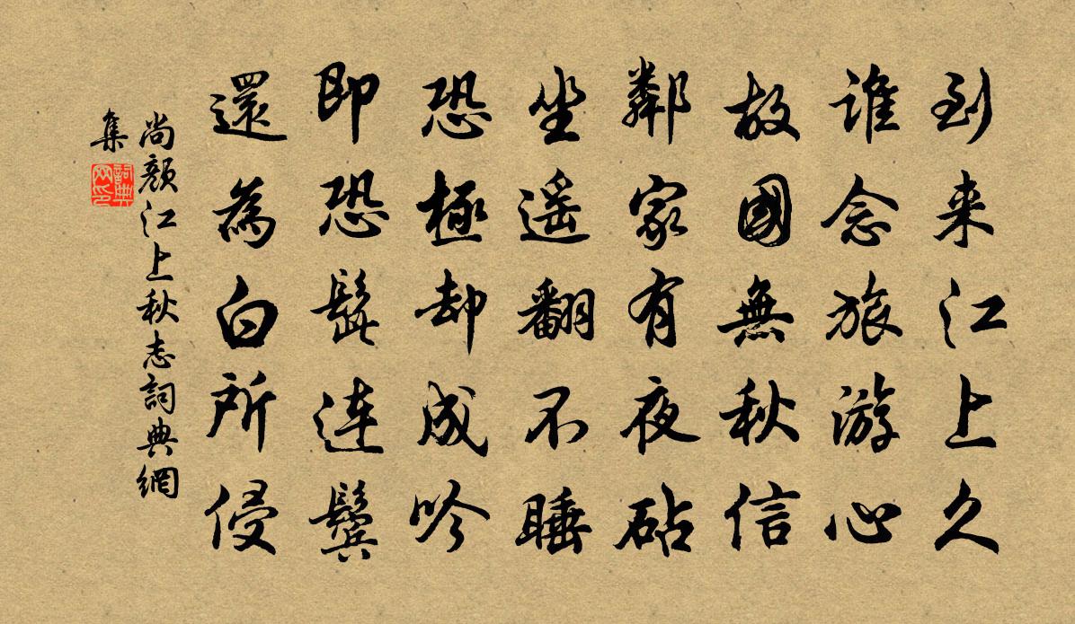詩詞名句歷史字典書法欣賞書法字典國語詞典說文解字康熙字典古漢語字典標 題 作 者 詩 句 江上秋志作者:尚顏 朝代:唐代江上秋志原文到來江上久,誰念旅遊心。故國無秋信,鄰家有夜砧。坐遙翻不睡,恐極卻成吟。即恐髭連鬢,還為白所侵。詩詞問答問:江上秋志的作者是誰?答:尚顏問:江上秋志寫於哪個朝代?答:唐代尚顏江上秋志書法欣賞江上秋志書法作品注釋全唐詩:卷848-2詩詞推薦書事舒岳祥〔宋代〕倚徙白頭杖,哀傷赤子兵。斜封今不用,直指近方行。商鞅何妨徇,桑羊儘可烹。擊蒙須用此,盡箠惜刑輕。拈古十四首釋法薰〔宋代〕這僧已是露出眼睛,雲門更與揭卻腦蓋。若是佛法,未夢見在。送李奉議亳州判官四首陳師道〔宋代〕謝公中年後,畏與親友別。數日懷抱惡,每笑冠纓絕。生有四方事,死當一語決。前笑今則悲,吾衰擬何說。著鞭挽章陳造〔宋代〕隱操人將處士看,寧知器業自槃槃。襄陽耆舊今餘幾,儒館先生定莫攀。元亮歸來猶責子,德公老去竟無官。子孫登城五首劉克莊〔宋代〕尉佗故秦吏,堪執酇侯鞭。箕踞問使者,吾方帝孰賢。送客往湘江李端〔唐代〕識君年已老,孤棹向瀟湘。素髮臨高鏡,清晨入遠鄉。三山分夏口,五兩映涔陽。更逐巴東客,南行淚幾行。鷓鴣天佚名〔宋代〕題得相思字數行。起來桐葉滿紗窗。秋光欲雨棋聲瀉,粉帳不容花露香。新寂寞,舊疏狂。玉爐訊息記錢塘。小闌遣興七首李流謙〔宋代〕懷抱向誰盡,窮交苦不多。相期慰岑寂,未厭數經過。濁酒隨斟酌,新詩聽講磨。吾今已三十,不擬問如何。落花白居易〔唐代〕留春春不住,春歸人寂寞。厭風風不定,風起花蕭索。既興風前嘆,重命花下酌。勸君嘗綠醅,教人拾紅萼。桃飄和鄰幾社日韓維〔宋代〕春陽□□□,□□□□□。□□□流光,連坐嘆故園。游□□□□,□□□□□。擊鼓會鄉人,莫觴為曰□。□□言懷仇遠〔宋代〕此地曾經李白游,湖山消得好詩留。兩橋十里東西市,只欠春風一酒樓。題劉宗周黃道周集乾隆〔清代〕搜羅四庫事磨研,去取其間公道傳。人各抒忠斯可錄,言雖觸諱忍從捐。寧同仲達吠堯日,不愧觀文報宋年。平日蓮葉李群玉〔唐代〕根是泥中玉,心承露下珠。在君塘下種,埋沒任春浦。和柳子玉官舍十首蜜蜂黃庶〔宋代〕秋成想見香租入,菊露楓膠密幾脾。日日山僮掃紅葉,蜂衙知是主人歸。親耕籍田七首佚名〔宋代〕方壇屹立,陛級而登。玉色下照,臨觀耦耕。萬目鹹睹,如日之升。成規成矩,百祿是膺。瑞鶴仙陸叡〔宋代〕濕雲黏雁影。望征路愁迷,離緒難整。千金買光景。但疏鍾催曉,亂鴉啼暝。花悰暗省。許多情、相逢夢境。便行木蘭花慢 贈閬州揚宣撫魏初〔元代〕問高城鐵*,緣底事、淨妖氛。道霜落長安,元**令,萬騎雲屯。人人知自有用,望金湯、直上撼乾坤。海陸鯨過鄱陽湖徐照〔宋代〕港中分十字,蜀廣亦通連。四望空無地,孤舟若在天。龍尊收巨浪,鷗少沒蒼煙。未流皆驚畏,吾今已帖淆。贊三將軍釋曇華〔宋代〕家在歸宗寺後山,洞中春色異人間。祗因親受靈山記,長與歸宗把要關。曉坐臥治齋楊萬里〔宋代〕夜風甚細不勝酸,霜落無聲只是寒。日上東窗無個事,送將梅影索人看。名句推薦物是人非事事休,欲語淚先流。李清照《武陵春·春晚》 醉後莫思家,借取師師宿。晏幾道《生查子·落梅庭榭香》 時見歸村人,沙行渡頭歇。孟浩然《秋登蘭山寄張五》 紛紛墜葉飄香砌。夜寂靜,寒聲碎。范仲淹《御街行·秋日懷舊》 執道循理,必從本始,順為經紀,禁伐當罪,必中天理。佚名《黃帝四經·經法·四度》 人家見生男女好,不知男女催人老。王建《短歌行》 賢不肖不雜則英傑至,是非不亂則國家治荀子《荀子·王制》 大樹底下好遮陰張南莊《何典·第十回》 思歸未可得,書此謝情人。李白《送郄昂謫巴中》 自從明宰投巫後,直至如今鬼不神汪遵《西河》
