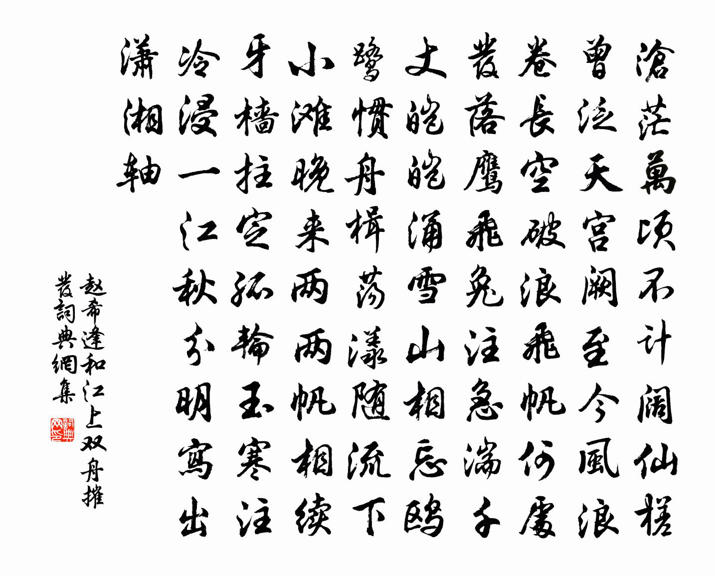 詩詞名句歷史字典書法欣賞書法字典國語詞典說文解字康熙字典古漢語字典標 題 作 者 詩 句 和江上雙舟摧發作者:趙希逢 朝代:宋代和江上雙舟摧發原文滄茫萬頃不計闊,仙槎曾泛天宮闕。至今風浪卷長空,破浪飛帆何處發。落鷹飛兔注急湍,千丈皚皚涌雪山。相忘鷗鷺慣舟楫,蕩漾隨流下小灘。晚來兩兩帆相續,牙檣拄定孤輪玉。寒注冷浸一江秋,分明寫出瀟湘軸。詩詞問答問:和江上雙舟摧發的作者是誰?答:趙希逢問:和江上雙舟摧發寫於哪個朝代?答:宋代趙希逢和江上雙舟摧發書法欣賞和江上雙舟摧發書法作品詩詞推薦鳳凰台王冕〔元代〕生長當盛世,無家足遨遊。行登鳳凰台,縱目萬景收。山川尚形勝,故跡殊可求。環滁起西南,三峰翠相繆。落日戲書蘇軾〔宋代〕五言七言正兒戲,三行兩行亦偶爾。我性不飲只解醉,正如春風弄群卉。四十年來同幻事,老去何須別愚智。古人新春道中口占李新〔宋代〕幛睦翠煙猶惜曉,乳花小雨卻翻晴。去年春恨依前到,先得東風捲入城。廬山鄧肅〔宋代〕平生作意廬山游,往來卻貪吳越舟。陛下許臣鞭匹馬,芒鞋因得款清幽。是時六月蒸炎暑,六合黃塵空一雨。上方興州江館鄭谷〔唐代〕向蜀還秦計未成,寒蛩一夜繞床鳴。愁眠不穩孤燈盡,坐聽嘉陵江水聲。山檻小飲曾鞏〔宋代〕變秋長雲豪,灑雨北風壯。余熇尚爭威,積晦頗異狀。山回攢楓顛,屋立懸狖上。飲檻聚石為,歌筵注溪當。歡言學舍直歸晚霽三首宋祁〔宋代〕雨罷殘陽在,風微酷暑收。餘昏淡雲翳,聚沫泛河流。桃簟雙紋展,盤瓜五色浮。潘郎最多感,庭樹莫先秋。正月六日七日書所見晁說之〔宋代〕扶光歲首當何辰,薦視變異紛無垠。既驚馬日不為馬,況復人日不成人。鹹疑白晝懸月魄,嘩言日月本斗格。如負郊廟歌辭。祭方丘樂章。順和佚名〔唐代〕坤厚載物,德柔垂祉。九域鹹雍,四溟為紀。敬因良節,虔修陰祀。廣樂式張,靈其降止。上杭州姚郎中方乾〔唐代〕能除疾瘼似良醫,一郡鄉風當日移。身貴久離行藥伴,才高獨作後人師。春遊下馬皆成宴,吏散看山即有詩。借問九懷鴟夷子皮高似孫〔宋代〕江欲冷兮丹楓,月將缺兮初鴻。天如仄兮沉兮波,楫有聲兮追風。易莫易兮謀取功,難莫離兮圖終。東山兮誰作,熊主簿示梅花十絕詩至梅花已過因觀海棠輒次劉克莊〔宋代〕特以穠纖壓眾芳,痴人痴殺恨無香。問渠嫵媚房櫳里,何似莊嚴幾研傍。升僊橋遇風雨大至憩小店陸游〔宋代〕觸熱真疑墮火灰,雨如飛鏃亦佳哉!空江魚鱉從龍起,平野雷霆擁馬來。正怪橫吹屋茅盡,俄聞下擊澗松摧。晚來頌古十四首釋師體〔宋代〕桃花零落眼方開,自謂風流孰可陪。叵耐玄沙忒偏黨,卻來醉後便添杯。初夏登北山衛宗武〔宋代〕出郭望遙岑,闒冗僅抔土。何異龍蜿蜒,或若鳳騰翥。兩岫更奇崛,不肯與噲伍。煙雲或凝散,日月遞吞吐。蔥蔥駕幸親賢宅贈隨駕諸公蘇轍〔宋代〕日日南風夜氣煩,一聲鳴[走畢]萬人看。禁溝飛水清黃道,涼殿分冰遍從官。急雨未成昏觀闕,微飈稍覺泛和鑾索新進詩袁甫〔宋代〕君傳秘訣解觀人,瞥見雙眸識破真。收拾後生知幾許,為予喚取儻相親。句楊徽之〔唐代〕戍樓煙乍直,戰地雨長腥。宮詞張公庠〔宋代〕仙篽春妍奉宴嬉,樓台偏與柳梢宜。鳴鞘聲入千花去,黃傘低斜步步移。花心動(端午)史浩〔宋代〕槐夏陰濃,筍成竿、紅榴正堪攀折。菖歜碎瓊,角黍堆金,又賞一年佳節。寶觥交勸殷勤願,把玉腕、彩絲雙結。名句推薦誰知得酒尚能狂,脫帽向人時大叫。陸游《三月十七日夜醉中作》 行人莫便消魂去,漢渚星橋尚有期。晏幾道《鷓鴣天·梅蕊新妝桂葉眉》 平生不做皺眉事,世上應無切齒人。佚名《增廣賢文·上集》 越女新妝出鏡心,自知明艷更沉吟。張籍《酬朱慶餘》 田家幾日閒,耕種從此起。韋應物《觀田家》 將壇醇酒冰漿細,元夜邀賓燈火新。趙時春《元宵飲陶總戎家二首》 聚散匆匆,此恨年年有。魏夫人《點絳唇·波上清風》 長江如虹貫,蟠繞其下。宋濂《閱江樓記》 君馬黃,我馬白。李白《君馬黃》 朱顏那有年年好,逞艷游、贏取如今韓疁《高陽台·除夜》