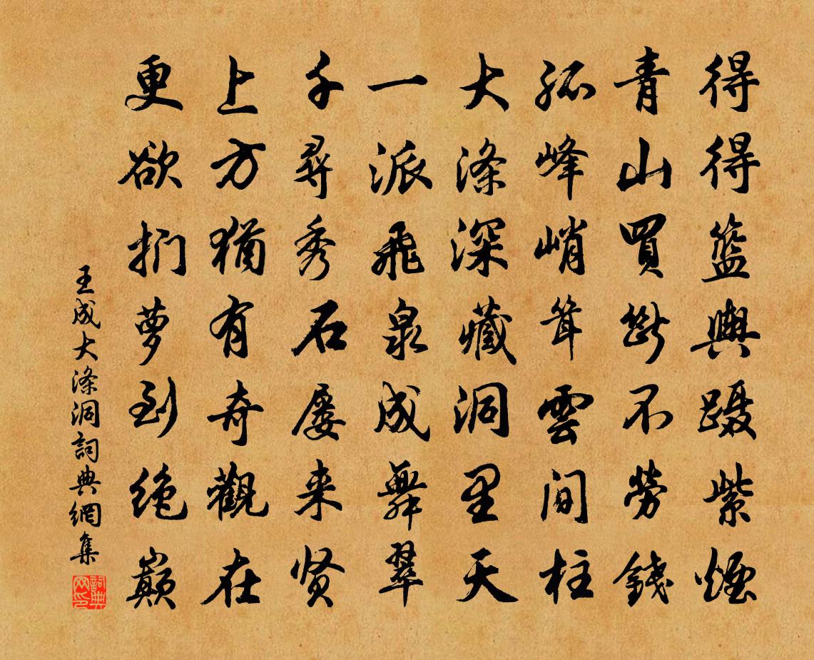詩詞名句歷史字典書法欣賞書法字典國語詞典說文解字康熙字典古漢語字典標 題 作 者 詩 句 大滌洞作者:王成 朝代:宋代大滌洞原文得得籃輿躡紫煙,青山買斷不勞錢。孤峰峭聳雲間柱,大滌深藏洞裡天。一派飛泉成舞翠,千尋秀石屢來賢。上方猶有奇觀在,更欲捫蘿到絕巔。詩詞問答問:大滌洞的作者是誰?答:王成問:大滌洞寫於哪個朝代?答:宋代王成大滌洞書法欣賞大滌洞書法作品詩詞推薦院中獨坐虞集〔元代〕何處它年寄此生,山中江上總關情。無端繞屋長松樹,盡把風聲作雨聲。謝答嚴用韻送綠萼梅趙蕃〔宋代〕兩詠君家兩樣梅,清愁已瘦一分肌。春風咫尺花無數,更合安排幾首詩。金陵有美堂梅堯臣〔宋代〕李白愛山如洛陽,三杯為歌愁日長。廢基台殿不可識,玉燕舊棲王謝堂。公來碧瓦起棟宇,羅列圖畫牙作床。池頭紅梅 十八王冕〔元代〕玉骨清癯怯素妝,春風一醉九霞觴。綠房午夜嬌雲暖,不夢梨花夢海棠。寄白雲覓茶趙蕃〔宋代〕憶別白雲筍漸長,而今想見出梢牆。道人寄我不忘我,盍寄茶甌洗睡肓。和韓子云見寄二首吳芾〔宋代〕世態我常似暮霞,人生難久類春花。已堪入谷攜樵斧,還好臨湖把釣車。對酒未能忘酒伴,喔詩尤更憶詩家。何由歸來曲侯善淵〔元代〕虛無道,元*自相和。玄覽滌除賢士少,合塵背覺俗徒多。終日謾蹉跎。開法眼,一性貫娑婆。瑩淨淨髮秋月冷,得邳大用書復寄楊奐〔元代〕百年真夢寐,萬國久風塵。老去偏相憶,書來恨不頻。季鷹猶在洛,王粲未歸秦。谷口知何似?他時願卜鄰。高宗郊前朝獻景靈宮二十一首真宗〔宋代〕涓選休辰,有事嘉薦。琅琅瓊佩,陟降嚴殿。其陟伊何,幣玉斯奠。周旋中禮,千億儲義。【越調】金蕉葉張鳴善〔元代〕怨別講燕趙風流莫比,說秦晉姻緣怎及。論呈越精神未已,配南楚儀容最美。【調笑令】楚儀,美人兮,薄注櫻唇秋懷陸游〔宋代〕園丁傍架摘黃瓜,村女沿籬采碧花。城市尚餘三伏熱,秋光先到野人家。餘蓄石屏風十游稚宜喜而求之輒遺其一侑以五曾豐〔宋代〕巨靈神手造江山,潛寫為圖置石間。歲久石為圖所變,一重巒下一重灣。白苹亭袁說友〔宋代〕苕水夸空闊,苹花笑泬寥。樓台溪上女,楊柳岸邊橋。涼月明煙渚,春水稱畫橈。晚來魚一躍,帶雨識魚跳。送成都韋丞還蜀李端〔唐代〕蜀門雲樹合,高棧有猿愁。驅傳加新命,之官向舊遊。晨裝逢酒雨,夜夢見刀州。遠別長相憶,當年莫滯留。示兒子陸游〔宋代〕祿食無功我自知,汝曹何以報明時?為農為士亦奚異,事國事親惟不欺。道在六經寧有盡,躬耕百畝可無飢。最親點絳唇(雙柑扇)姚述堯〔宋代〕金碧交輝,江陵千樹天然富。寒林爭秀。獨向霜風后。寫入冰紈,兩兩情何厚。同攜久。涼生清畫。香滿佳人手。生查子(獨游西岩)辛棄疾〔宋代〕青山非不佳,未解留儂住。赤腳踏滄浪,為愛清溪故。朝來山鳥啼,勸上山高處。我意不關渠,自要尋蘭去。臨江仙(秋日有感)趙長卿〔宋代〕楓葉白苹秋未老,晚風吹泛輕舶。青山瀝瀝水茫茫。情隨流水遠,恨逐暮山長。一點相思千點淚,眼前無限情傷,從昭祖乞糖霜鄧肅〔宋代〕甜滿中邊一夜冰,璀璀璨璨自天成。冷香入骨追瓊液,秀色當筵瑩水晶。絳闕不須餐沆瀣,玉池何事養胎津。從公早秋三首·其一許渾〔唐代〕遙夜泛清瑟,西風生翠蘿。殘螢棲玉露,早雁拂金河。高樹曉還密,遠山晴更多。淮南一葉下,自覺洞庭波。名句推薦對瀟瀟暮雨灑江天,一番洗清秋。柳永《八聲甘州·對瀟瀟暮雨灑江天》 水調數聲持酒聽。午醉醒來愁未醒。張先《天仙子·水調數聲持酒聽》 相思血,都沁綠筠枝。姜夔《小重山令·賦潭州紅梅》 今日大風寒,寒風摧樹木,嚴霜結庭蘭佚名《孔雀東南飛並序/古詩為焦仲卿妻作》 盡信書,則不如無書。孟子《孟子·盡心章句下·第三節》 如來不應以具足諸相見。鳩摩羅什譯《金剛經·離色離相》 十年一覺揚州夢,贏得青樓薄倖名。杜牧《遣懷》 佇立傷神。無奈輕寒著摸人。朱淑真《減字木蘭花·春怨》 惟心會而不可口傳,可神通而不可語達。曹雪芹《紅樓夢·第五回》 晴風初破凍,柳眼梅腮,已覺春心動。李清照《蝶戀花·暖雨晴風初破凍》