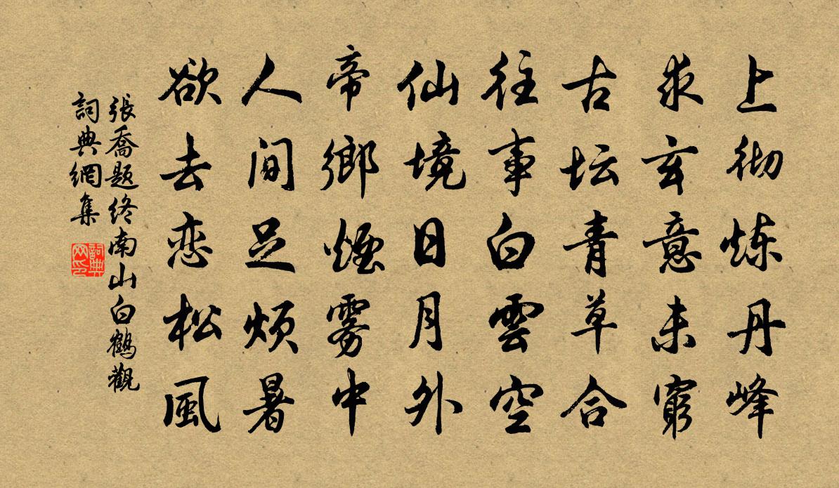 詩詞名句歷史字典書法欣賞書法字典國語詞典說文解字康熙字典古漢語字典標 題 作 者 詩 句 題終南山白鶴觀作者:張喬 朝代:唐代題終南山白鶴觀原文上徹煉丹峰,求玄意未窮。古壇青草合,往事白雲空。仙境日月外,帝鄉煙霧中。人間足煩暑,欲去戀松風。詩詞問答問:題終南山白鶴觀的作者是誰?答:張喬問:題終南山白鶴觀寫於哪個朝代?答:唐代問:題終南山白鶴觀是什麼體裁?答:五律張喬題終南山白鶴觀書法欣賞題終南山白鶴觀書法作品注釋全唐詩:卷638-8詩詞推薦再次韻贈張德恭陳造〔宋代〕辭鋒森列看分朋,退作窮山苦行僧。每讀嚴詩驚我倒,亦知舜績待公凝。絲綸指日從天下,閶闔摩霄接武升。更想舶使王會溪太守趙見泰九日領客枉顧山中賦采蒲壽宬〔宋代〕天台赤霞頂,峨眉翠雲間。人物自楚楚,文采何斑斑。屈宋艷何摘,陶謝高可攀。咳唾隨天風,萬古輝此山。山路曉行陳與義〔宋代〕兩崖夾曉月,萬壑分秋風。今朝定何朝,孤賞莫與同。石路抱岩轉,雲氣青濛濛。籃輿拂露枝,亂點驚仆童。微泉感鏡白居易〔唐代〕美人與我別,留鏡在匣中。自從花顏去,秋水無芙蓉。經年不開匣,紅埃覆青銅。今朝一拂拭,自照憔悴容。照罷太上皇帝合端午帖子詞汪應辰〔宋代〕道大光今古,功成付聖明。超然群物表,但見四時行。送項平甫教授之成都陳造〔宋代〕昔人石穴命西蜀,豈知桃華胥隱腹。詩人昔吟蜀道難,何曾錦城負物看。平時風物今猶故,井絡坤維神所護。漢官臨江仙趙佶〔宋代〕過水穿山前去也,吟詩約句千餘。淮波寒重雨疏疏。煙籠灘上鷺,人買就船魚。古寺幽房權且住,夜深宿在僧居。題石榴洞喻良能〔宋代〕當年雞犬白雲中,屋角榴花帶露濃。洞口只今無處覓,唯餘碧水繞青榕。八月初三日五更夢覺追記舒岳祥〔宋代〕林下青衫卸,尊前白髮欹。少年行樂事,暮景感傷時。鍊藥嫌長懶,觀書悔已遲。惜花心性在,時復一吟詩。思古堂傅宗教〔宋代〕何人鑿山腹,高堂跨崔嵬。悠悠百年事,滾滾隨塵埃。棄置君莫問,且復共此杯。范正獻書畢帖贊岳珂〔宋代〕士之以道義相從,豈計其功,而況乎公。當其任紬繹唐事之寄,所以極簡編之從容。亦既上成書於邇英,而公猶得隨意陸游〔宋代〕隨意上漁舟,幽尋不預謀。清溪欣始泛,野寺憶前游。豐歲雞豚賤,霜天柿栗稠。餘生知有幾,且置萬端憂。相和歌辭。長門怨二首李白〔唐代〕天回北斗掛西樓,金屋無人螢火流。月光欲到長門殿,別作深宮一段愁。桂殿長愁不記春,黃金四屋起秋塵。夜懸七十翁吟七言十首方回〔宋代〕頹齡僥倖古來稀,休致多年但欠歸。決不再思龜左顧,幸猶免賦雉朝飛。江山如舊幾寒暑,天地無情多是非。能辦發白沙口次長蘆黃庭堅〔宋代〕篙師救首尾,我為制中權。掛席滿風力,如椎強弩弦。曉放白沙口,長蘆見炊煙。一葉托秋雨,滄江百尺船。反觀懷天竺磵梅葛天民〔宋代〕根在岩邊結,枝從水際橫。此花殊近道,凡木欠修行。密雪籠幽片,疏篁倚瘦莖。那時香不淺,憶我話無生。失調名佚名〔宋代〕才向蘭湯浴罷,嬌羞簪雲髻,正雅稱鴛鴦會。贈韓德真詩曹攄〔魏晉〕赫赫顯族。冠蓋峩峩。葛延王室。蘞蔓帝家。如地之岳。如天之河。爰有韓生。體德逶迤。玉質含章。珪白無瑕。次韻柳郎中二詠蘇頌〔宋代〕百幅敲冰密屬連,寢甘誰復誚便便。心間好隱忘言幾,官冷宜鋪坐客氈。烏布任寬忘道韻,絳紗徒侈怯霜天。休嗟乳燕飛/賀新郎周密〔宋代〕波影搖漣甃。趁薰風、一舸來時,翠陰清晝。去郭軒楹才數里,蘚磴松關雲岫。快屐齒、筇枝先後。空半危亭堪聚名句推薦行人無限秋風思,隔水青山似故鄉。戴叔倫《題稚川山水》 狡兔有三窟,僅得免其死耳。劉向《戰國策·齊四·齊人有馮諼者》 邂逅淇南,歲寒獨在,故人襟抱。王惲《水龍吟·送焦和之赴西夏行省》 半盞屠蘇猶未舉,燈前小草寫桃符。陸游《除夜雪》 江上陰雲鎖夢魂,江邊深夜舞劉琨。譚用之《秋宿湘江遇雨》 長記海棠開後,正傷春時節李清照《好事近·風定落花深》 竹疏虛檻靜,松密醮壇陰。張泌《女冠子·露花菸草》 獨憐幽草澗邊生,上有黃鸝深樹鳴。韋應物《滁州西澗》 今宵酒醒何處?楊柳岸,曉風殘月。柳永《雨霖鈴·寒蟬淒切》 為上者疑,為下者懼。上下背德,禍必興焉。來俊臣《羅織經·事上卷第二》