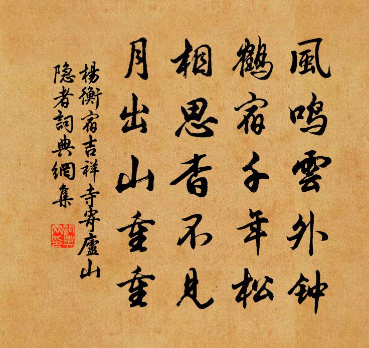 詩詞名句歷史字典書法欣賞書法字典國語詞典說文解字康熙字典古漢語字典標 題 作 者 詩 句 宿吉祥寺寄廬山隱者作者:楊衡 朝代:唐代宿吉祥寺寄廬山隱者原文風鳴雲外鍾,鶴宿千年松。相思杳不見,月出山重重。詩詞問答問:宿吉祥寺寄廬山隱者的作者是誰?答:楊衡問:宿吉祥寺寄廬山隱者寫於哪個朝代?答:唐代問:宿吉祥寺寄廬山隱者是什麼體裁?答:五絕楊衡宿吉祥寺寄廬山隱者書法欣賞宿吉祥寺寄廬山隱者書法作品注釋全唐詩:卷465-50詩詞推薦送王仲求李廌〔宋代〕飄風非焚輪,觸石生孤雲。 * 真人,行行傲世紛。齋戒斷葷臭,日誦浮屠文。敝袍游江海,恥與狐貉群。吐納沁園春李曾伯〔宋代〕麴生來言,素娥寄聲,偶閬苑游。問去年今夕,逢余桂嶺,前年今夕,見子菟裘。何事塵勞,啟人厭倦,痴兔老蟾過都昌蘇軾〔宋代〕鄱陽湖上都昌縣,燈火樓台一萬家。水隔南山人不渡,東風吹老碧桃花。挽莫子晉丈孫應時〔宋代〕少日從諸老,丁年重一鄉。塤篪鳴正樂,蘭玉秀成行。坐客多匡鼎,途人說鄭莊。哀哀晚何事,衰病訖淒涼。送資深知潼川府袁說友〔宋代〕昔日班行憶舊遊,天涯今已說離愁。珠璣咳唾頻傾倒,風月江山幾倡酬。三接自應還北闕,一麾猶欲惠東州。與君龐居士贊釋梵琮〔宋代〕得便宜是落便宜,傾盡家珍賣笊籬。男女聚頭無結果,這般翁子大無知。徒步訪李宣叔宣叔有詩依韻答梅堯臣〔宋代〕渡河誰道去,我重子云才。鴻雁汀洲去,牛羊井落徠。乍行初覺倦,暫語不能該。日色看看暮,將歸意復徊。登石室飯僧詩謝靈運〔南北朝〕迎旭凌絕嶝。映泫歸漵浦。鑽燧斷山木。掩岸墐石戶。結架非丹甍。藉田資宿莽。同游息心客。曖然若可睹。清霄雪趙崇森〔宋代〕今年寒較早,十月雪霏霏。冰渚魚深逝,風林鳥倦飛。家人催買炭,客子慮無衣。便好騎驢過,羊羔酒正肥。唐昌觀玉蕊花折有仙人游,悵然成二絕嚴休復〔唐代〕終日齋心禱玉宸,魂銷目斷未逢真。不如滿樹瓊瑤蕊,笑對藏花洞裡人。羽車潛下 * 山,塵世何由睹蕣顏。唯有明王寺唐介〔宋代〕日高霞散彩,松老鶴巢枝。壞壁詩猶在,紗籠何用之。欣欣亭李大異〔宋代〕雨露汪洋四海春,嶺南嶺北多歸人。朝中賢士罕過此,莫惜青錢呼白鱗。壬子正月四日後圃行散四首楊萬里〔宋代〕雙鵲營巢浪苦辛,棟條御折不辭頻。舊條老硬新條勒,卻向籬根拾落薪。對梅有作六首趙蕃〔宋代〕剩欲將梅月下看,卻愁風露不勝寒。有時暫作披衣看,積雪凝霜不可乾。春懷十首汪莘〔宋代〕大皞涵帝德,勾芒播皇仁。群龍服蒼駕,靈雨冒南岑。淵魚自暖躍,谷鳥相和吟。桃花既夾道,麥苗亦成林。竹籬謝公定和二范秋懷五首邀予同作黃庭堅〔宋代〕往日孫陽翟,才可任遺補。擊強如摧枯,食櫱不知苦。屬者缺諫垣,時論或未許。儻可假一邦,使民作鄒魯。好事近 寒夜張翥〔元代〕門外晚風生,鼓角城頭欲動。霜月滿天如水,漸夜深寒重。幽人擁被醉模糊,無愁也無夢。只有些兒心上,怕梅花生查子(壽謝憲,在四川類省試院)李劉〔宋代〕湘江貫地維,衡岳生人傑。誰遣益州星,暫伴峨眉月。初度慶今朝,繡斧雙龍節。為國罩嘉魚,趣覲黃金闕。窮冬曲江閒步裴夷直〔唐代〕雪盡南坡雁北飛,草根春意勝春暉。曲江永日無人到,獨繞寒池又獨歸。奉送諸兄謁府劉宰〔宋代〕男邦養士擬侯邦,師師寧分彼一分。明辨正須煩幕府,作成庶不異州庠。紫金山回連三島,甘露樓高俯八荒。六代名句推薦問姓驚初見,稱名憶舊容。李益《喜見外弟又言別》 荊江日落陣雲低,橫戈躍馬今何時。納蘭性德《送蓀友》 手種黃柑二百株,春來新葉遍城隅。柳宗元《柳州城西北隅種柑樹》 行有不得者,皆反求諸己,其身正而天下歸之。孟子《孟子·離婁章句上·第四節》 看來豈是尋常色,濃淡由他冰雪中。曹雪芹《詠紅梅花得“紅”字》 竹外一枝斜,想佳人,天寒日暮。曹組《驀山溪·梅》 明朝望鄉處,應見隴頭梅。宋之問《題大庾嶺北驛》 芳菲歇去何須恨,夏木陰陰正可人。秦觀《三月晦日偶題》 桃李不言,下自成蹊;道旁苦李,為人所棄。程登吉《幼學瓊林·卷四·花木》 歸雁橫秋,倦客思家。張可久《折桂令·九日》