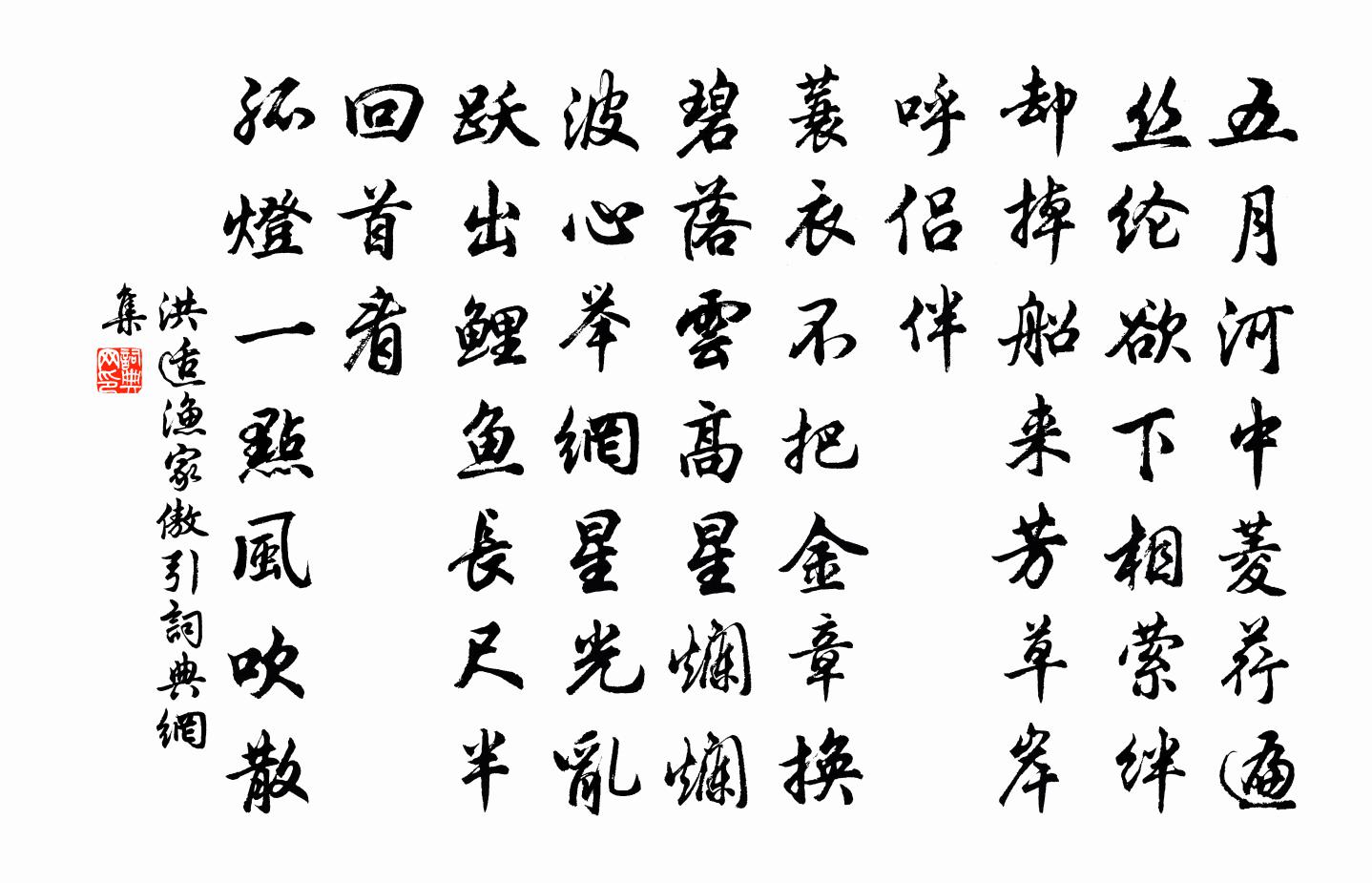 詩詞名句歷史字典書法欣賞書法字典國語詞典說文解字康熙字典古漢語字典標 題 作 者 詩 句 漁家傲引/漁家傲作者:洪适 朝代:宋代漁家傲引/漁家傲原文五月河中菱荇遍。絲綸欲下相縈絆。卻掉船來芳草岸。呼侶伴。蓑衣不把金章換。碧落雲高星爛爛。波心舉網星光亂。躍出鯉魚長尺半。回首看。孤燈一點風吹散。詩詞問答問:漁家傲引/漁家傲的作者是誰?答:洪适問:漁家傲引/漁家傲寫於哪個朝代?答:宋代問:漁家傲引/漁家傲是什麼體裁?答:詞洪适漁家傲引/漁家傲書法欣賞漁家傲引/漁家傲書法作品詩詞推薦李花贈張十一署(或作李有花)韓愈〔唐代〕江陵城西二月尾,花不見桃惟見李。風揉雨練雪羞比,波濤翻空杳無涘。君知此處花何似,白花倒燭天夜明,群雞老嘆陸游〔宋代〕一齒危將墜,雙瞳久已昏。謀生賴蔬圃,養拙閉柴門。多病從來慣,虛名不足論。自憐餘一念,猶欲濟元元。頌古五十七首釋道昌〔宋代〕石臼髮腳太遲,馬祖開口太早。十字街頭要錢,須是打他栲栳。寒夜陸游〔宋代〕脫葉爭辭木,寒雲巧護霜。羈游少驩樂,短景極匆忙。吟苦蟲催織,鳴哀雁斷行。幽懷誰晤語,惆悵此燈光。冬日吳錫疇〔宋代〕夕陽孤倚立溪頭,三兩漁舟溯碧流。驚起一行新宿雁,斜飛又過別汀洲。訪趙野雲不值釋智愚〔宋代〕久思閒對老維摩,欲話眾生病痛多。丈室無端鐵門限,未應容易野人過。續永叔歸田樂秋冬二首梅堯臣〔宋代〕北風如刀割寒骨,谷已成囷不倉猝。任從密雪落交加,旋采乾薪燒榾柮。鋤犁滿屋牛在牢,鵝鴨亂鳴雞亂髮。割烹夏日原西避暑寄吟友齊己〔唐代〕熱煙疏竹古原西,日日乘涼此杖藜。閒處雨聲隨霹靂,旱田人望隔虹霓。蟬依獨樹幹吟苦,鳥憶平川渴過齊。別有淳熙四年二月既望靜江守臣張某奉詔勸農於郊張栻〔宋代〕惟國之法,燁燁其垂。使爾知避,豈欲爾施。長干行二首李白〔唐代〕妾發初覆額,折花門前劇。郎騎竹馬來,繞床弄青梅。同居長乾里,兩小無嫌猜。十四為君婦,羞顏未嘗開。(未風光草際浮陳祜〔唐代〕香發王孫草,春生君子風。光搖低偃處,影散艷陽中。稍稍移蘋末,微微轉蕙叢。浮煙傾綠野,遠色澹晴空。泛彩牙藥釋慧開〔宋代〕點著些兒,妙不可述。纏開臭口,驗得骨出。菩薩蠻程垓〔宋代〕淺寒帶暝和煙下。輕陰挾雨隨風灑。翠幕護重簾。篆香銷半奩。平生風雨夜。怕近芭蕉下。今夕定愁多。蕭蕭聲奈明皇祀圜丘樂章。雍和佚名〔唐代〕爛雲普洽,律風無外。千品其凝,九賓斯會。禋尊晉燭,純犧滌汰。玄覆攸廣,鴻休汪濊。春日五首秦觀〔宋代〕裌衣新著倦琴書,散策池塘返照初。翠碧黃鸝相續去,荇絲深處見游魚。南山田中行李賀〔唐代〕秋野明,秋風白,塘水漻漻蟲嘖嘖。雲根台蘚山上石,冷紅泣露嬌啼色。荒畦九月稻叉牙,蟄螢低飛隴徑斜。石脈題僧壁(一本有和韋蟾三字)段成式〔唐代〕有僧支頰撚眉毫,起就夕陽磨剃刀。到此既知閒最樂,俗心何啻九牛毛。送正之法師張繼先〔宋代〕道貌古昂藏,聲名萬里香。紫霞衣縹緲,丹佩玉琳琅。寂寞居岩館,殷勤詠洞章。佇看功行滿,飛蓋上寥陽。番陽旅寓留題白玉蟾〔宋代〕洞門深鎖綠煙寒,來享浮生半日閒。城北城南無老樹,橫吹鐵笛過廬山。水龍吟(白蓮)張炎〔宋代〕仙人掌上芙蓉,涓涓猶濕金盤露。輕妝照水,纖裳玉立,飄搖似舞。幾度消凝,滿湖煙月,一汀鷗鷺。記小舟夜悄名句推薦盪而失水,螻蟻得意焉。韓非及後人《韓非子·說林下》 艱難苦恨繁霜鬢,潦倒新停濁酒杯。杜甫《登高》 離離原上草,一歲一枯榮。白居易《草 / 賦得古原草送別》 八月秋高風怒號,卷我屋上三重茅。杜甫《茅屋為秋風所破歌》 日晚江南望江北,寒鴉飛盡水悠悠。嚴維《丹陽送韋參軍》 君子之學也,入乎耳,著乎心荀子《荀子·勸學》 萬里歸來顏愈少,微笑,笑時猶帶嶺梅香。蘇軾《定風波·南海歸贈王定國侍人寓娘》 去年射虎南山秋,夜歸急雪滿貂裘。陸游《三月十七日夜醉中作》 屏卻相思,近來知道都無益。王國維《點絳唇·屏卻相思》 望望不見君,連山起煙霧。李白《金鄉送韋八之西京》
