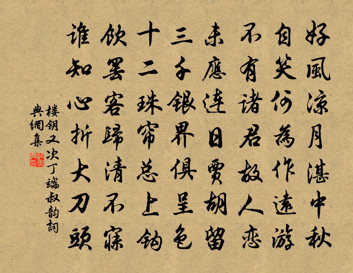 詩詞名句歷史字典書法欣賞書法字典國語詞典說文解字康熙字典古漢語字典標 題 作 者 詩 句 又次丁端叔韻作者:樓鑰 朝代:宋代又次丁端叔韻原文好風涼月湛中秋,自笑何為作遠遊。不有諸君故人戀,未應連日賈胡留。三千銀界俱呈色,十二珠簾總上鉤。飲罷客歸清不寐,誰知心折大刀頭。詩詞問答問:又次丁端叔韻的作者是誰?答:樓鑰問:又次丁端叔韻寫於哪個朝代?答:宋代樓鑰又次丁端叔韻書法欣賞又次丁端叔韻書法作品詩詞推薦自袁州還京行次安陸,先寄隨州周員外(周君巢也)韓愈〔唐代〕行行指漢東,暫喜笑言同。雨雪離江上,蒹葭出夢中。面猶含瘴色,眼已見華風。歲暮難相值,酣歌未可終。過杞贈馬夢得蘇軾〔宋代〕萬古仇池穴,歸心負雪堂。殷勤竹里夢,猶自數山王。虎跑泉廖顒〔宋代〕真馭遺蹤古,寒泉瀉石清。養源人莫測,流潤濟蒼生。恭和家大人將赴季弟官舍書示及門之作孫應符〔宋代〕焚膏繼晷且窮年,榮悴了時卻在天。莫把光陰虛度了,吾徒耕道若耕田。送客湖橋仇遠〔宋代〕別酒離歌送馬蹄,歸鞍斜日故遲遲。小兒拍手山翁醉,江左風流一晉時。雪中送人北游修睦〔唐代〕然知心去速,其奈雪飛頻。莫喜無危道,雖平更陷人。遠郊光接漢,曠野色通秦。此去迢遙極,卻回應過春。酹江月侯善淵〔元代〕貪財競色,利名牽、縈系何時休歇。鎮日忙忙如夢想,顛倒心猿馬劣。昧地謾天,多能已會,以巧翻為拙。萬般虛見陳制帥子華二首羅椅〔宋代〕北山老子勉齋翁,總把經綸付我公。胸次詩書行杲日,兵前草木轉春風。五溪衣服桑麻盡,萬里東南煙火空。直待瑞鷓鴣周純〔宋代〕一痕月色掛簾櫳。梅影斜斜小院中。狂醉有心窺粉面,夢魂無處避香風。愁來夢楚三千里,人在巫山十二重。咫尺題三高祠郭紹彭〔宋代〕三君異代同清節,百口流芳共一祠。豈但吳江夸美績,要教今古慕英姿。寒江釣雪堪供膾,夜月垂虹直可騎。著腳梁謝朏小輿孫元晏〔唐代〕小輿升殿掌鈞台,不免無憀卻憶回。應恨被他何胤誤,悔先容易出山來。書山水畫卷釋文珦〔宋代〕遠浦漁舟若個,荒林草屋誰家。不信丹青能爾,分明雁落平沙。寒元稹〔唐代〕江瘴節候暖,臘初梅已殘。夜來北風至,喜見今日寒。扣冰淺塘水,擁雪深竹闌。復此滿尊醁,但嗟誰與歡。上余倅生辰唐律十章唐士恥〔宋代〕暫握侯章乘五馬,馬頭秋色轉分明。麻源起應精純禱,一雨增添玉宇清。錢清觀禾董嗣杲〔宋代〕落葉清江路,秋行適古心。井田秦法變,河海禹功深。鷗浴蒹葭影,牛眠桑柘陰。誰憐浪遊客,獨倚斷蓬吟。哭劉仲邍司馬光〔宋代〕天下才無幾,夫君獨患多。高文粲列宿,英辯瀉長河。榮宦成朝夢,浮生度尺波。舊僚空執酒,相與淚滂沱。丁亥歲朝把筆洪咨夔〔宋代〕雞喚璇杓一夜東,長天紺碧靜無風。年華老子歡娛裹,春事兒曹翰墨中。脫雪薺芽盤飣綠,晞陽椒蕾酒行紅。赭袍湖南觀察使故相國袁公輓歌二首(一作劉禹錫詩)權德輿〔唐代〕五驅龍虎節,一入鳳凰池。令尹自無喜,羊公人不疑。天歸京兆日,葉下洞庭時。湘水秋風至,淒涼吹素旗。丹旐和東玉少卿謝春卿防禦新茗陳襄〔宋代〕嘗陪星使款高牙,三月欣逢試早茶。綠絹封來溪上印,紫甌浮出社前花。休將潔白評雙井,自有清甘薦五華。帥府和劉原甫白鸚鵡梅堯臣〔宋代〕能言異國鳥,來與舶帆飄。嘗過西王母,曾殊北海鰩。雪衣應不忌,隴客幸相饒。因憶禰處士,舊洲蘭蕙凋。名句推薦目前貧富非為準,久後窮通未可知。馮夢龍《醒世恆言·卷一》 幾硯昔年游,於今成十秋。司馬光《送龔章判官之衛州·新及第》 大樹底下好遮陰張南莊《何典·第十回》 自伐者無功;自矜者不長。老子《老子·道經·第二十四章》 蓮子已成荷葉老。青露洗、蘋花汀草。李清照《怨王孫·湖上風來波浩渺》 聖人苟可以強國,不法其故;苟可以利民,不循其禮。商鞅《商君書·更法》 夜來風雨聲,花落知多少。孟浩然《春曉》 更無柳絮因風起,惟有葵花向日傾。司馬光《客中初夏》 何事非相思,江上葳蕤竹。吳均《登二妃廟》 不似秋光,只與離人照斷腸。蘇軾《減字木蘭花·春月》