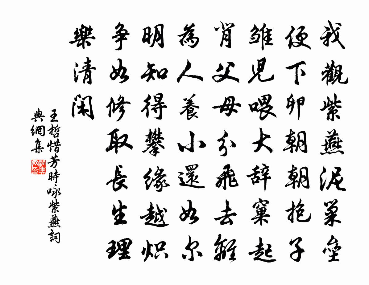 詩詞名句歷史字典書法欣賞書法字典國語詞典說文解字康熙字典古漢語字典標 題 作 者 詩 句 惜芳時 詠紫燕作者:王哲 朝代:元代惜芳時 詠紫燕原文我觀紫燕泥巢壘。便下卵、朝朝抱子。雛兒餵大辭窠起。背父母、分飛去離。為人養小還如爾。明知得、攀緣越熾。爭如修取長生理。樂清閒詩詞問答問:惜芳時 詠紫燕的作者是誰?答:王哲問:惜芳時 詠紫燕寫於哪個朝代?答:元代問:惜芳時 詠紫燕是什麼體裁?答:詞王哲惜芳時 詠紫燕書法欣賞惜芳時 詠紫燕書法作品詩詞推薦一剪梅·唱到陽關第四聲劉仙倫〔宋代〕唱到陽關第四聲。香帶輕分。羅帶輕分。杏花時節雨紛紛。山繞孤村。水繞孤村。更沒心情共酒尊。春衫香滿,空唁織簑翁方回〔宋代〕系馬籬邊樹,春初此叩扉。行人求茗飲,老父售簑衣。忽已空無物,云何去不歸。杵亡石臼破,殘麥化蛾飛。鷓鴣天(旅中中秋)石孝友〔宋代〕露葉披殘露顆傳。明星著地月流天。不辭獨賞窮今夜,應為相逢憶去年。辜窈窕,負蟬娟。誰知兩處照孤眠。姮娥儀真呈友人劉宰〔宋代〕近聞李郭舟,送往涉重湖。我欲與之俱,鷁飛過宋都。死生見交情,嗟我朱東隅。歸來整杖屨,顏厚見彼姝。念昔讀顧況歌行貫休〔唐代〕雪泥露金冰滴瓦,楓檉火著僧留坐。忽睹逋翁一軸歌,始覺詩魔辜負我。花飛飛,雪霏霏,三珠樹曉珠累累。妖狐長風沙陸游〔宋代〕江水六月無津涯,驚濤駭浪高吹花。櫓聲已出雁翅浦,荻夾喜入長風沙。長風自古三巴路,檣竿參差雜煙樹。南船綠野亭鄭伯玉〔宋代〕路出煙村俗駕少,江天落莫憎寒威。依依壺嶠草樹變,藹藹海門煙火微。日腳下時一雁度,風頭起處雙鴉歸。卻擁從軍行駱賓王〔唐代〕平生一顧重,意氣溢三軍。野日分戈影,天星合劍文。弓弦抱漢月,馬足踐胡塵。不求生入塞,唯當死報君。命妓不至劉兼〔唐代〕琴中難挑孰憐才,獨對良宵酒數杯。蘇子黑貂將已盡,宋弘青鳥又空回。月穿淨牖霜成隙,風卷殘花錦作堆。攲枕和陳處士在雍丘見寄徐鉉〔唐代〕衰薄喜多幸,退公誰與閒。高人乘興去,相望兩程間。卷箔有微雪,登樓無遠山。清談勝題贈,何日杖藜還。送遜師歸舒州王安石〔宋代〕山川相對一悲翁,往事紛紛夢寐中。邂逅故人恩意在,低徊今日笑言同。看吹陌上楊花滿,忽憶岩前蕙帳空。亦見書懷於鄴〔唐代〕長安多路岐,西去欲何依。浮世只如此,舊山長憶歸。自離京國久,應已故人稀。好與孤雲住,孤雲無是非。和劉學錄韻陳宓〔宋代〕兩堤已著金絲縷,平岸行看翠羽茵。春晝漸長無一事,艤舟日日待詩人。溪橋梅方蒙仲〔宋代〕一陣曉風寒,驚飛點去鞍。行人易愁絕,便作柳花看。覽古四十二首 其六楊維楨〔元代〕應侯刻薄人,須賈得無死。飛將殺霸陵,狼狠不足齒。如何畫眉郎,五日殺掾史。送重鈞上人游天台皎然〔唐代〕漸看華頂出,幽賞意隨生。十里行松色,千重過水聲。海容雲正盡,山色雨初晴。事事將心證,知君道可成。和董端明大野漁父圖李彌遜〔宋代〕臥月眠風樂有餘,蒹葭處處釣重湖。斟魯酒,膾鱸魚。一片家風入畫圖。胡笳十八拍第十八拍劉商〔唐代〕歸來故鄉見親族,田園半蕪春草綠。明燭重燃煨燼灰,寒泉更洗沈泥玉。載持巾櫛禮儀好,一弄絲桐生死足。出入華之高壽魯齋先生七十金履祥〔宋代〕東人之子,其來秩秩。是追是琢,是進是服。即事李流謙〔宋代〕雪巘雲林共莽然,世間那有此江天。曉檣攙日何時到,夜柁鳴風幾夕眠。閒卜家書燈似粟,略開旅抱酒如泉。輕鷗名句推薦半卷紅旗臨易水,霜重鼓寒聲不起。李賀《雁門太守行》 思悠悠,恨悠悠,恨到歸時方始休。白居易《長相思·汴水流》 不恥不若人,何若人有?孟子《孟子·盡心章句上·第七節》 梧桐樹,三更雨,不道離情正苦。溫庭筠《更漏子·玉爐香》 幾時能命駕,對酒落花前。賈島《清明日園林寄友人》 山中相送罷,日暮掩柴扉。王維《送別 / 山中送別 / 送友》 知否,知否?應是綠肥紅瘦。李清照《如夢令·昨夜雨疏風驟》 梅片作團飛,雨外柳絲金濕。雷應春《好事近·梅片作團飛》 鵲辭穿線月,花入曝衣樓。李賀《七夕》 仙人琪樹白無色,王母桃花小不香。白居易《牡丹芳》