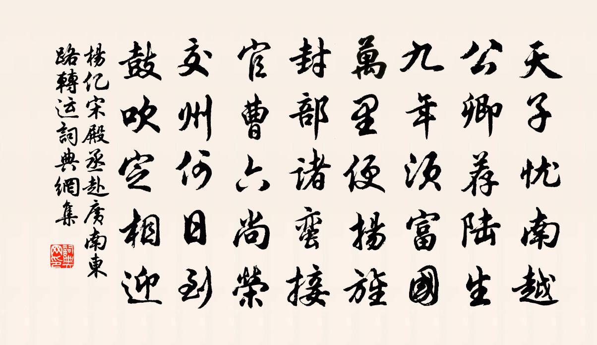 詩詞名句歷史字典書法欣賞書法字典國語詞典說文解字康熙字典古漢語字典標 題 作 者 詩 句 宋殿丞赴廣南東路轉運作者:楊億 朝代:宋代宋殿丞赴廣南東路轉運原文天子憂南越,公卿薦陸生。九年須富國,萬里便揚旌。封部諸蠻接,官曹六尚榮。交州何日到,鼓吹定相迎。詩詞問答問:宋殿丞赴廣南東路轉運的作者是誰?答:楊億問:宋殿丞赴廣南東路轉運寫於哪個朝代?答:宋代楊億宋殿丞赴廣南東路轉運書法欣賞宋殿丞赴廣南東路轉運書法作品詩詞推薦菩薩蠻(秋)鑒堂〔宋代〕砌風鳴葉繁霜墜。墜霜繁葉鳴風砌。山外水潺潺。潺潺水外山。冷衾愁夜永。永夜愁衾冷。砧響更蛩吟。吟蛩更響山枇杷元稹〔唐代〕山枇杷,花似牡丹殷潑血。往年乘傳過青山,正值山花好時節。壓枝凝艷已全開,映葉香苞才半裂。緊搏紅袖欲支詠王給事蔣貽恭〔唐代〕厥父元非道郡奴,允光何事太侏儒。可中與個皮褌著,擎得天王左腳無。王應仲欲附張恭甫舟過湖南久不決今日忽聞遂陳與義〔宋代〕我身如孤雲,隨風墮湖邊。牆東木陰好,初識避世賢。從來有名士,不用無名錢。披君三逕草,分我一味禪。胡為浣溪沙向子諲〔宋代〕短句贈行樽俎風流意氣傾。一杯相屬忍催行。離歌更作斷腸聲。袞袞大江前後浪,娟娟明月短長亭。水程山驛總關用韻壽鄭子仁二首項安世〔宋代〕千載吾家得鄭君,至今情義藹於春。向人心事緇衣武,伴我躬耕谷口真。父老尚談宣幕事,世科元是探花人。朱庭題白鶴廟徐鉉〔唐代〕平生心事向玄關,一入仙鄉似舊山。白鶴唳空晴眇眇,丹沙流澗暮潺潺。嘗嗟多病嫌中藥,擬問真經乞小還。滿洞哀甬東李鄴嗣〔清代〕戰壘村村見,愁雲日日濃。亂骸爭白草,舊鬼失青松。不斷三江鼓,難消八月烽。山居何處好,比屋有新春。偈三首釋卿〔宋代〕一不是,二不成,落華流水裡啼鶯。閒亭雨歇夜將半,片月還從海底生。句山野人〔宋代〕鶯藏楊柳金歌舞,蝶宿梨花雪夢魂。喜晴曾幾〔宋代〕求晴而得晴,老子不勝喜。夜間屋瓦聲,如疾痛在己。通宵遂無寐,落勢殊未已。禾頭臥沙泥,便恐欲生耳。謂天行不上也哥哥邵定〔宋代〕青泥坡,一坡高一坡,毒蟒寄穴虎作窠。風酸日黯雲嵯峨,抵死欲上將如何。上頭莫有牡丹紫玉九袴帶,黃金千萬秋懷連文鳳〔宋代〕西北多陰風,日夜吹裳衣。草蟲動機杼,札札鳴聲悲。百憂彌中腸,歡樂復何時。今日忽已逝,來日未可知。且飲荊江漁父竹枝詞九首和夔師□侍郎韻為荊師範項安世〔宋代〕三曲漁人獻壽茶,新翻衢樣織茶花。白雨紛紛下江海,翠浪滾滾開龍蛇。自入南與二陸丈游知其為侍郎族也小陸丈除欽曾豐〔宋代〕叔侄嶺南邊,熊車相後先。同時持紫橐,指日復青氈。契分膠投漆,離情雨帶煙。吾窮公富貴,勿廢往來箋。某曩在遂寧嘗賦木犀雲茂樹幽花兀老蒼不隨眾魏了翁〔宋代〕洞煙溪月楚山蒼,萬木辭林稼滌場。老桂挾秋清入骨,明河倚樹爛成章。城隅靜女閒逾美,澤畔纍臣晚更香。若數雜詠一百首倉舒劉克莊〔宋代〕全活齧鞍吏,平章秤象船。丕乎真有幸,舒也竟無年。題太白祠堂喻良能〔宋代〕潮生採石波濤險,秋入青山草木寒。千古風流無處覓,空吟亭北倚欄乾。賢者之孝二百四十首顧悌林同〔宋代〕地遠隔親面,惟憑一紙書。句終輒應諸,進是聽於無。將赴黔州先寄本府中丞李頻〔唐代〕八月瞿塘到底翻,孤舟上得已銷魂。幕中職罷猶趨府,闕下官成未謝恩。丹嶂聳空無過鳥,青林覆水有垂猿。感知名句推薦逢郎欲語低頭笑,碧玉搔頭落水中。白居易《採蓮曲》 慈母手中線,遊子身上衣。孟郊《遊子吟 / 迎母漂上作》 愁顏與衰鬢,明日又逢春。戴叔倫《除夜宿石頭驛》 一寸相思一寸灰。蘇軾《南鄉子·集句》 催促年光,舊來流水知何處。廖世美《燭影搖紅·題安陸浮雲樓》 秋色漸將晚,霜信報黃花。葉夢得《水調歌頭·秋色漸將晚》 欲多傷神,財多累心!佚名《增廣賢文·下集》 權勢之徒,雖至親亦作威福,豈知煙雲過眼,已立見其消亡王永彬《圍爐夜話·第二二則》 回鞭指長安,西日落秦關。李白《登敬亭北二小山余時送客逢崔侍御並登此地》 為無為,事無事,味無味。老子《老子·德經·第六十三章》