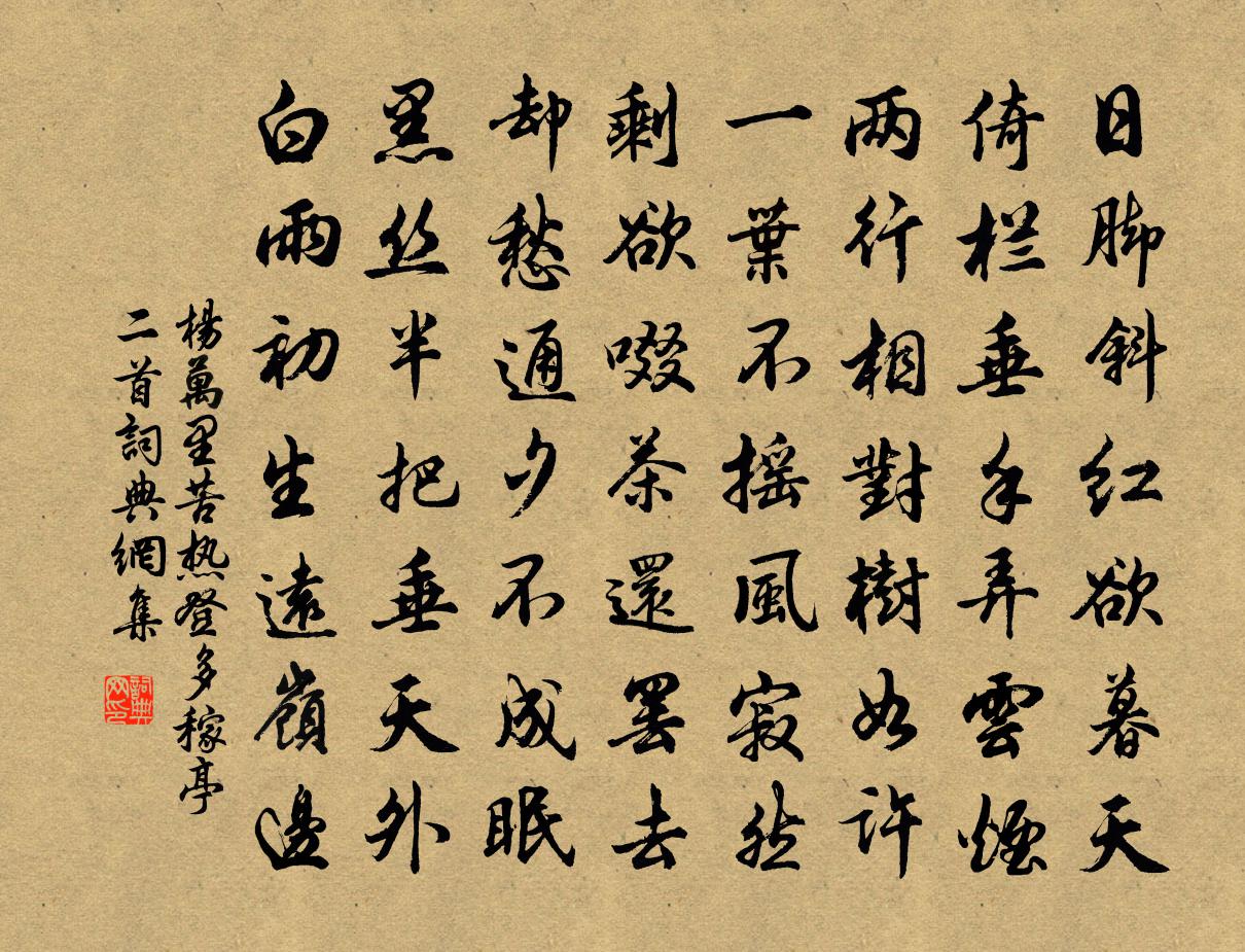 日腳斜紅欲暮天,倚欄垂手弄雲煙。兩行相對樹如許,一葉不搖風寂然。