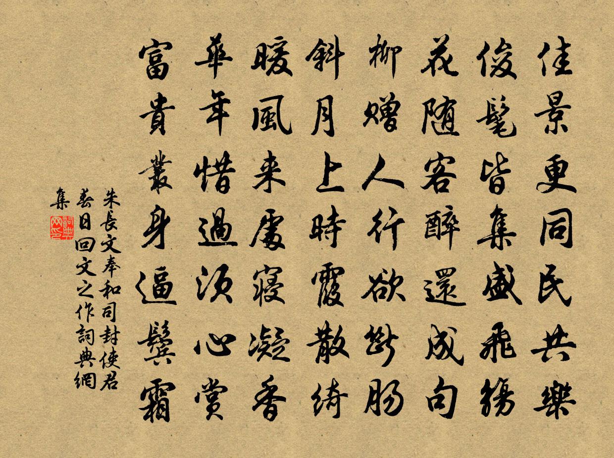 詩詞名句歷史字典書法欣賞書法字典國語詞典說文解字康熙字典古漢語字典標 題 作 者 詩 句 奉和司封使君春日回文之作作者:朱長文 朝代:唐代奉和司封使君春日回文之作原文佳景更同民共樂,俊髦皆集盛飛觴。花隨客醉還成句,柳贈人行欲斷腸。斜月上時霞散綺,暖風來處寢凝香。華年惜過須心賞,富貴叢身逼鬢霜。詩詞問答問:奉和司封使君春日回文之作的作者是誰?答:朱長文問:奉和司封使君春日回文之作寫於哪個朝代?答:唐代朱長文奉和司封使君春日回文之作書法欣賞奉和司封使君春日回文之作書法作品詩詞推薦和高僕射罷節度讓尚書授少保分司喜遂游山水之作白居易〔唐代〕暫辭八座罷雙旌,便作登山臨水行。能以忠貞酬重任,不將富貴礙高情。朱門出去簪纓從,絳帳歸來歌吹迎。鞍轡淨光山四首宿覺庵徐璣〔宋代〕欲間庵中事,無論後與先。還因一宿覺,不用再參禪。門遠青山曲,檐依古木邊。誰當秋夜靜,來看月孤圓。西江月(十一)張伯端〔宋代〕我見時人說性,只誇口急酬機。及逢境界轉痴迷。又與愚人何異。說得便須行得,方名言行無虧。能將慧劍斬魔魑次韻致政華殿丞懷舊見寄蘇頌〔宋代〕佩韘相從四紀前,鯉庭論契荷忘年。文如潘陸傾江海,學造重黎絕地天。簪紱棄來名已厭,鄉閭歸後樂應全。冥飛次韻閻仲甫郎中病起二首一晁補之〔宋代〕伏波七十老鍪弧,薏苡何曾適病軀。高臥輸公無一事,評詩校畫是功夫。松江楊友夔〔宋代〕落日滿大江,孤舟猶獨行。蒹葭交相風,中有肅殺聲。適從城中來,始覺秋氣清。世路若迫隘,江湖自寬宏。平生雜興李嘉祐〔唐代〕花間昔日黃鸝囀,妾向青樓已生怨。花落黃鸝不復來,妾老君心亦應變。君心比妾心,妾意舊來深。一別十年無尺減字木蘭花(預作菊詞,俾歌之,至時以侑酒)李處全〔宋代〕今年菊早。想到重陽花正好。玉冷金寒。全似東籬挹露看。色莊香重。直與梅花堪伯仲。待喚淵明。三友相從蓋為苕溪雜興四首蘇泂〔宋代〕筆判虛空也太奇,古今天下幾多詩。虛空判了元無盡,信手拈來自不知。送春強至〔宋代〕年年不會春來處,疑自深紅嫩白間。今日卻從何處去,明年依舊待君還。不堪眼見鶯花老,安得心同木石頑。身外徐敬甫出示所居之別南岩圖並壙公題詠欲予同陳文蔚〔宋代〕憶昔同作康山游,杖屨歷遍千岩幽。知君已個看山眼,每遇勝處嘗淹留。從茲一去間何闊,倒指殆欲忘春秋。不知送客既歸,晚登清心閣楊萬里〔宋代〕誰不知儂懶,其如送客何?葉聲和雨細,山色上樓多。出處俱為累,升沉盡聽他。疏鍾暮相答,也鮮說愁麽。暮春被病感書強至〔宋代〕孤直難知己,才華反誤身。流年銷壯節,多病對殘春。酒到心如達,花空眼亦貧。賢愚通塞理,誰與問洪鈞。喜雨虞儔〔宋代〕梅雨知時節,農家喜若何。積薪蠶下箔,鋤水稻分窠。綠有筍成竹,黃無麥作蛾。一春嘗苦旱,三日未雲多。送錢生曾鞏〔宋代〕天下學校廢,師生無所依。子來滿橐書,璨璨璧與璣。一字未得讀,叩門忽言歸。憐子甚有志,事時與子違。吾無龜堂避暑陸游〔宋代〕縹緲紗幮覆象床,蠻童擎粥進黃粱。硯池湛湛一泓墨,衣焙霏霏半篆香。團扇題詩無滯思,清泉灑地有餘涼。更須用韻送倪教授千里項安世〔宋代〕吟罷隨州路口詩,先生書劍此東之。邊城它日無斯士,病叟中年惜所知。出處如今方永隔,逢迎何處是前期。故人南鄉子呂渭老〔宋代〕小雨阻行舟。人在煙林古渡頭。欲挈一尊相就醉,無由。誰見橫波入鬢流。百計不遲留。明月他時獨上樓。水盡又雜歌謠辭。蘇小小歌溫庭筠〔唐代〕買蓮莫破券,買酒莫解金。酒里春容抱離恨,水中蓮子懷芳心。吳公女兒腰似束,家在錢塘小江曲。一自檀郎逐便席上有唱歐公送劉原甫辭者次日又有唱東坡三晁說之〔宋代〕龍門不見鬢垂絲,莫唱平山楊柳辭。縱使前聲君忍聽,後聲惱殺木腸兒。名句推薦不戚戚於貧賤,不汲汲於富貴。陶淵明《五柳先生傳》 龜游蓮葉上,鳥宿蘆花里。李白《姑孰十詠》 月色穿簾風入竹,倚屏雙黛愁時。顧敻《臨江仙·月色穿簾風入竹》 憶君遙在瀟湘月,愁聽清猿夢裡長。王昌齡《送魏二》 能近取譬,可謂仁之方也已。孔子弟子《論語·雍也篇》 山不厭高,海不厭深曹操《短歌行》 奈南牆冷落,竹煙槐雨。吳文英《惜秋華·七夕前一日送人歸鹽官》 貧而無諂,富而無驕孔子弟子《論語·學而篇》 當年燕子知何處,但苔深韋曲,草暗斜川。張炎《高陽台·西湖春感》 一時勸人以口,百世勸人以書。袁黃《了凡四訓·積善之方》