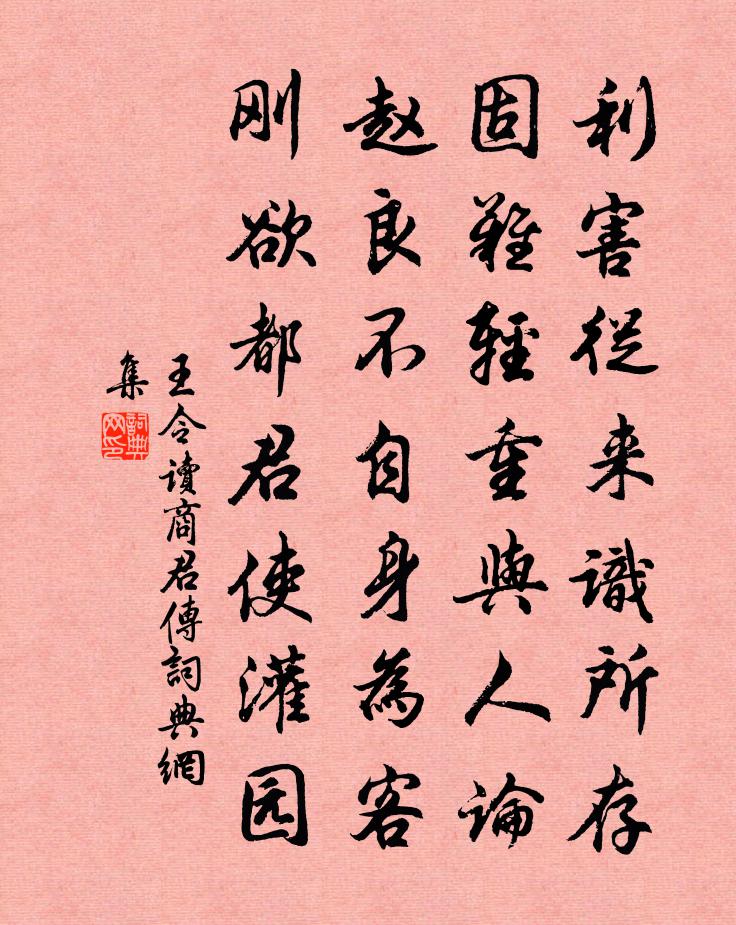 詩詞名句歷史字典書法欣賞書法字典國語詞典說文解字康熙字典古漢語字典標 題 作 者 詩 句 讀商君傳作者:王令 朝代:宋代讀商君傳原文利害從來識所存,固難輕重與人論。趙良不自身為客,剛欲都君使灌園。詩詞問答問:讀商君傳的作者是誰?答:王令問:讀商君傳寫於哪個朝代?答:宋代王令讀商君傳書法欣賞讀商君傳書法作品詩詞推薦大覺禪師祖雍長老請釋原妙〔宋代〕中大仰毒,奮師子威。平生負重病,舉世無良醫。向蓮峰插一莖草,為少室發千鈞機。舌頭無骨,額下生眉。喚作次韻和龍圖何學士以榮憩鄉州有感舊見存之作宋庠〔宋代〕昔歲西都餞使旗,今茲何幸復相依。潁川士族占星聚,遼海鄉人看鶴歸。乘塞惠風消戰略,論文精辯破談圍。衰瓮賦成中丞臨川侍郎西園雜題十首射堋宋祁〔宋代〕棲鵠雲侯迥勢開,主人留客侑金罍。欲知謝尚風流極,賭得將軍鼓吹來。鄧正字宅見劉明復所畫麓山秋景張舜民〔宋代〕洛陽才子見長沙,自識中丹鬢未華。文武才全皆不試,丹青筆妙更誰加。老杉列在堂皇上,小景將歸學士家。我有莊器之賢能良居鏡湖上作吾亦愛吾廬六詩見張鎡〔宋代〕吾亦愛吾廬,門前賣時蔬。滿擔風露香,選擇未始無。蘇子覓二頃,楊翁營一區。兩者況見成,自顧慚晨晡。不妨秋池獨泛白居易〔唐代〕蕭疏秋竹籬,清淺秋風池。一雙短舫艇,一張斑鹿皮。皮上有野叟,手中持酒卮。半酣箕踞坐,自問身為誰。嚴子宮詞一百首岳珂〔宋代〕上黨王師未凱旋,鸞旗黃鉞正行邊。紅塵一騎傳天使,為送宮中則劇錢。寄朱元弼王令〔宋代〕春城春雨綠春潭,冉冉歸舟上去帆。愛子有詩留我別,悔予無酒僯君銜。東風隨卷行人袖,落日猶明去客衫。好有題興善寺後池盧綸〔唐代〕隔窗棲白鶴,似與鏡湖鄰。月照何年樹,花逢幾遍人。岸莎青有路,苔徑綠無塵。永願容依止,僧中老此身。偈公六十五首釋鹹傑〔宋代〕今朝三月十五,天色半晴半雨。十分春色在枝頭,滿眼覷見沒可睹。報諸人,草莽鹵,甜瓜徹蒂甜菜,苦瓠連根苦招隱二首陳傅良〔宋代〕將子無登山,山上岡復岡。朝為朱陽煒,暮作陰飈涼。磴滑幽鳥啼,林深山鬼翔。子兮何所求,樂此魑魅鄉。國人送徐正時歸浦城曹勛〔宋代〕徐子志義士,觸熱如探湯。遠從南浦來,訪我存與亡。語兼瓊瑤溫,氣回蘭蕙芳。炎雲正爍石,懷抱為清涼。顧予行軍九日思長安故園岑參〔唐代〕強欲登高去,無人送酒來。遙憐故園菊,應傍戰場開。西山晚景王周〔唐代〕公局長清淡,池亭晚景中。蔗竿閒倚碧,蓮朵靜淹紅。半引彎彎月,微生飋飋風。無思復無慮,此味幾人同。點絳唇·寄南海梁藥亭納蘭性德〔清代〕一帽征塵,留君不住從君去。片帆何處,南浦沈香雨。回首風流,紫竹村邊住。孤鴻語,三生定許,可是梁鴻侶?閒遊(一作題山寺僧院)張籍〔唐代〕終日不離塵土間,若為能見此身閒。今朝暫共游僧語,更恨趨時別舊山。端午五言三首劉克莊〔宋代〕士女匆匆散,溪山寂寂然。龍舟閒似我,閣起向沙邊。夜雨寄北李商隱〔唐代〕君問歸期未有期,巴山夜雨漲秋池。何當共剪西窗燭,卻話巴山夜雨時。出承天院候客李復〔宋代〕曉動人語喧,門開探騎發。冠蓋相後先,煙塵互明滅。出城寒寺靜,蒼松帶餘雪。驅馬傍前廡,投鞭坐僧榻。畏風挽鄭禹功曾幾〔宋代〕鄭公高義絕陳雷,別我姑胥首重回。書跡橫斜良足喜,訃音曲折可勝哀。定知泡影垂垂盡,故傍江湖得得來。俗眼名句推薦思君如滿月,夜夜減清輝。張九齡《賦得自君之出矣》 烈士暮年,壯心不已。曹操《龜雖壽》 山不在高,有仙則名水不在深,有龍則靈劉禹錫《陋室銘》 善處事者,但就是非可否,審定章程,而不必利於己。王永彬《圍爐夜話·第九則》 倚高寒、愁生故國,氣吞驕虜。張元乾《賀新郎·寄李伯紀丞相》 一去無訊息,那能惜馬蹄。薛道衡《昔昔鹽》 見人善,即思齊。縱去遠,以漸躋。李毓秀《弟子規·信》 西宮南內多秋草,落葉滿階紅不掃。白居易《長恨歌》 春朝物候妍,愁婦鏡台前。鄭愔《春怨》 事不三思終有悔,人能百忍自無憂。馮夢龍《醒世恆言·卷三十四》