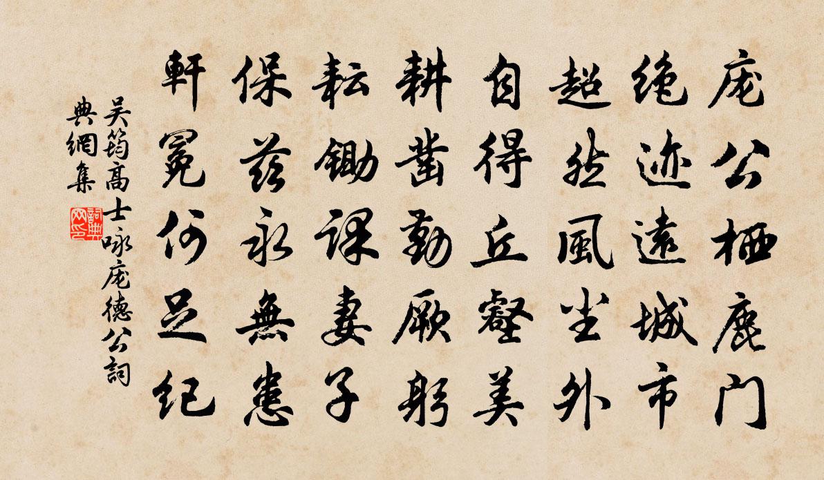詩詞名句歷史字典書法欣賞書法字典國語詞典說文解字康熙字典古漢語字典標 題 作 者 詩 句 高士詠龐德公作者:吳筠 朝代:唐代高士詠龐德公原文龐公棲鹿門,絕跡遠城市。超然風塵外,自得丘壑美。耕鑿勤厥躬,耘鋤課妻子。保茲永無患,軒冕何足紀。詩詞問答問:高士詠龐德公的作者是誰?答:吳筠問:高士詠龐德公寫於哪個朝代?答:唐代吳筠高士詠龐德公書法欣賞高士詠龐德公書法作品注釋全唐詩:卷853-61詩詞推薦奔亡道中其五李白〔唐代〕淼淼望湖水。青青蘆葉齊。歸心落何處。日沒大江西。歇馬傍春草。欲行遠道迷。誰忍子規鳥。連聲向我啼。寨兒令·次韻懷古張可久〔元代〕寫舊遊,換新愁,玉簫寒酒醒江上樓。黃鶴磯頭,白鷺汀洲,煙水共悠悠。人何在七國春秋,浪淘盡千古風流。隋惠性上人釋祖欽〔宋代〕惠性忽通,差別無礙。七縱八橫,得大自在。向微塵晨轉渾身,影落五湖雲水外。問時人,會不會。明白一句子,聞五月八日宸翰口號十首劉克莊〔宋代〕叩墀還笏今三閏,誓墓垂車又五春。賴有兩 * 圓鏡,當空照見戴盆人。攀楊枝佚名〔南北朝〕自從別君來,不復著綾羅。畫眉不注口,施朱當奈何?紹興祀岳鎮海瀆四十三首佚名〔宋代〕肅肅其父,既旨既溢。迨其畢酌,偏茲博碩。祀事既遂,不敢誶射。神或醉止,我心斯怪。北邙山沈佺期〔唐代〕北邙山上列墳塋,萬古千秋對洛城。城中日夕歌鐘起,山上唯聞松柏聲。句錢惟演〔宋代〕廳前捉到須依法,合內盛來定付廚。秋詞劉禹錫〔唐代〕自古逢秋悲寂寥,我言秋日勝春朝。晴空一鶴排雲上,便引詩情到碧宵。和李校書新題樂府十二首蠻子朝元稹〔唐代〕西南六詔有遺種,僻在荒陬路尋壅。部落支離君長賤,比諸夷狄為幽冗。犬戎強盛頻侵削,降有憤心戰無勇。夜防大哉楊簡〔宋代〕大哉孔聖之言,哀樂相生不可見,傾耳聽之不可聞。不見乃真見,不聞乃真聞。子夏雖曰敢不承,實莫之承終於昏誕日戲作亦可以瑞鷓鴣歌之姜特立〔宋代〕梅山誕日簇觥籌,更挾娉婷共勝游。此去只求閒富貴,人生須是老風流。偈傾一百三十三首釋法薰〔宋代〕悉達今朝出母胎,無端滿目是塵埃。山僧傾倒西湖水,索性從頭回洗回。江上送韋彖先輩杜荀鶴〔唐代〕不易為離抱,江天即見鴻。暮帆何處落,涼月與誰同?木葉新霜後,漁燈夜浪中。時難慎行止,吾道利於窮。古人名詩權德輿〔唐代〕藩宣秉戎寄,衡石崇勢位。年紀信不留,弛張良自愧。樵蘇則為愜,瓜李斯可畏。不顧榮官尊,每陳豐畝利。家林早春夙興宋祁〔宋代〕曉參橫沒月沉煙,寺鼓軍刀隱隱連。初暖欲歸池中地,剩寒猶屬隴梅天。遙帷曙氣春篝燭,病榻邪風襲貢綿。猶意呈潘文叔二首趙蕃〔宋代〕寓舍莓苔合,春郊花草香。忽逢寧比料,欲語未能長。大阮為勿藥,阿連欣對床。嗟予重多感,有弟各殊方。和王維三首胡寅〔宋代〕蓬門相直是南山,傍著丹梯尚可攀。野興舊同流水遠,道心今共白雲閒。梅花喜神譜蓓蕾四枝宋伯仁〔宋代〕南枝發岐穎,崆峒占幾登。當思漢光開,一飯能中興。湖州貢焙新茶張文規〔唐代〕鳳輦尋春半醉回,仙娥進水御簾開。牡丹花笑金鈿動,傳奏吳興紫筍來。名句推薦夫輕諾必寡信,多易必多難。老子《老子·德經·第六十三章》 攜手藕花湖上路。一霎黃梅細雨。朱淑真《清平樂·夏日游湖》 遷客此時徒極目,長洲孤月向誰明。李白《鸚鵡洲》 貧士之腸習黎莧,富人之口厭膏梁。程登吉《幼學瓊林·卷三·貧富》 好問則裕,自用則小。佚名《尚書正義·卷八·仲虺之誥》 傷心千古,秦淮一片明月!薩都剌《念奴嬌·登石頭城次東坡韻》 夜中不能寐,起坐彈鳴琴。阮籍《詠懷八十二首·其一》 山邊幽谷水邊村,曾被疏花斷客魂。張嵲《墨梅》 余亦赴京國,何當獻凱還。孟浩然《送陳七赴西軍》 荷葉出地尋丈,因列坐其下,上不見日。姜夔《念奴嬌·鬧紅一舸》