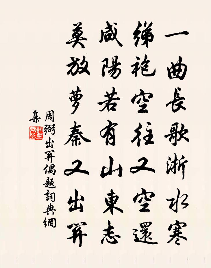 詩詞名句歷史字典書法欣賞書法字典國語詞典說文解字康熙字典古漢語字典標 題 作 者 詩 句 出關偶題作者:周弼 朝代:宋代出關偶題原文一曲長歌浙水寒,綈袍空往又空還。鹹陽若有山東志,莫放蘿秦又出關。詩詞問答問:出關偶題的作者是誰?答:周弼問:出關偶題寫於哪個朝代?答:宋代周弼出關偶題書法欣賞出關偶題書法作品詩詞推薦同陳提舉庸郭安撫晞宗玩月南峰張次賢〔宋代〕山中有佳客,山上月增明。廊廟心同赤,江湖夢獨清。半庭業樹影,萬籟淡秋聲。把手情何極,呼童問麴生。官莊池觀競渡儲光羲〔唐代〕落日 * 管,清池發棹歌。船爭先後渡,岸激去來波。水葉藏魚鳥,林花間綺羅。踟躕仙女處,猶似望天河。自君之出矣文同〔宋代〕自君之出矣,弔影度晨夕。中門一步地,未省有行跡。閨闈足儀檢,常恐犯繩尺。欲寄錦字書,知誰者雲的。水調歌頭佚名〔宋代〕直節傲山雪,偃畫詠松風。天香真色來報,春信月明中。六七日分景緯,五百年間英氣,相值產維崧。君子中庸也送顏□之清漳六言三首劉克莊〔宋代〕清漳古佛竺國,尚書令魯郡公。始信十年夜讀,不如明月春風。將有東陽之行宗哲為具話別以詩見招因答來貺強至〔宋代〕秋高山城幽,風動林葉吼。百感從中來,將分故人手。故人惜輕別,樽酒欲相厚。未飲已頹然,別恨濃於酒。七夕二首·其二德容〔唐代〕織女牽牛送夕陽,臨看不覺鵲橋長。最傷今夜離愁曲,遙對天涯愈斷腸。送杓孫隨侍上虞樓鑰〔宋代〕阿斗生來十五年,未曾一日去翁前。聞詩勿廢家庭問,習吏仍求城旦篇。婚宦有涯真是幸,巾箱所蓄要相傳。榮罍溪山堂次韻韓元吉〔宋代〕溪岸人家高下居,繞溪雲樹雜煙蕪。故應曲水傳佳句,還喜青松入畫圖。殘燈釋文珦〔宋代〕殘燈閃閃青,蟋蟀怨空庭。骨老似難睡,夢寒還易醒。淒涼生倦枕,沆瀣入疏欞。起視東方白,唯餘三兩星。秋晚雜書三十首方回〔宋代〕吾年志學初,故已嗜為詩。三霜當六十,無復一黑髭。生事置墮甑,世故愕敗棋。獨喜五柳作,時時一喔之。□□淑人生日口占林亦之〔宋代〕方朔曾為老侍郎, * 來降紫雲香。壽杯今日逢長至,款款長年此日長。偈頌一百零二首釋紹曇〔宋代〕祝融峰,萬年松。翠陰籠鶴,瑞所蟠龍。用獻聖明天子壽,枝枝葉葉自春風。送王平甫擬離騷梅堯臣〔宋代〕識君兮不早,君尚少兮我老。蘭與蕙兮多薰,搴雜佩兮芳芬。蘭倏往兮蕙隨,心俯仰兮徘徊。與識吳兮吳樂,嘗適送鄭洙赴舉陳襄〔宋代〕天上奎星專主文,地下嵩獲惟降神。含靈孕粹五百載,挺然間出非常人。滎陽才子東山客,滿腹精神太英特。掞天湖州歌九十八首 其八十五汪元量〔宋代〕客中忽忽又重陽,滿酌葡萄當菊觴。謝後已叨新聖旨,謝家田土免輸糧。泛湖十絕句陳造〔宋代〕銀筆曾煩贊此君,即今墨色儼如新。因君細數登龍日,十九年前入幕賓。讀衛青傅劉宰〔宋代〕任俠行權世所誅,將軍尚借齒牙餘。古來名將勤招選,底事牢辭不敢居。龍泉東下卻寄孫員外羅隱〔唐代〕縠江東下幾多程,每泊孤舟即有情。山色已隨遊子遠,水紋猶認主人清。恩如海岳何時報,恨似煙花觸處生。百尺長相思(五之二)陸游〔宋代〕橋如虹。水如空。一葉飄然煙雨中。天教稱放翁。側船篷。使江風。蟹舍參差漁市東。到時聞暮鍾。名句推薦看蓬門秋草,年年破巷,疏窗細雨,夜夜孤燈。鄭燮《沁園春·恨》 林中有奇鳥,自言是鳳凰。阮籍《詠懷八十二首·其七十九》 萬里悲秋常作客,百年多病獨登台。杜甫《登高》 烈士暮年,壯心不已。曹操《龜雖壽》 河橋送人處,涼夜何其。周邦彥《夜飛鵲·河橋送人處》 還始覺、留情緣眼,寬頻因春。吳文英《渡江雲三犯·西湖清明》 春來遍是桃花水,不辨仙源何處尋。王維《桃源行》 金甌已缺總須補,為國犧牲敢惜身!秋瑾《鷓鴣天·祖國沉淪感不禁》 惟有兩行低雁,知人倚、畫樓月。范成大《霜天曉角·梅》 綠蓑江上秋聞笛,紅袖樓頭夜倚欄。曹雪芹《香菱詠月·其三》