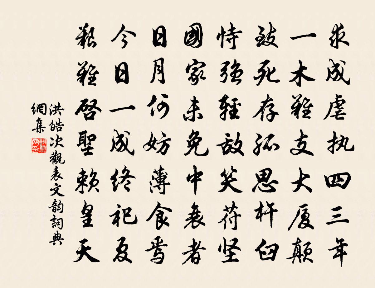 詩詞名句歷史字典書法欣賞書法字典國語詞典說文解字康熙字典古漢語字典標 題 作 者 詩 句 次觀表文韻作者:洪皓 朝代:宋代次觀表文韻原文求成虐執四三年,一木難支大廈顛。致死存孤思杵臼,恃強輕敵笑苻堅。國家未免中衰者,日月何妨薄食焉。今日一成終祀夏,艱難啟聖賴皇天。詩詞問答問:次觀表文韻的作者是誰?答:洪皓問:次觀表文韻寫於哪個朝代?答:宋代洪皓次觀表文韻書法欣賞次觀表文韻書法作品詩詞推薦東湖新竹陸游〔宋代〕插棘編籬謹護持,養成寒碧映淪漪。清風掠地秋先到,赤日行天午不知。解籜時聞聲簌簌,放梢初見葉離離。官閒圓書記之錢唐釋智愚〔宋代〕誰管點魚上竹竿,拚身捱得髑髏乾。者回歸去西湖上,犢草鷗波不亂看。拈古十四首釋法薰〔宋代〕南山不會禪,一向外邊走。臘月三十日,舌頭不出口。灃上與幼遐月夜登西岡玩花韋應物〔唐代〕置酒臨高隅,佳人自城闕。已玩滿川花,還看滿川月。花月方浩然,賞心何由歇。謝王粹中惠白鶴山麟川觀斑竹杖並竹輿樓鑰〔宋代〕麟川仙館翠琅玕,荷子攜來白鶴山。未效葛陂龍種化,絕勝湘浦淚痕斑。裁為拄杖一尋許,巧作輕輿四尺慳。兒子病中散步六絕岳珂〔宋代〕一年無病緣官事,一病兼旬為燕居。自是素餐天所厭,可能豎子解乘除。【正宮】塞鴻秋鄭光祖〔元代〕門前五柳江侵路,莊兒緊靠白苹渡。除彭澤縣令無心做,淵明老子達時務。頻將濁酒沽,識破興亡數,醉時節笑捻酬孟十二新居見寄陸長源〔唐代〕大道本夷曠,高情亦沖虛。因隨白雲意,偶逐青蘿居。青蘿紛蒙密,四序無慘舒。餘清濯子襟,散彩還吾廬。去歲喜雨行張嵲〔宋代〕歲星運行至荒落,鶉尾初占建魁杓。大旱金石皆流爍,旱魃何知恣為虐。大田多稼三百廛,儘是農夫耦十千。一朝八月十四日攜家泛月次韻樓鑰〔宋代〕草草真成一段奇,比鄰非不借餘輝。板輿何敢侵風露,略望檐間且勸歸。訪趙愚齋不遇謁者雲入幕抵晚方歸因成一絕奉樂雷發〔宋代〕雪片梅花滿硯池,芙蓉幕里客歸遲。今朝解了公家事,盡聽轅門報酉時。聞滁陽失守憶表兄周端臣〔宋代〕猶憶歸淮甸,何期陷敵塵。祗聞殘破慘,未得死生真。夢不諳長路,書難附便人。吞聲無限淚,一滴一傷神。憶蜀陸游〔宋代〕憶昔西遊日,岷峨勝事繁。題詩古柏廟,載酒海棠園。世故紛難料,年光浩莫論。所欣身尚健,短褐醉江村。【越調】柳營曲 金陵故址查德卿〔元代〕臨故國,認殘碑,傷心六朝如逝水。物換星移,城是人非,今古一枰棋。南柯夢一覺初回,北邙墳三尺荒堆。四圍會稽頌越王諸葛興〔宋代〕睇禹陵兮巋然,邃珍館兮蟺蜎。敞別室兮遺象,崇英霸兮千年。諗越民兮非黷祀,推世家兮自遷史。肇無餘兮開國菩薩蠻朱敦儒〔宋代〕芙蓉紅落秋風急。夜寒紙帳霜華濕。枕畔木瓜香。曉來清興長。輕舟青箬笠。短棹溪光碧。去覓謝三郎。蘆花何處頌古十首釋曇華〔宋代〕背眾吃油糍,對人夸好手。潦倒不識羞,抵死揚家醜。和青溪山行衛宗武〔宋代〕北崦共幽尋,森森萬綠新。柳陰停雨棹,柏逕岸風巾。幸有寬閒野,堪娛老病身。只憐人事異,滄海亦揚塵。四皓廟李商隱〔唐代〕本為留侯慕赤松,漢庭方識紫芝翁。蕭何只解追韓信,豈得虛當第一功。游灞陵山嚴維〔唐代〕入山未盡意,勝跡聊獨尋。方士去在昔,藥堂留至今。四隅白雲閒,一路清溪深。芳秀愜春目,高閒宜遠心。潭分名句推薦京國多年情盡改,忽聽春雨憶江南。虞集《聽雨》 疏林紅葉,芙蓉將謝,天然妝點秋屏列。薛昂夫《西湖雜詠·秋》 過盡征鴻來盡燕,故園訊息茫然。趙長卿《臨江仙·暮春》 記得短亭歸馬,暮衙蜂鬧。吳文英《天香·蠟梅》 樓前柳,憔悴幾秋風。賀鑄《小重山·花院深疑無路通》 小雨纖纖風細細,萬家楊柳青煙里。朱服《漁家傲·小雨纖纖風細細》 誠之者,擇善而固執之者也。子思《中庸·第二十章》 前村深雪裡,昨夜一枝開。齊己《早梅》 盡教春思亂如雲,莫管世情輕似絮晏幾道《玉樓春·雕鞍好為鶯花住》 恩威同施,才德相較,苟無功,得無天耶?來俊臣《羅織經·治下卷第三》