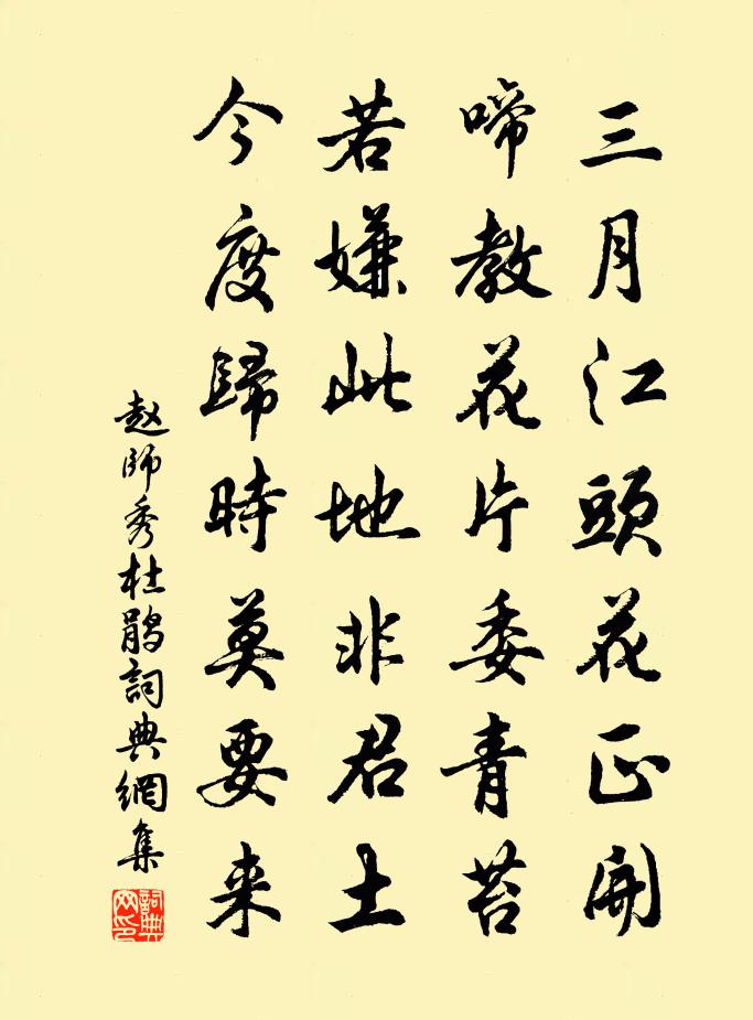 詩詞名句歷史字典書法欣賞書法字典國語詞典說文解字康熙字典古漢語字典標 題 作 者 詩 句 杜鵑作者:趙師秀 朝代:宋代杜鵑原文三月江頭花正開,啼教花片委青苔。若嫌此地非君土,今度歸時莫要來。詩詞問答問:杜鵑的作者是誰?答:趙師秀問:杜鵑寫於哪個朝代?答:宋代趙師秀杜鵑書法欣賞杜鵑書法作品詩詞推薦記正月二十五日西湖之游十五首方回〔宋代〕千山斫入亞夫營,佳墅名園怕近城。賴是白公資佛力,小留蒼翠作秋聲。簡樊謙齋陳茝〔宋代〕一疏闢人千,孤忠殊可賢。丈夫不至此,君子有加焉。事濟民生福,言違臣職愆。還須謄諫草,痛哭九重前。贈數學蕭吉卿方回〔宋代〕蓍草占周易,君從簡處尋。運籌見奇偶,落筆判升沉。總悟生時數,誰萌分外心。吾衰今七十,惟有死山林。句王度〔宋代〕雅分供餘食,鴿亂著殘棋。示強甫劉克莊〔宋代〕昔受浮丘伯密傳,駸駸轅固伏生年。試橫牧笛花間飲,勝著朝冠柏下眠。天上錦袍曾奪得,山中石硯又磨穿。生來遇薛明府謁聰上人 [一作孟浩然詩。]王昌齡〔唐代〕欣逢柏梁故,共謁聰公禪。石室無人到,繩床見虎眠。陰崖常抱雪,枯澗為生泉。出處雖雲異,同歡在法筵。冬日李復〔宋代〕日出東南隅,轉側下西陸。不經中天行,但驚六龍速。愁寒余月陰,雲重欲壓屋。霰雪飛不斷,凝冰介萬木。怒風送宋慎言姚合〔唐代〕童稚便知聞,如今只有君。百篇詩盡和,一盞酒須分。驛路多連水,州城半在雲。離情同落葉,向晚更紛紛。題南康歸宗寺陳宓〔宋代〕山陰逸氣追千古,不但揮毫一段奇。到此風流故無恙,遊人休問舊來池。醉眠亭三首韓宗文〔宋代〕昔有遺賢世所憐,滄浪亭下醉時眠。松江變酒終難待,卻對殘燈理短編。回至興國宮望天池一簇雲氣中因楊道士留有賦董嗣杲〔宋代〕迎面蒼巒潑黛濃,幾番回首想行蹤。白雲擁海文殊閣,老水屯煙聖治峰。方別衲僧談夢寐,又逢羽士接從容。明朝冬節後至丞相第詣世子車中作沈約〔南北朝〕廉公失權勢,門館有虛盈。貴賤猶如此,況乃曲池平。高車塵未滅,珠履故餘聲。賓階綠錢滿,客位紫苔生。誰當度周卿之母蹇太宜人輓詩魏了翁〔宋代〕八十三年雪檜身,直將簪珥當冠巾。生兒須擬范孟博,論士亦知程伯醇。在約能令家有塾,居閒肯使食無賓。世間和同潤卿寒夜訪襲美各惜其志次韻陸龜蒙〔唐代〕醉韻飄飄不可親,掉頭吟側華陽巾。如能跂腳南窗下,便是羲皇世上人。讀前集二首鄭谷〔唐代〕殷璠裁鑒英靈集,頗覺同才得旨深。何事後來高仲武,品題間氣未公心。風騷如線不勝悲,國步多艱即此時。愛日雪中懷水雲館晁說之〔宋代〕六出花頭萬疊波,水雲館前不肯過。玉鸞素麵如相語,人間清興今如何。獻帥府經歷二首李申之〔宋代〕擬把孤忠報主知,主知未報已身疲。明朝定作長淮鬼,馬革應煩為裹屍。栽松道者贊釋智遇〔宋代〕鬱郁冰壑姿,株株手親植。欲知來去蹤,雙峰從寒碧。南陵留別段氏兄弟許渾〔唐代〕不知身老大,猶似舊時狂。為酒游山縣,留詩遍草堂。歸期秋未盡,離恨日偏長。更羨君兄弟,參差雁一行。念奴嬌(端午酒邊)陳著〔宋代〕雨簾高卷,見榴花、應怪風流人老。是則年年佳節在,無奈閒心悄悄。巧扇風輕,香羅雪濕,夢裡曾看了。如今溪名句推薦何處秋風至?蕭蕭送雁群。劉禹錫《秋風引》 敗荷零落,衰楊掩映,岸邊兩兩三三,浣沙游女。柳永《夜半樂·凍雲黯淡天氣》 侵夜鸞開鏡,迎冬雉獻裘。李商隱《陳後宮》 為君憔悴盡,百花時。溫庭筠《南歌子·倭墮低梳髻》 西湖到日,重見梅鈿皺。吳文英《瑞龍吟·送梅津》 一寸光陰一寸金,寸金難買寸光陰。佚名《增廣賢文·上集》 嗚呼!楚雖三戶能亡秦,豈有堂堂中國空無人!陸游《金錯刀行》 暖雨晴風初破凍,柳眼梅腮,已覺春心動。李清照《蝶戀花·暖雨晴風初破凍》 更無柳絮因風起,惟有葵花向日傾。司馬光《客中初夏》 田夫荷鋤至,相見語依依。王維《渭川田家》