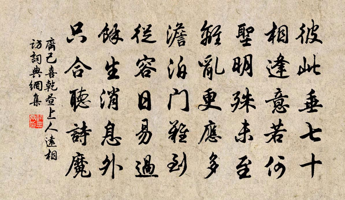 詩詞名句歷史字典書法欣賞書法字典國語詞典說文解字康熙字典古漢語字典標 題 作 者 詩 句 喜乾晝上人遠相訪作者:齊己 朝代:唐代喜乾晝上人遠相訪原文彼此垂七十,相逢意若何。聖明殊未至,離亂更應多。澹泊門難到,從容日易過。餘生訊息外,只合聽詩魔。詩詞問答問:喜乾晝上人遠相訪的作者是誰?答:齊己問:喜乾晝上人遠相訪寫於哪個朝代?答:唐代問:齊己的名句有哪些?答:齊己名句大全齊己喜乾晝上人遠相訪書法欣賞喜乾晝上人遠相訪書法作品注釋全唐詩:卷839-79詩詞推薦舟中雜紀 其九王冕〔元代〕野水連天碧,秋花夾路黃。順風船過疾,落日鳥飛忙。感物獨惆悵,逢時喜老蒼。文章隨氣運,不必論班揚。蕭五監丞新作堂成名曰知雄且賦彫章題之屋壁祖無擇〔宋代〕況堂佳號塵游外,題壁新吟藻思春。樸素自持師老氏,清醒常戒鑒靈均,窮通一致由知命,恬智相須合入神。因覽太尉王公以九錫命大將軍讓公將還京邑祖餞贈陸雲〔魏晉〕悠悠征人。四牡騑騑。發軫北京。振策紫微。昔乃雲來。春林方輝。歲亦暮止。之子言歸。道塗興戀。伏載稱徽。贈仙翁釋文珦〔宋代〕九曲溪連萬樹松,樹邊雲屋住仙翁。不曾說著人間事,日暮唯先閉鶴籠。龜峰精舍李覯〔宋代〕去縣二十里,路平時正春。四山唯有石,一寺更無塵。融結疑天意,經勞憶古人。但知安樂處,何必是金身。宮詞三十三首曹勛〔宋代〕拱北星辰靜守心,暫清警蹕鳳凰深。蕭條梅柳春如許,可復風煙比上林。送青陽李明府杜荀鶴〔唐代〕善政無慚色,吟歸似等閒。惟將六幅絹,寫得九華山。求理頭空白,離京債未還。仍聞猿與鶴,都在一船間。鷓鴣天佚名〔宋代〕雪屋冰床深閉門。縞衣應笑織成紋。雨中清淚無人見,月下幽香只自聞。長在眼,遠銷魂。玉奴那忍負東昏。隅然送昭亭李道士歸閩李彌遜〔宋代〕昭亭高隱倦淹留,歸馭飄然下士洲。我亦半生隨泛宅,故園空憶洞庭秋。贈學仙者王績〔唐代〕採藥層城遠,尋師海路賒。玉壺橫日月,金闕斷煙霞。仙人何處在,道士未還家。誰知彭澤意,更覓步兵那。春釀古宮詞十首劉克莊〔宋代〕君恩如紈扇,惟恐值秋風。方喜入懷裡,安知棄篋中。漁家傲(留別孫表材)史浩〔宋代〕春恨不禁聽杜宇。買舟忽覓東鄞路。一笑輕帆同野渡。頻回顧。吳山夜岫俱眉嫵。何事匆匆分袂去。夫君小隱臨煙泛瑞安江風濤貼然陸游〔宋代〕俯仰兩青空,舟行明鏡中。蓬萊定不遠,正要一颿風。東林寺夜宿董其昌〔明代〕偃息東林下,悠然澹旅情。泉歸虎溪靜,雲度雁天輕。蒼蘚封碑古,優曇應記生。預悉鐘鼓動,擾擾又晨征。過吳江次韻行父之作李彌遜〔宋代〕重來□□又成空,舊榜今無臥彩虹。故國平嗟□瓦礫,新亭猶見濕青紅。雁隨山遠情無□,□與天窮勢自通。盡道淳熙七年端午帖子詞皇后合六首崔敦詩〔宋代〕玉燕垂符小,珠囊結艾青。更將長命縷,侵曉奉慈庭。萬年歡(榮國生日)張綱〔宋代〕歲晚寒凝,正蓂舒四葉,梅吐孤芳。慶誕佳辰,開筵盛集萱堂。合坐春回錦繡,捲簾處、花簇笙簧。除樂禁、初許賦梅三篇曾豐〔宋代〕萬物叢中要獨行,榮枯不愛與時爭。翛翛水性雲情重,栩栩仙風道骨輕。飯顆一時工部瘦,首陽千古伯夷清。未言和彥立兄贈信上人王之道〔宋代〕鼎社年來得志閒,一杯聊復效逃禪。新詩莫漫驚流俗,恐被旁人喚皎然。和泉上人黃公度〔宋代〕芒鞋踏遍萬山松,得得歸來丈室中。破祴一身在懸罄,清談對客似撞鐘。名家要看驚人舉,覓句何須效我窮。春雨名句推薦故人在其下,塵土相豗蹴。蘇軾《送頓起》 霜天秋曉,正紫塞故壘,黃雲衰草。蔡挺《喜遷鶯·霜天秋曉》 他鄉生白髮,舊國見青山。司空曙《賊平後送人北歸》 對此懷素心,千里共明月德隱《新秋晚眺》 低頭弄蓮子,蓮子清如水佚名《雜曲歌辭·西洲曲》 他人有心,予忖度之。佚名《巧言》 黃鸝囀處誰同聽,白菊開時且剩過。司空圖《白菊雜書四首》 袨服華妝著處逢,六街燈火鬧兒童。元好問《京都元夕》 強自取柱,柔自取束。荀子《荀子·勸學》 桐葉晨飄蛩夜語。旅思秋光,黯黯長安路。陸游《蝶戀花·桐葉晨飄蛩夜語》