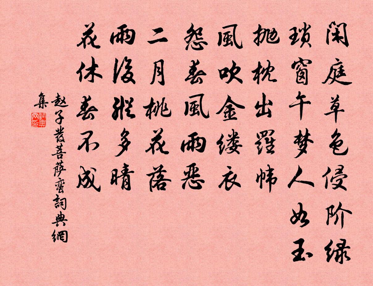 詩詞名句歷史字典書法欣賞書法字典國語詞典說文解字康熙字典古漢語字典標 題 作 者 詩 句 菩薩蠻作者:趙子發 朝代:宋代菩薩蠻原文閒庭草色侵階綠。瑣窗午夢人如玉。拋枕出羅幃。風吹金縷衣。怨春風雨惡。二月桃花落。雨後縱多晴。花休春不成。詩詞問答問:菩薩蠻的作者是誰?答:趙子發問:菩薩蠻寫於哪個朝代?答:宋代問:菩薩蠻是什麼體裁?答:詞趙子發菩薩蠻書法欣賞菩薩蠻書法作品詩詞推薦呈趙蘄州善扛趙蕃〔宋代〕雨合園林水滿地,黃鸝無語鷺頻窺。喔吟張日大自好,黜陟與時殊不知。北海定欣真識面,阿連還喜伴成詩。自從露華王沂孫〔宋代〕晚寒佇立,記鉛輕黛淺,初認冰魂。紺羅襯玉,猶凝茸唾香痕。淨洗妒春顏色,勝小紅、臨水湔裙。煙渡遠,應憐禪人並化主寫真求贊釋正覺〔宋代〕發雪毿毿,心老憨憨。指南話北,破二作三。守宗風之符節,握佛祖之鎚鉗。陶形鑄器模楷妙,迸火流金爐鞴炎。病中寄曾使君湖上曹勛〔宋代〕露曉紅幢綠蓋明,使君千騎會耆英。笙歌遞奏連雲上,荷芰傳香拂面清。遐想雅歡均四坐,欲尋幽夢下重成。負薪阻風呈趙史君三絕洪咨夔〔宋代〕遲速乘除轉晚飈,布帆快意定明朝。廬山試問高多少,欲望西川萬里橋。予以謬作數種並總所奏藁遺參贊高紫微聞以閱岳珂〔宋代〕夜半軍書尚帛鈴,想應欹枕夢難成。新涼頗復欺長夏,舊事何妨閱短檠。人說文衡真有托,公於詩卷若為評。復襄送承甫兄往長陽山從學詩項安世〔宋代〕正月已暖春無寒,江深水淺沙觜乾。東風日日送行客,我來踏遍江之乾。昨日送客東入浙,今日送客西入灣。旁人永嘉端午行葉適〔宋代〕行春瓶橋東峙岩瓶北,大舫瓶移家住無瓶隙。立瓶若羅銀價踴,冰衫雪袴胭脂勒。使君勸客親付標,兩朋予奪懸分悟黃梁王丹桂〔元代〕浮名浮利兩悠悠。終不道,把身囚。好貪多敗更多憂。又著個,甚來由。願人識破早抽頭。從前事,盡都休。飄飄登龍泉山陳造〔宋代〕越山東來萬煙鬟,餘姚為邑山四環。客車細穿市井間,邑屋更繞龍泉山。佛閣翬飛最高處,遠近嵐霏隨指顧。小留嘉泰二年題資州醮壇山星斗閣對是同王資州賈魏了翁〔宋代〕三十三年去復還,筍將重踏舊江山。青衿朋友子當戶。綠幘奚臧霜半鬟。贏得光陰歸鬢里,悔將聲譽落人間。聖六黃鶴樓崔顥〔唐代〕昔人已乘白雲去,此地空餘黃鶴樓。黃鶴一去不復返,白雲千載空悠悠。晴川歷歷漢陽樹,芳草萋萋鸚鵡洲。日暮答羅天驥劉克莊〔宋代〕乃祖曾吞鳳,郎君豈後身。頗聞精選理,何必慕唐人。玉麈王夷甫,烏絛呂洞賓。客談溪墅勝,終擬卜比鄰。馬當洑阻風,居人云︰非五日或七日風不止,范成大〔宋代〕拍岸回流逆上磯,枯楊折葦靜相依。趁墟漁子晨爭渡,賽廟商人晚醉歸。重九信來風未恐,大千行行昨俱非。羈愁冬至後五日約客晨往極樂精舍因尋梅湖山作詩張鎡〔宋代〕未若撩清興,騎驢故繞山。松篁高下處,雲日往來間。要是從今後,休教枉卻閒。烏巾風弄影,畫出我詩孱。黃功垂秘書嵐城閣文同〔宋代〕群峰繞高軒,四望如城密。晴嵐逼窗戶,淨若新洗熨。杳杳其中人,衣襟照寒碧。臨風設橫幾,蕭灑坐終日。門前書妙應庵壁張栻〔宋代〕窗前新竹淨娟娟,借我風涼一榻眠。試問莊周說鵬鷃,何如洙泗舉魚鳶。頌古十六首釋心月〔宋代〕朝西天,暮東土。翫水游山,徐行款步。是則不動道場,不是亦在里許。誰為證明,石霜角虎。詠史六首韓信樂雷發〔宋代〕愁看鐘室劈良弓,何不當時殺蒯能。今日真王成底事,只應娥姁是英雄。西山余靖〔宋代〕萬壑千岩斗物華,搘筇閒訪道生涯。一壇星斗修真館,數里雲煙斸藥家。魚戲竹溪寒影碎,路穿松塢翠陰斜。桃源名句推薦出家人莫說在家話。吳承恩《西遊記·第三十二回》 方舟安可極,離思故難任!曹植《雜詩六首·其一》 愚者暗於成事,知者見於未萌。民不可與慮始,而可與樂成。商鞅《商君書·更法》 夜長爭得薄情知,春初早被相思染。姜夔《踏莎行·自沔東來》 勸君終日酩酊醉,酒不到劉伶墳上土。李賀《將進酒》 一日官軍收海服,驅牛駕車食牛肉,歸來攸得牛兩角。元稹《田家詞 / 田家行》 小娃撐小艇,偷采白蓮回。白居易《池上》 酒債尋常行處有,人生七十古來稀。杜甫《曲江二首》 昔日橫波目,今成流淚泉。李白《長相思三首·其二》 銜霜當路發,映雪擬寒開。何遜《詠早梅 / 揚州法曹梅花盛開》